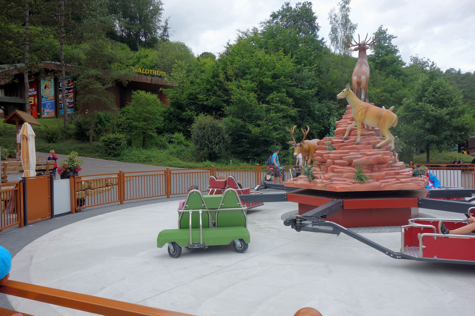 Bei letzterem fiel mir direkt der neue Bodenbelag auf. Das Pflaster wurde durch eine Betonplatte ersetzt. Ersteres war zwar schöner, aber durch die ganzen Rillen war die Fahrt doch merklich holpriger. Und die Pflastersteine werden sich mit der Zeit sicherlich auch gesetzt haben, vermutlich noch ungleichmäßig, was für ein darauf fahrendes Karussell nicht optimal sein dürfte. Mit dem glatten Betonboden ist die Fahrt nun auf jeden Fall angenehmer und bestimmt auch materialschonender. Um das herauszufinden, mussten wir erstmals knapp 10 Minuten warten, beim Platzhirsch herrschte dagegen Walk On.