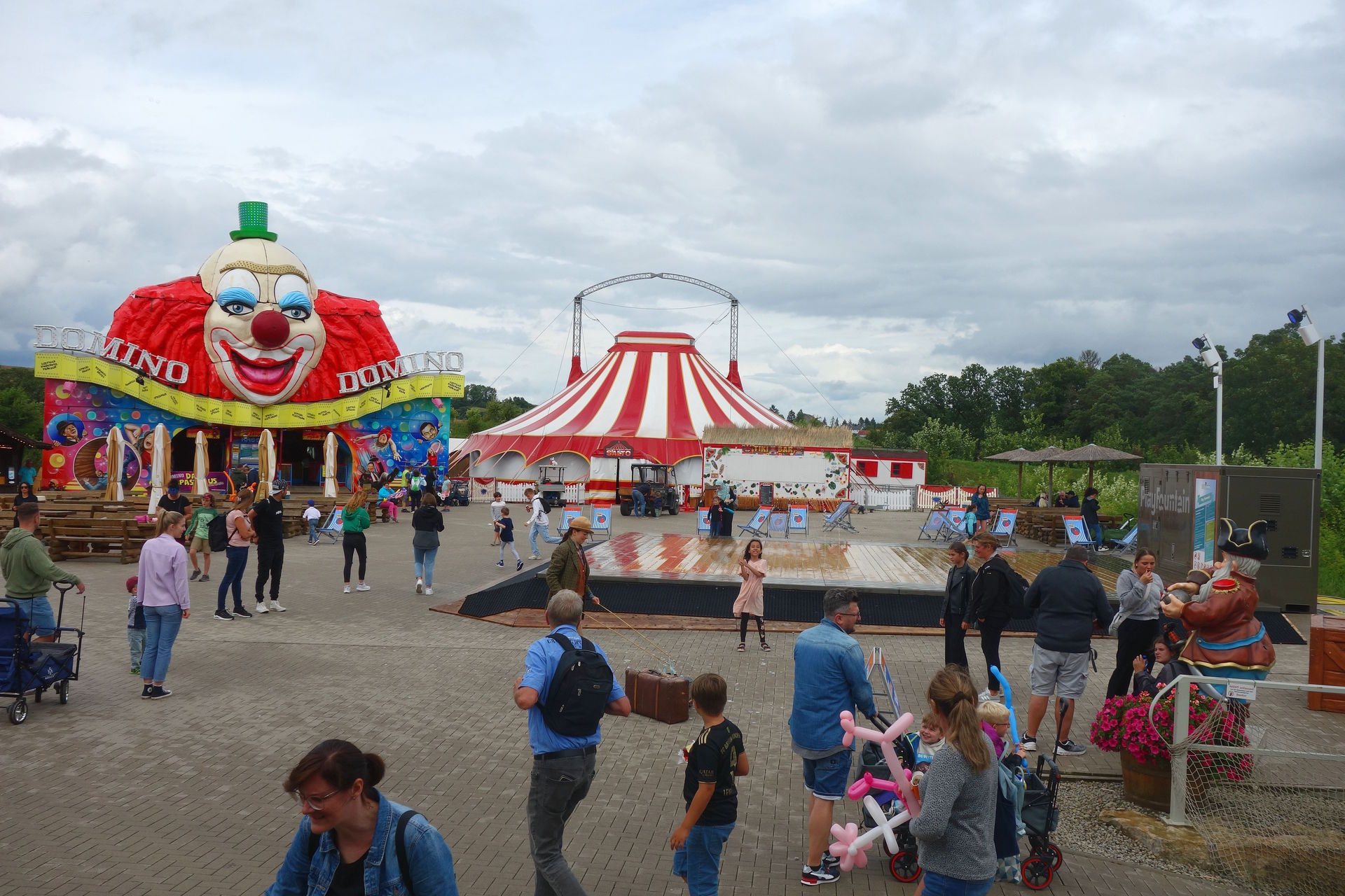 Abgesehen von der Feuerwehr-Bühne war übrigens auch eine Bühne neben der Todesspringer-Arena aufgebaut. Dort spielte ab 18 Uhr die Rainer-Tures-Band auf, gefolgt von einem DJ. Außerdem traten diverse Straßenmusiker an verschiedenen Stellen im ganzen Park auf und verschiedene Walking-Acts, sowie ein Ballonkünstler waren unterwegs. Wir kamen nach der Fahrt mit dem Eifel-Express zur Talstation in den Genuss eines Musikers, der zwischen dem dortigen Imbiss und dem Wartebereich des Eifel-Coasters platziert worden war. Der scherzte immer mal wieder, dass das wohl der beste Platz im ganzen Park sei, denn dank der längsten Warteschlange hatte er den Tag über unweigerlich die meisten Zuhörer. Wir schenktem ihm sogar noch etwas länger unsere Aufmerksamkeit, denn nach der Fahrt mit dem Alpine Coaster gönnten wir uns hier ein kleines Abendessen und verweilten fast eine Stunde - ausgerechnet, als der Musiker gerade Pause machte.