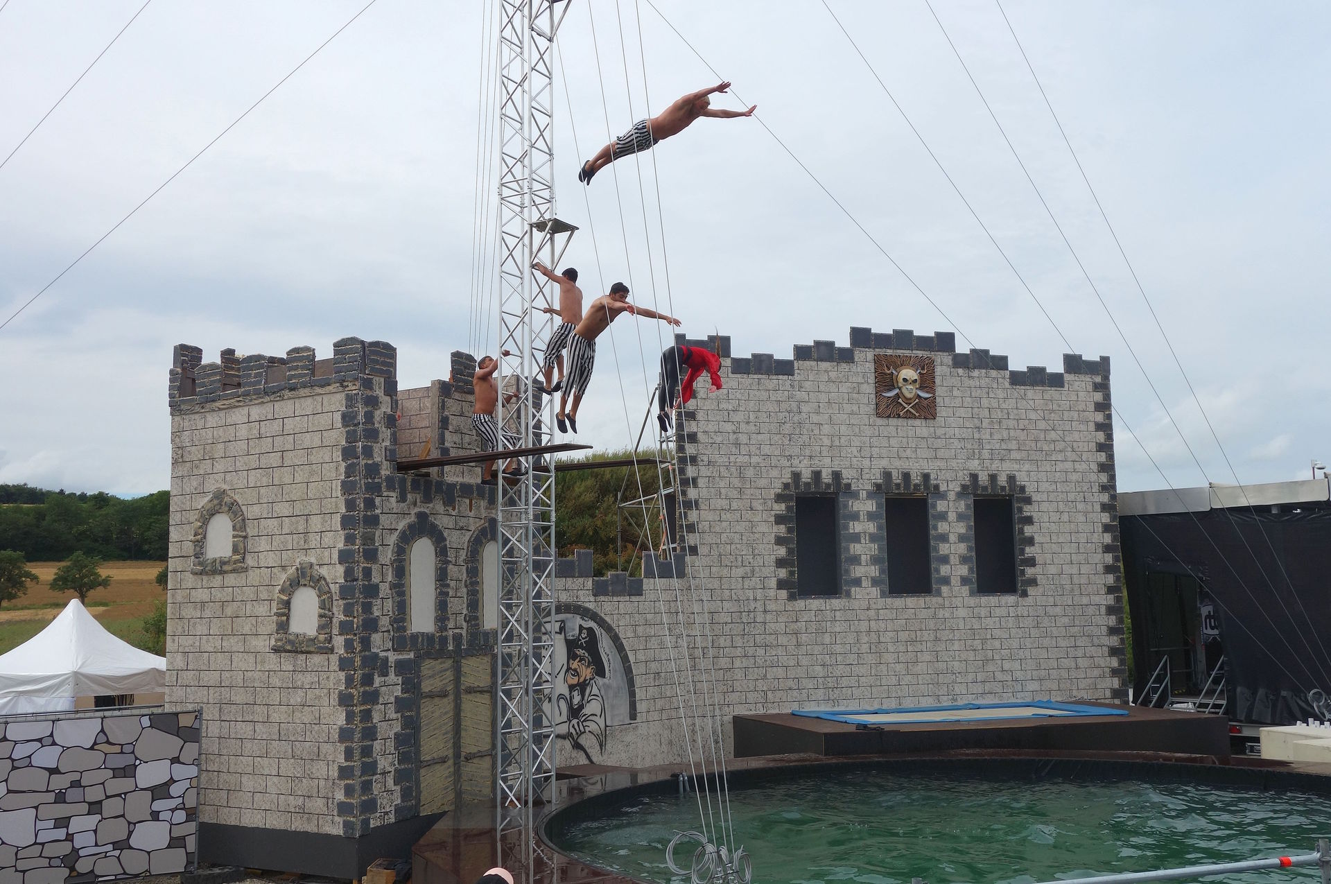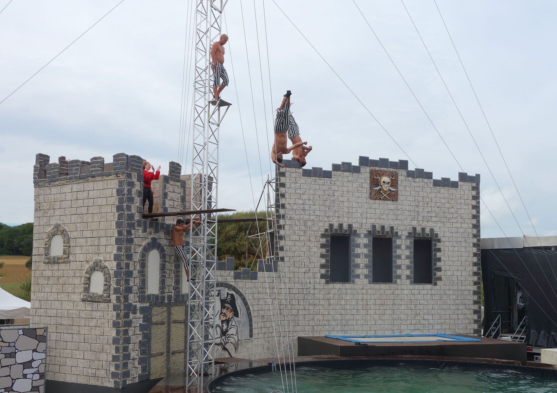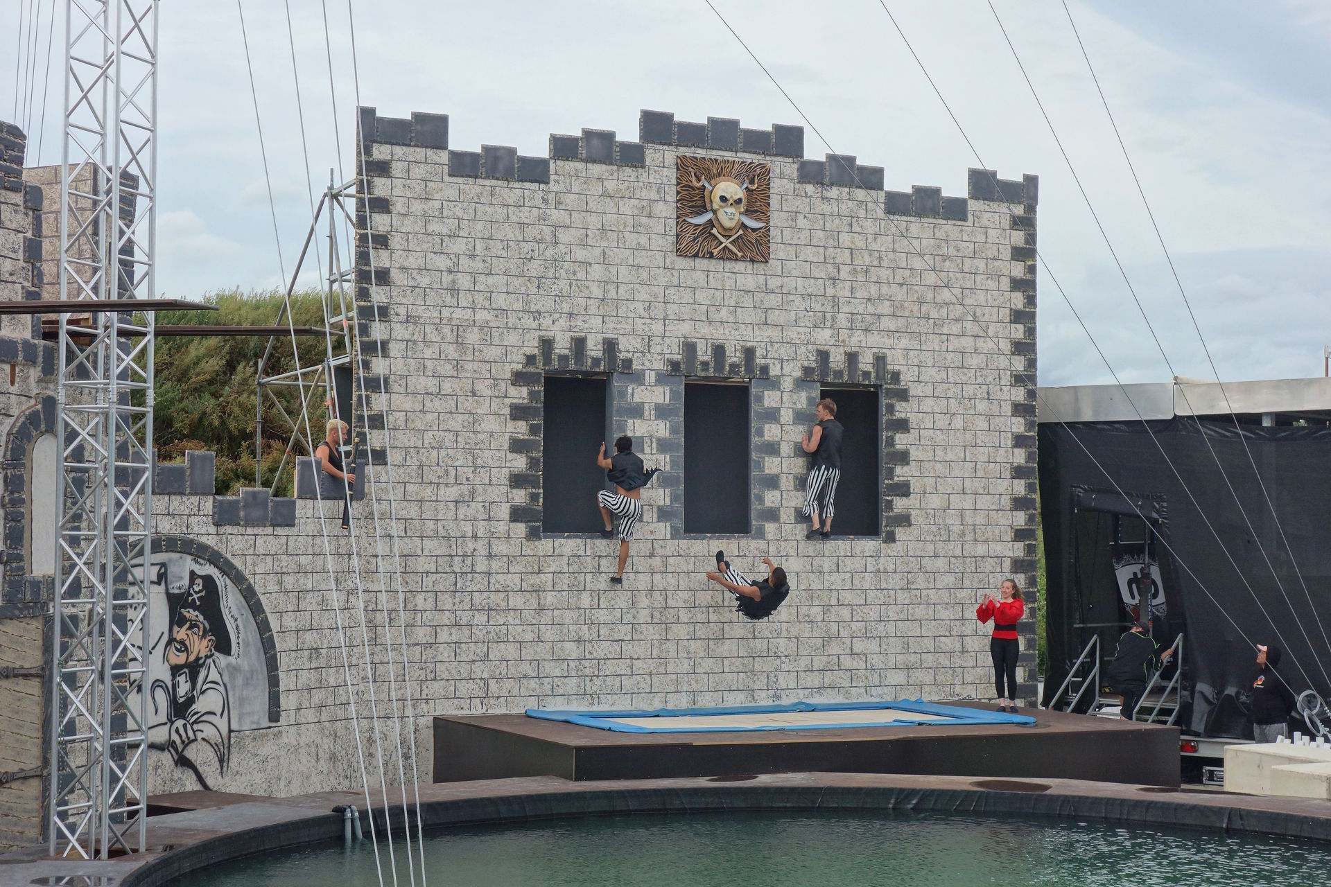 Allzu ausgefeilt war die Story nicht, aber thematisch passend und völlig ausreichend, um das Geschehen halbwegs sinnvoll erscheinen zu lassen und ein paar Gags einzubauen. Zu Beginn erreicht der Moderator nach langwieriger Suche endlich das Piratendorf. Dort soll mithilfe einer alten Tradition ein neuer Kapitän bestimmt werden: Derjenige der am Ende des Tages das Fernrohr in Händen hält, soll es werden. Und so laufen die Piraten erstmal ein wenig herum, führen ihre Kunststücke auf dem Trampolin auf und werfen sich dabei das Fernrohr gegenseitig zu. Natürlich kommt es, wie es kommen musste: Das Fernrohr fällt ins Wasser. Tollpatschige Versuche, es vom Beckenrand herauszufischen, scheitern natürlich.