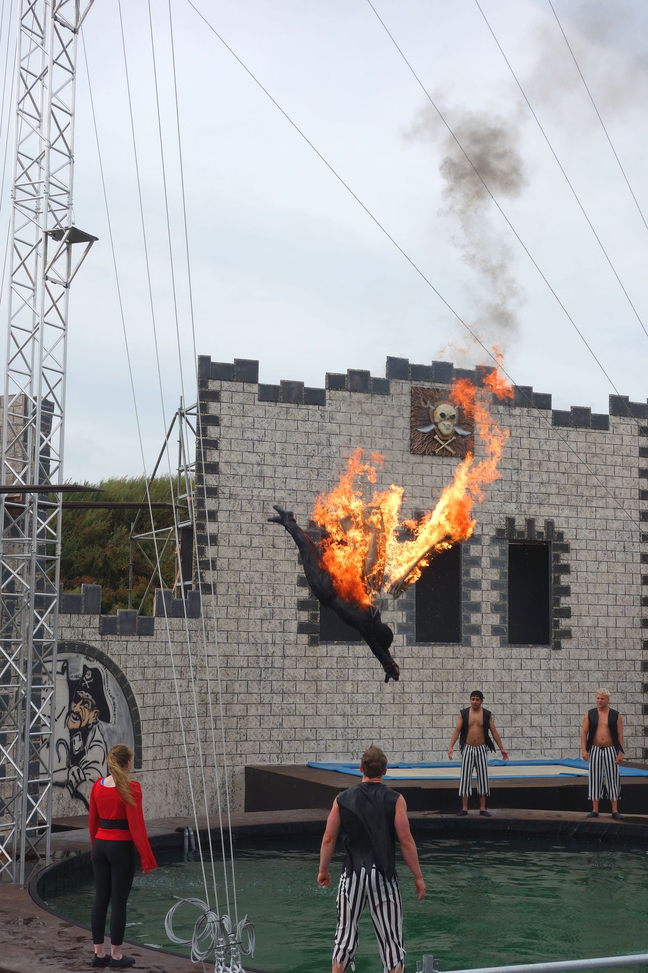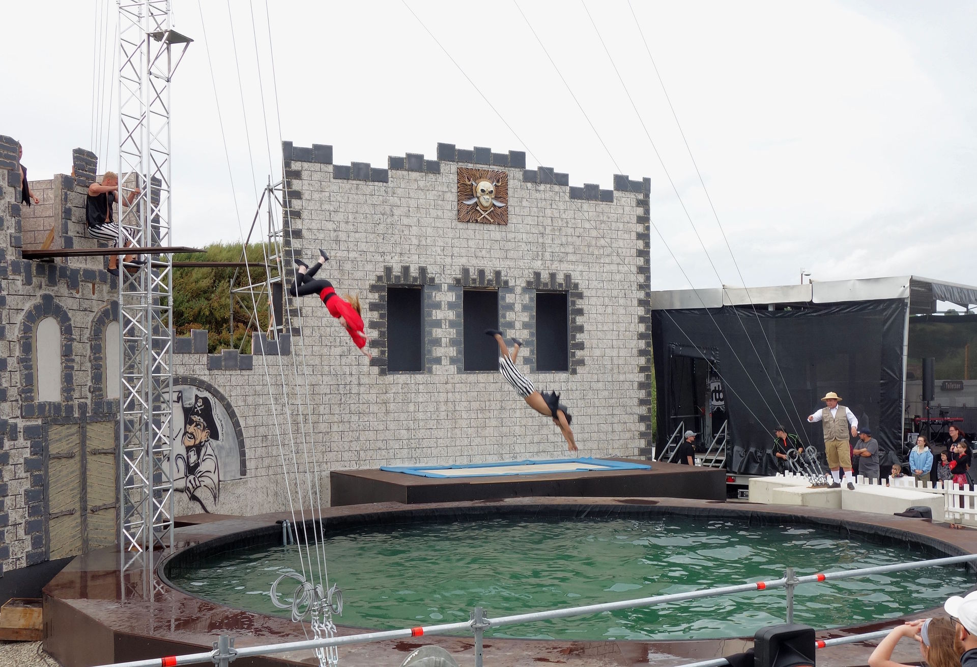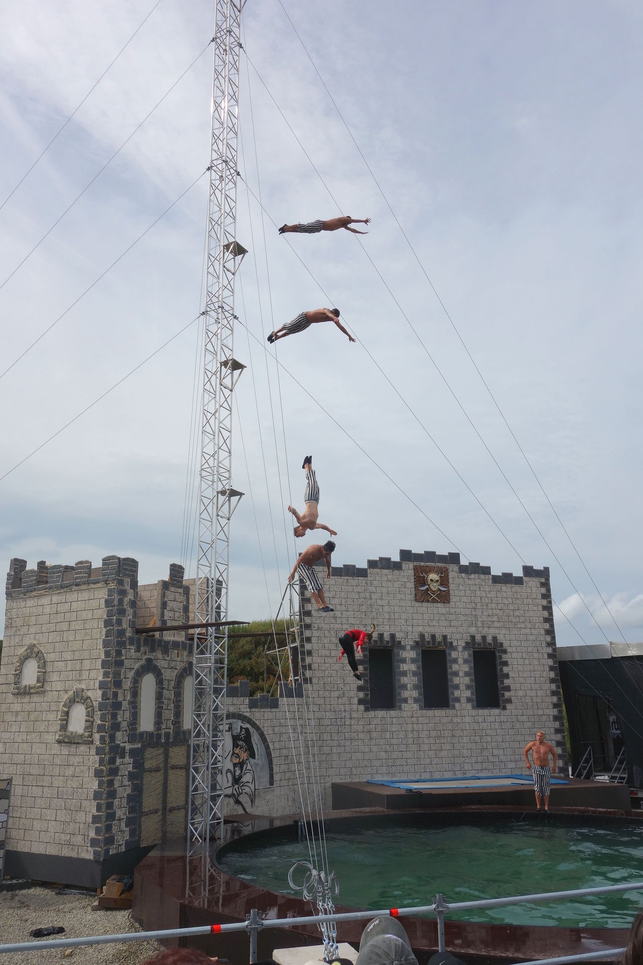 Allzu ausgefeilt war die Story nicht, aber thematisch passend und völlig ausreichend, um das Geschehen halbwegs sinnvoll erscheinen zu lassen und ein paar Gags einzubauen. Zu Beginn erreicht der Moderator nach langwieriger Suche endlich das Piratendorf. Dort soll mithilfe einer alten Tradition ein neuer Kapitän bestimmt werden: Derjenige der am Ende des Tages das Fernrohr in Händen hält, soll es werden. Und so laufen die Piraten erstmal ein wenig herum, führen ihre Kunststücke auf dem Trampolin auf und werfen sich dabei das Fernrohr gegenseitig zu. Natürlich kommt es, wie es kommen musste: Das Fernrohr fällt ins Wasser. Tollpatschige Versuche, es vom Beckenrand herauszufischen, scheitern natürlich.