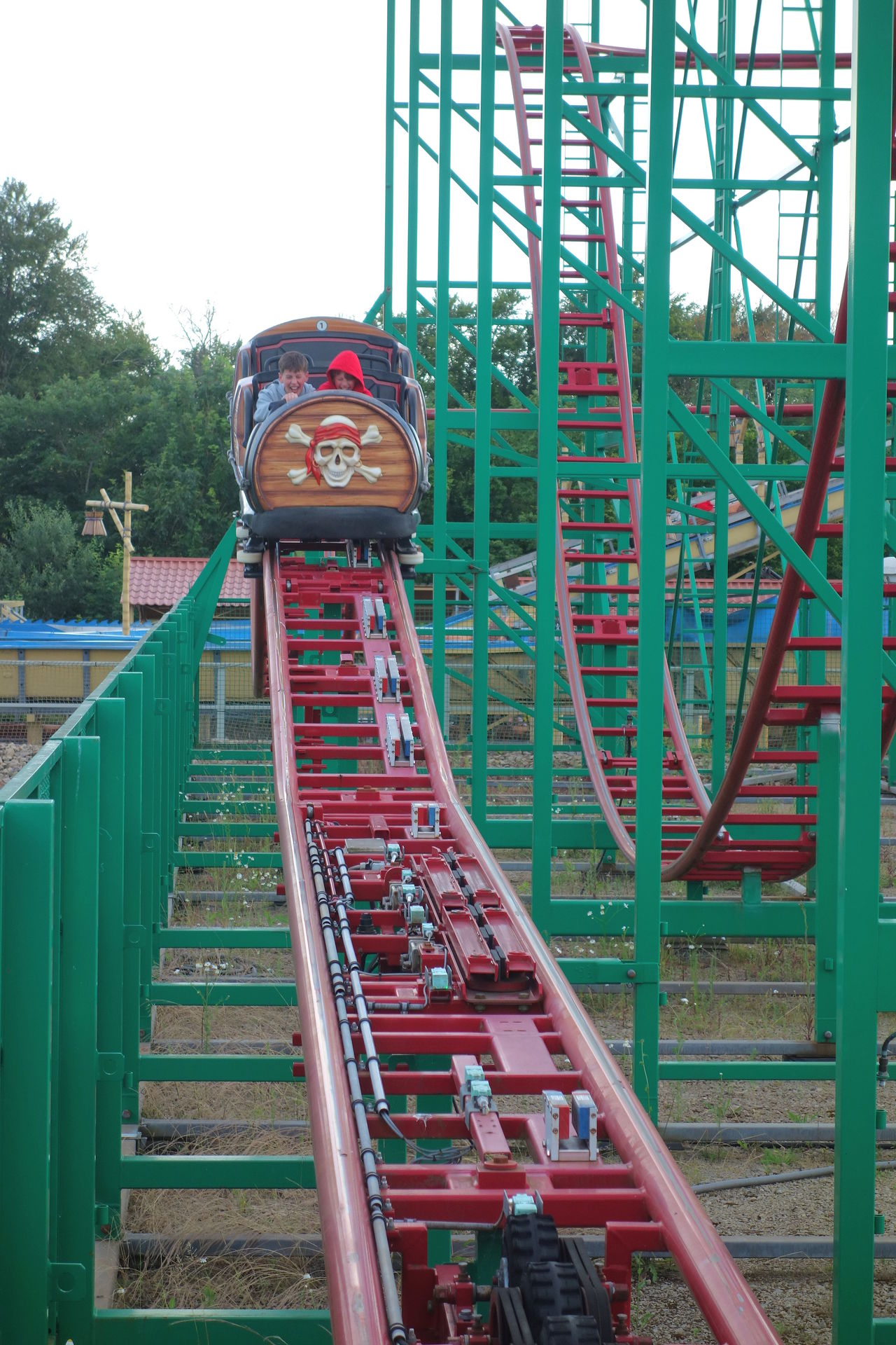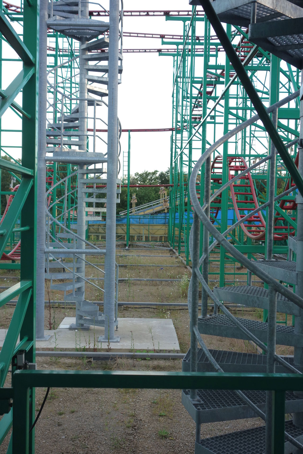 Die für ihre rabiaten Bremsungen berüchtigten Reibbremsen wurden tatsächlich nahezu komplett ausgebaut. Geblieben sind sie als Blockbremsen lediglich vor der weiten Kurve oben, zwischen den Mauskurven direkt über der Station und natürlich als Schlussbremse vor der Rückkehr zur Station. Für eine sanftere Geschwindigkeitsanpassung vor den Mauskurven wurden nach der langen Geraden und nach dem ersten großen Drop stattdessen Wirbelstrombremsen installiert. Ebenso wie oben zu sehen auf der Zufahrt zur Schlussbremse. Mir fällt jetzt keine andere (klassische) Wilde Maus mit Wirbelstrombremsen ein, haben wir in der Eifel also tatsächlich die weltweit erste? An den beiden verbliebenen Blockbremsen wurden 2023 zudem Catwalks samt Wendeltreppen nachgerüstet - sicherlich um eine mögliche Evakuierung (und auch die Wartung) zu vereinfachen.