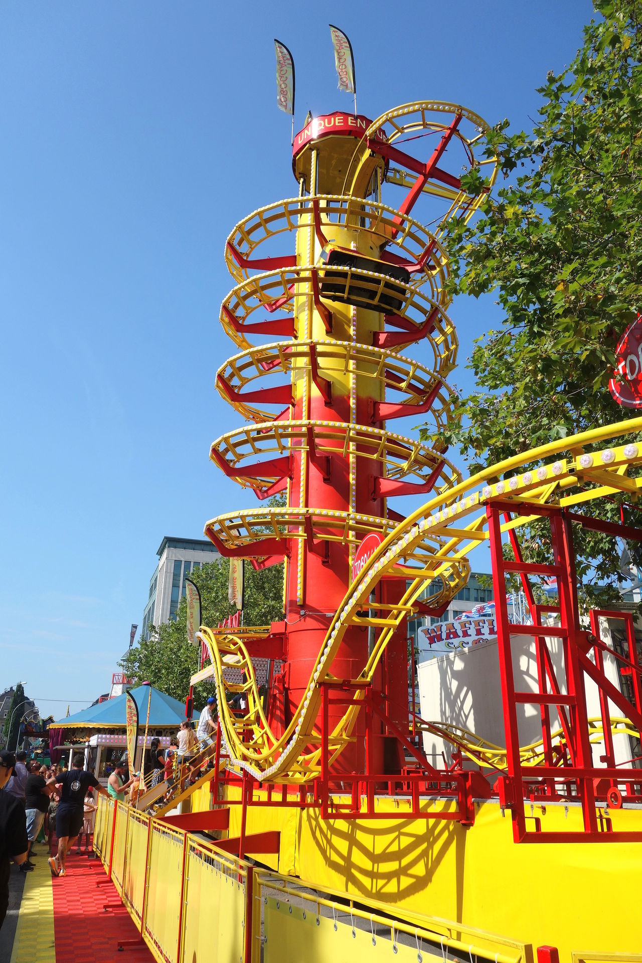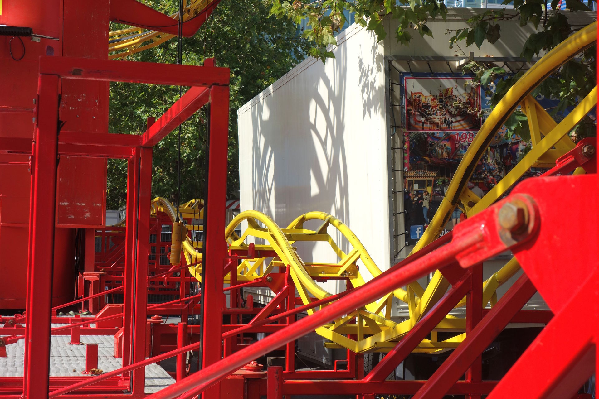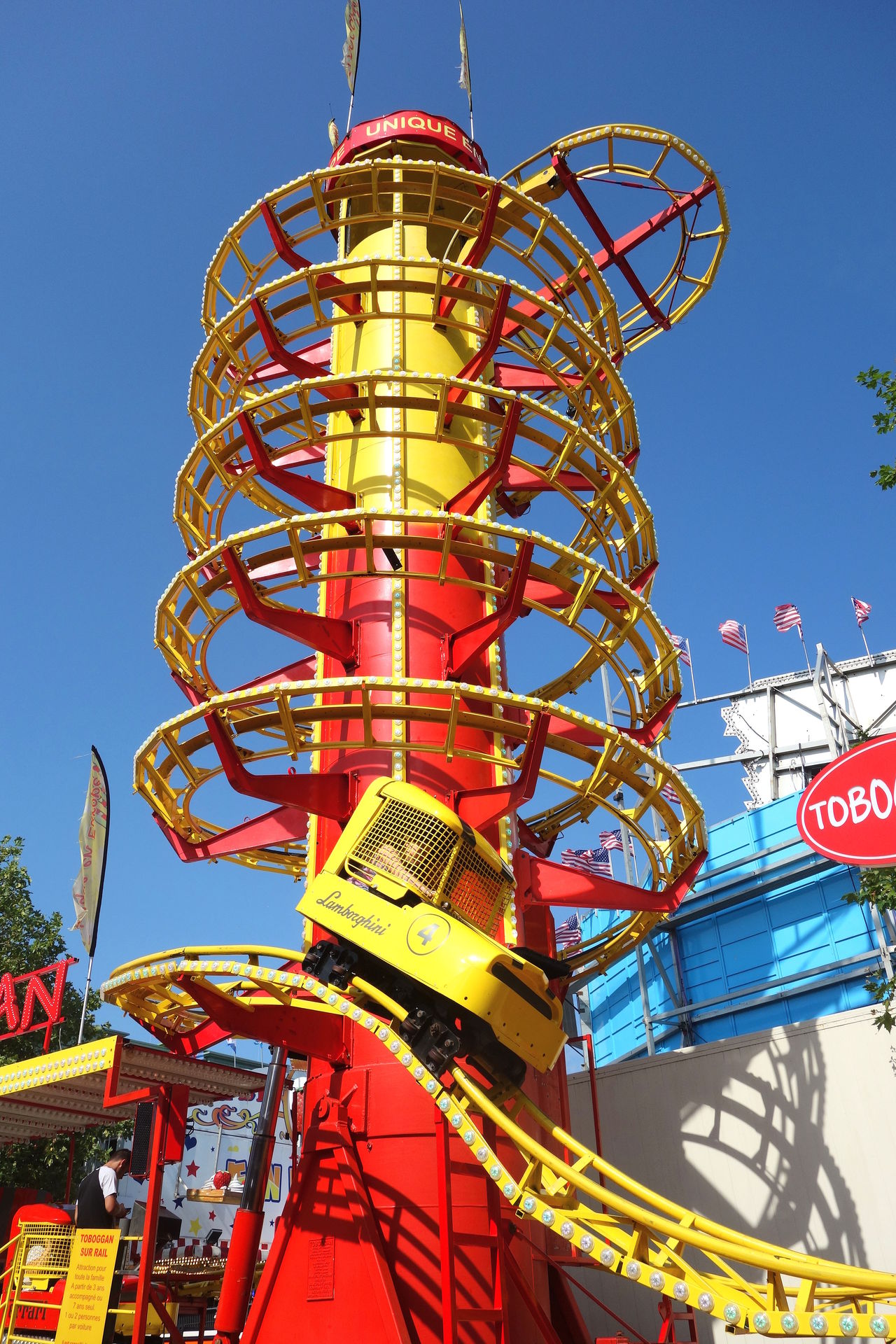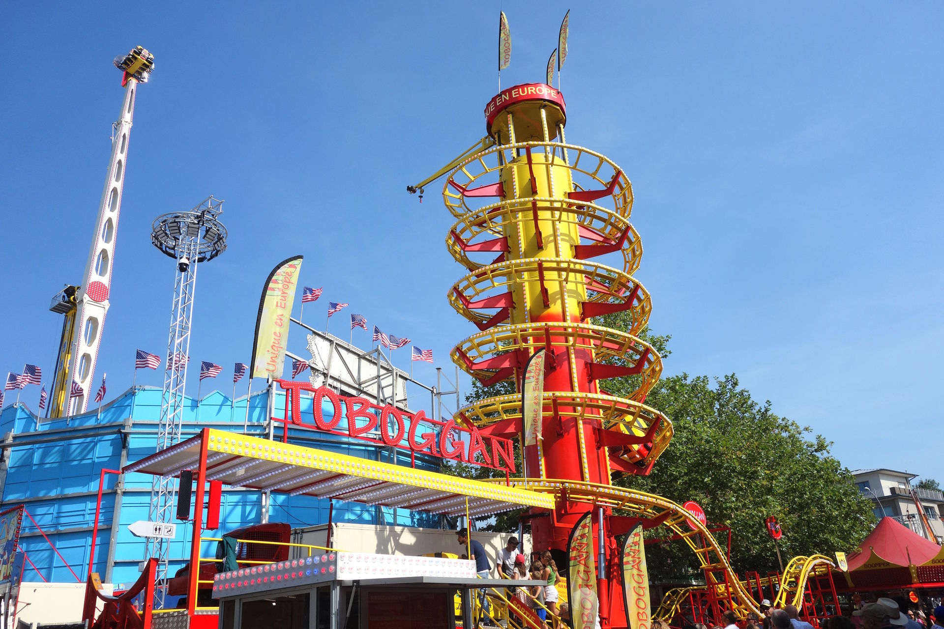 Beziehungsweise dem ersten, denn während jener in Metz erst 2023 importiert wurde, reist dieser hier bereits seit 2007 unter französischer Flagge (auch wenn eine Quelle ihn schon ab 1981 unter Chauvet listet, aber alle anderen sind sich einig, dass diese Anlage bis 2006 in den USA unterwegs war). Lespinasse brachte die Bahn nach Frankreich und ließ sie für den Einsatz auf den hiesigen Kirmesplätzen generalüberholen. Dazu gehörte auch die Werbeaufschrift "Unique en Europe" (also Einzigartig in an der Spitze des Turms, die auch heute noch dort prankt - neben den diversen Fahnen, die gleiches behaupten. Selbst wenn man die Aussage auf Festland-Europa beschränkt (der Toboggan in Großbritannien reist schließlich schon seit Anfang der 90er), ist sie seit Ankunft des zweiten Toboggans in Frankreich überholt. 2018 übernahm Landgraf die Bahn, hatte damit aber wenig Glück. Im Oktober 2019 verunglückte das Gespann auf der A29 westlich von Saint-Quentin. Zugmaschine samt Kassenhäuschen fanden sich im Graben wieder, der Stationsanhänger mitsamt Liftturm lag auf der Seite und die übrigen Achterbahnschienen wurden quer über die Autobahn verteilt. Wer das Bild des verunglückten Transports gesehen hat, war sich eigentlich recht sicher, dass dies das Ende der kuriosen Achterbahn sei. Aber Chance hat wohl eine sehr robuste Achterbahn gebaut, denn vier Monate später stand der Toboggan schon wieder auf einem Kirmesplatz, ehe er an den Schausteller Pfausser verkauft wurde.
