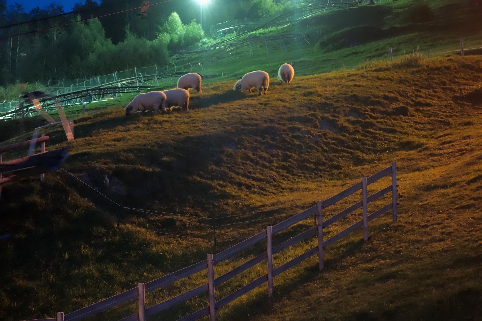 Die nächtliche Bergfahrt wurde neben der Aussicht auf die beleuchtete Strecke des Alpine Coasters von einigen Schafen begleitet.