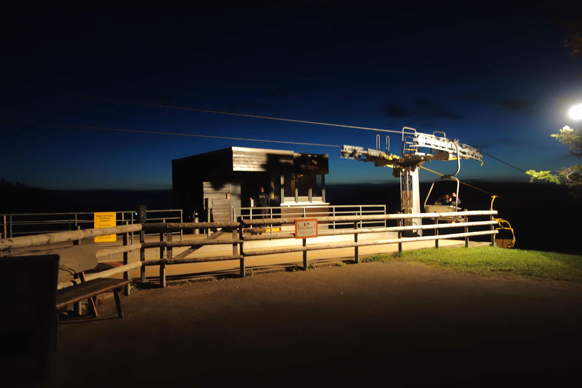Da es inzwischen nicht nur dunkel, sondern auch entsprechend frisch geworden war, zippte ich die Beine meiner Zip-Off-Hose wieder an und streifte die mitgebrachte Jacke über. An der Kasse der auf 749 Metern gelegenen Talstation kauften wir fix unsere Tickets zu je 15,50€ pro Person für Berg- und Talfahrt. Wer nur rauf oder nur runter (egal ob mit Sesselbahn oder Alpine Coaster) fahren möchte, zahlt 8,50€. Auch beim Lift gab es keine Schlange, sodass wir direkt einen der Doppelsessel entern konnten. Über eine Länge von rund einem Kilometer werden 362 Höhenmeter überwunden. Die Bergstation befindet sich entsprechend auf 1.111 Metern. Prost.
