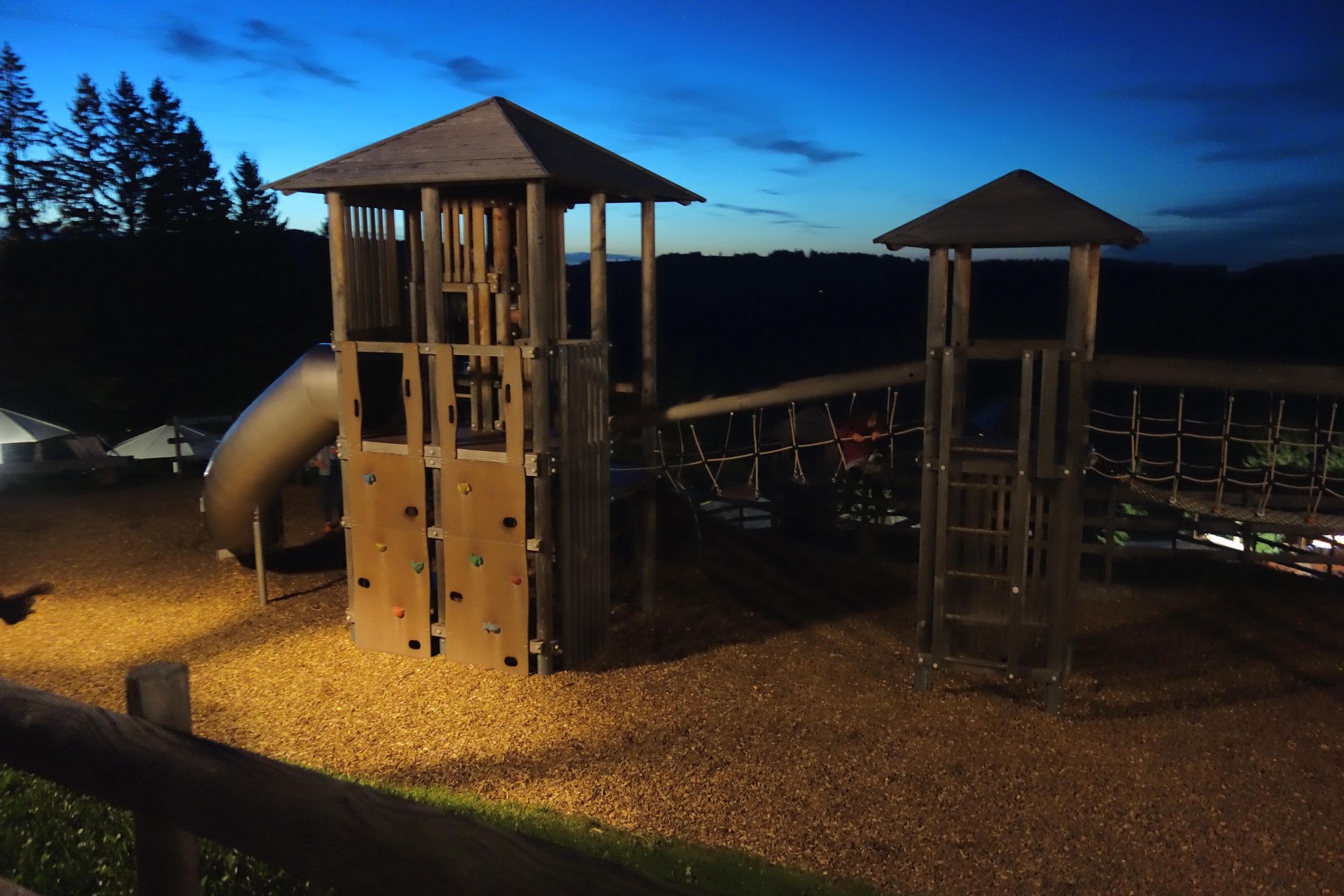 Gesehen haben wir davon in der Dunkelheit nichts. Wir umrundeten lediglich den kleinen Spielplatz neben der Berghütte.