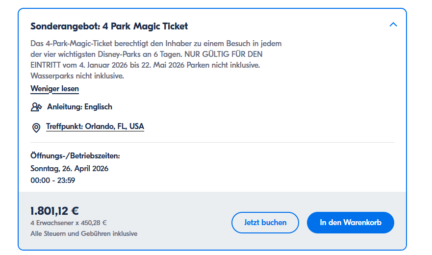 Wenn du über Irland buchst, gäbe es das 14 tägige Ticket (inkl. Hopper, Wasserparks, Memory Maker, Minigolf usw...) für 2.572€ für alle 4, für 14 Tage.