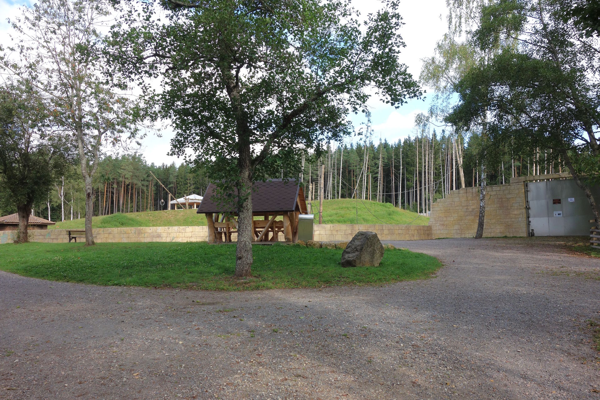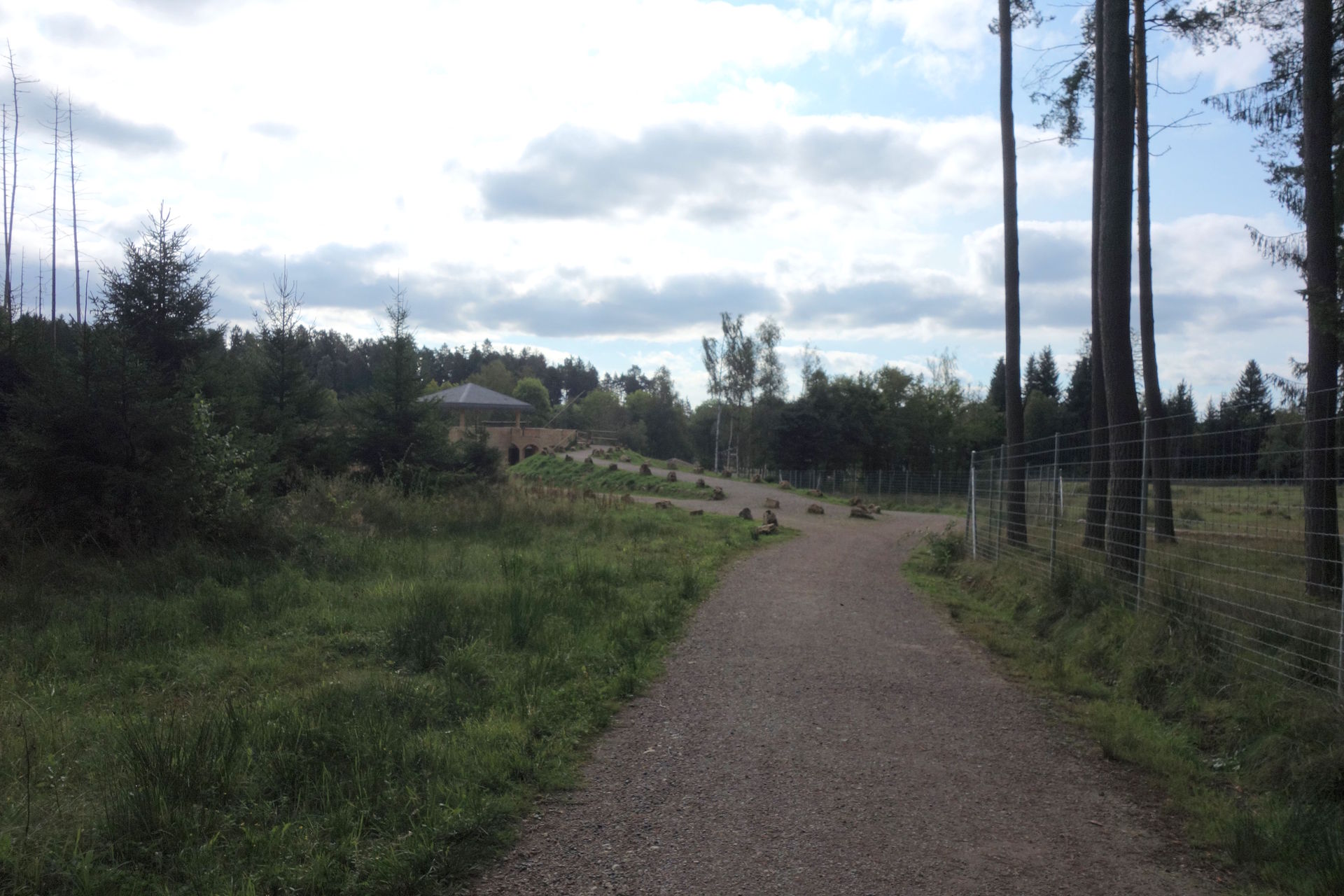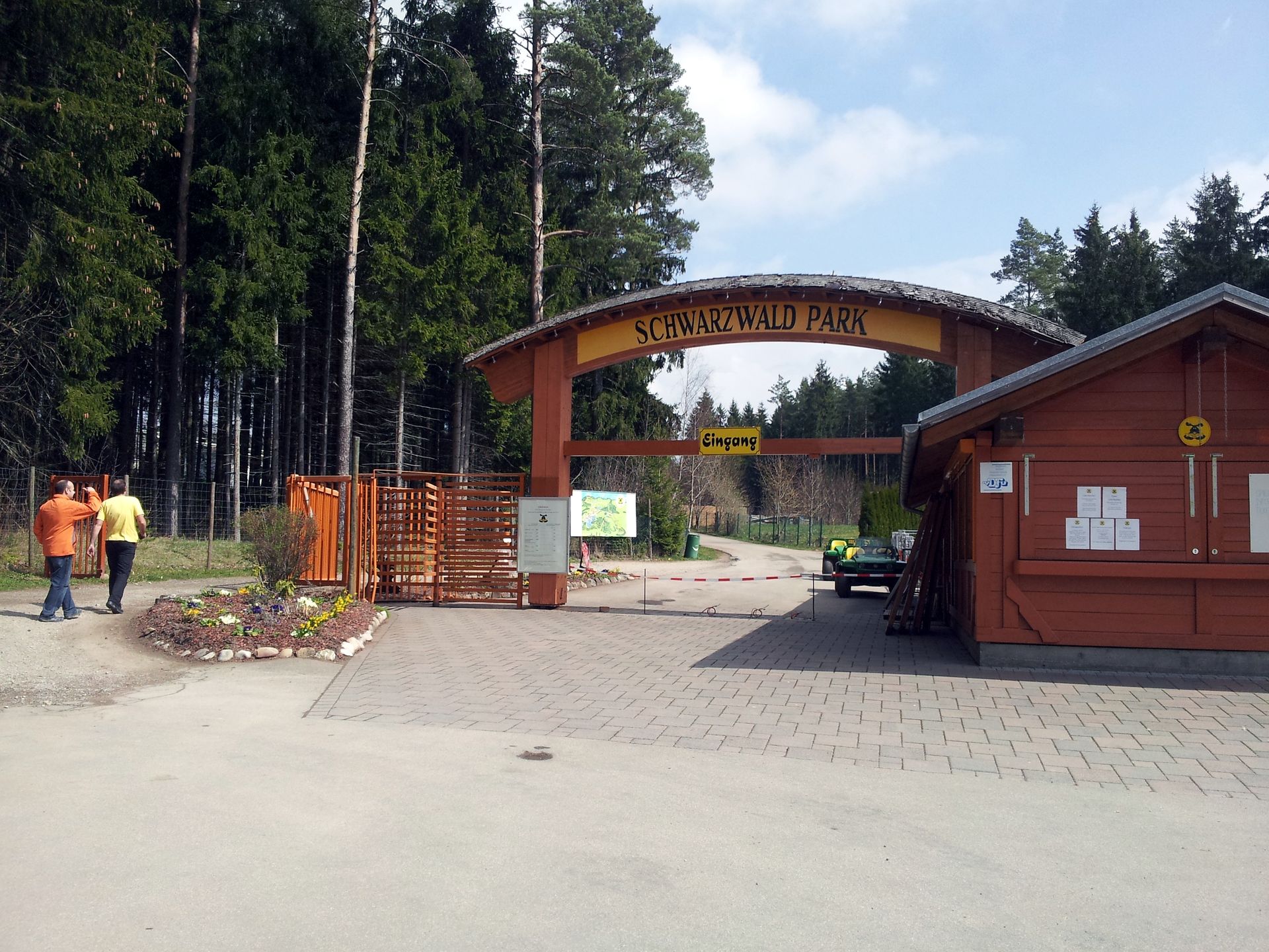 Auf den letzten Metern ohne Bäume sieht man bereits die meterhohen Zäune des großen Raubtiergeheges. Früher musste man über eine Zufahrtsstraße zum Park um das Wäldchen herum gehen. Das an dieser Straße gelegene Hotel gehörte ebenfalls zum Schwarzwald Park und bildete auch den Eingangsbereich des Parks. Es blieb beim Verkauf aber außen vor und wird eigenständig von Verena Reichle geführt, der Parkeingang wurde daher nach hinten verlegt.