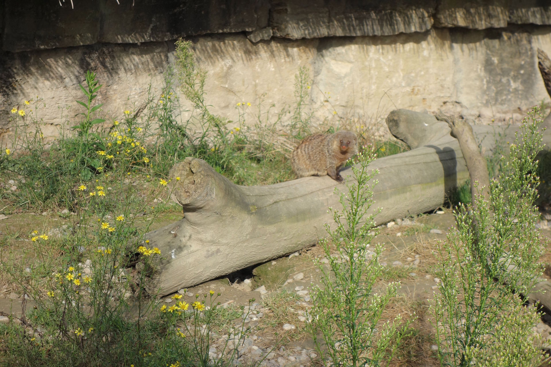 Auf der anderen Seite zum Freigehege der Löwen sind Zebramangusten beheimatet.
