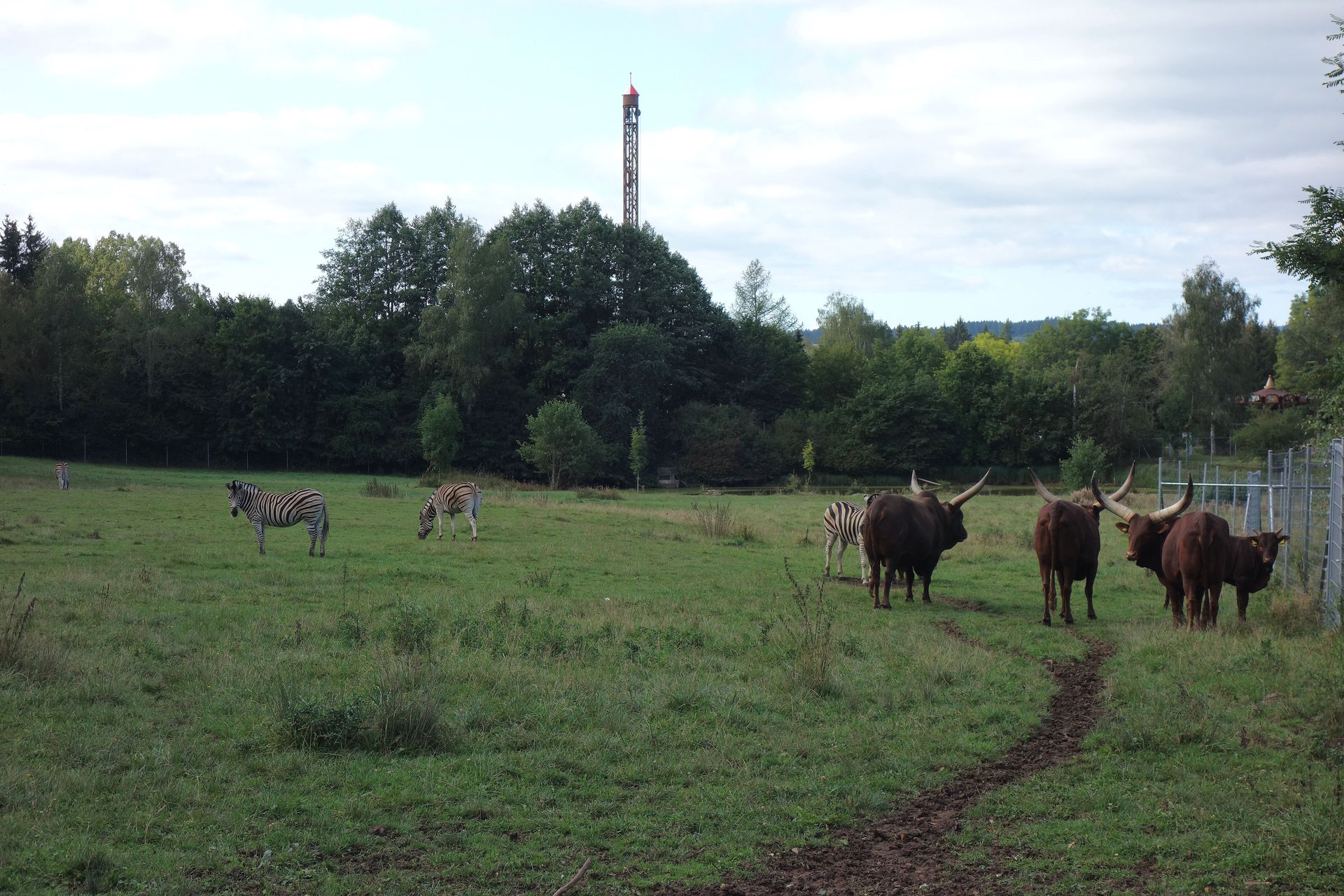 Diesmal bog ich natürlich nach rechts ab, vorbei an den Zebras und Watussirindern zur einen...