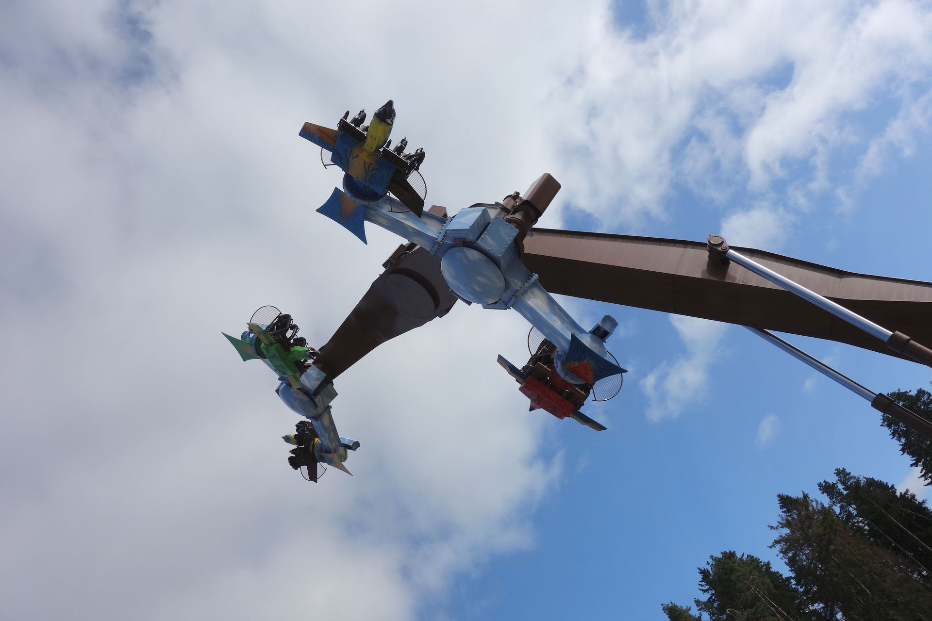 Denn am großen, sich aufstellenden Hauptarm ist ein rotierender Träger befestigt, an dessen Enden wiederum die rotierenden Gondelkreuze hängen. Und an den beiden Gondelkreuzen sind jeweils vier Fahrgastträger montiert, die sich ihrerseits - gesteuert per Joystick zwischen den beiden Sitzen - nochmals um die Längsachse drehen können. Oder besser gesagt waren. Im Zuge des Designprozesses und auch bei der Bestellung des Fahrgeschäfts durch den Park war es nämlich wohl niemandem aufgefallen, dass die Anordnung der Gondeln von unten wie ein Hakenkreuz aussah. Der Name Adlerflug in Kombination mit der Lackierung im freundlichen Braun machte die Sache nicht besser, und so entschied man sich nur wenige Wochen nach der Eröffnung, das Fahrgeschäft wieder zu schließen. Kurzerhand wurden jeweils zwei der Gondelträger entfernt, sodass nun kein Hakenkreuz mehr zu sehen ist. Außerdem wurden die verbliebenen Gondeln bunt lackiert und der Name in Papageienflug umgeändert. Auf der SBF-Webseite werden die Teknoplanes nach wie vor in der ursprünglichen Konfiguration mit 8 Gondeln angeboten, meines Wissens gab es aber bislang keinen weiteren Abnehmer für diesen Fahrgeschäftstyp.