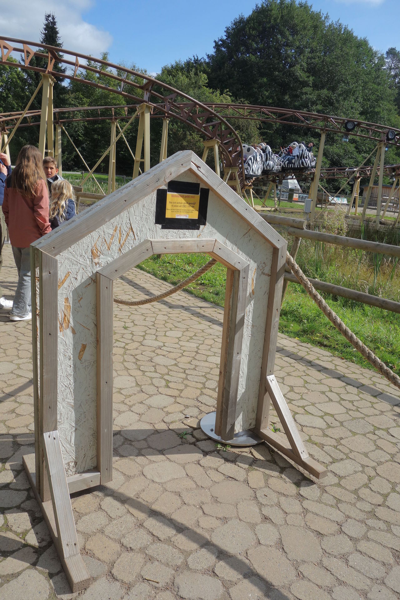 Um 9:50 Uhr war das Tor zudem noch verschlossen, der Park sollte erst in 10 Minuten öffnen. Aber ich war tatsächlich nicht der einzige, der so früh dran war. Mit mir zusammen wartete eine Familie sehnsüchtig auf Einlass. Denen ließ ich auch den Vortritt, als das Holztor geöffnet und der überdachte Durchgang freigegeben wurde. Im hinteren Bereich ist seitlich die Kasse angebaut, dann folgt das Drehkreuz, wo ich mein bereits im Vorfeld zu 24€ erstandenes Ticket scannen und den Park betreten konnte.