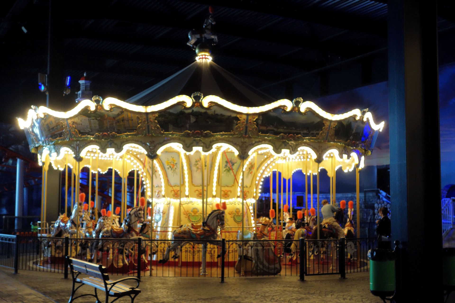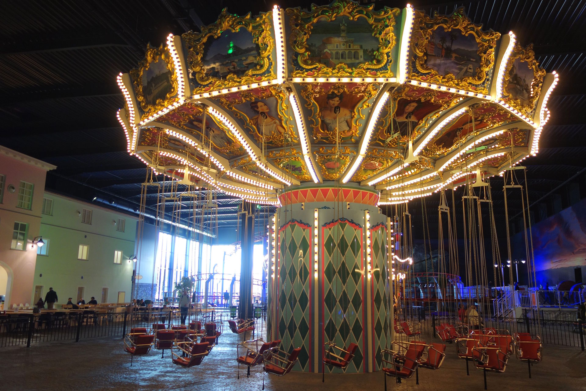 In der Mitte der Halle dreht noch ein klassisches Pferdekarussell seine Runden.