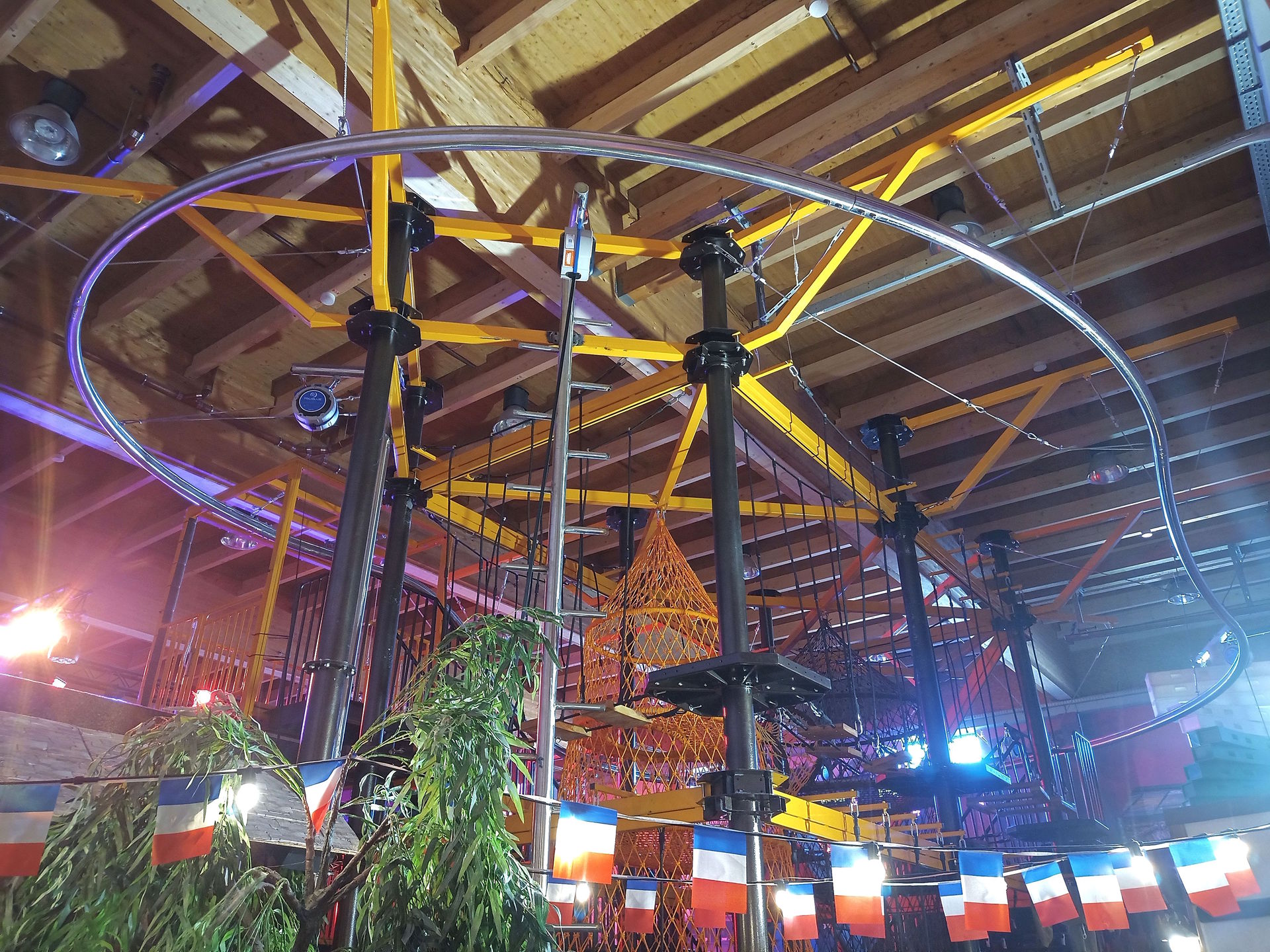 Dabei ist das Innere der Halle durchaus sehenswert, denn man hat sich für eine wirklich gelungene Steampunk-Gestaltung entschieden. Also jedenfalls größtenteils, hier und da wurden dann doch auch wieder andere Themen eingestreut, aber zumindest ist die ganze Halle eben thematisiert. Und das eben gar nicht mal schlecht. Auch was die Flächenausnutzung angeht, kann sich das Ticiland noch eine Scheibe beim Flipped Funpark abschneiden. Wo die Halle in Stein am Rhein recht leer wirkte, kamen mir die 5.000m² hier in Singen zum Teil schon wieder überladen vor. Den größten Teil des Erdgeschosses nimmt die Jump World mit diversen Trampolinen ein. Dazu gibt es noch ein Kinder-Kletterparadies und zwei Mini-Fahrgeschäfte. Nämlich die Mini-Schiffschaukel Captain Lucky (schaut mir nach dem Mini Pirate Ship von SBF aus) und die Mini-Frisbee Santa Lucia (von den Bildern her könnte das ein 6 Seat Pendulum Ride von Sinorides aus China sein). Dazwischen befindet sich der Zugang zu einem kleinen 5D-Kino. Während sich das alles offensichtlich eher an jüngere Besucher richtet, gibt es aber auch noch die Horror-Maze Hospital, die erst ab 12 Jahren besucht werden darf. Leider machte die erst später auf, sodass wir sie nicht testen konnten. Öffnungszeiten kamen uns auch beim eigentlich Grund für unseren Besuch in die Quere. Den hinteren Teil der Halle nimmt der Kletterparcours Expedition Flippmountain ein.