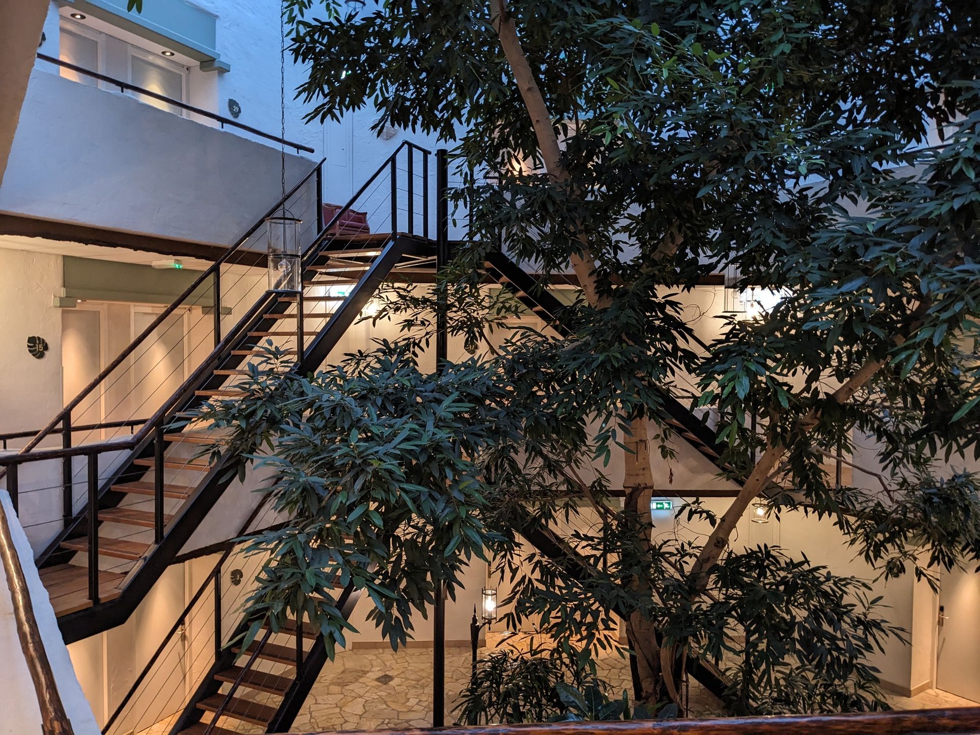Die Hotelzimmer sind auf drei Stockwerken um ein zentrales Atrium angeordnet: