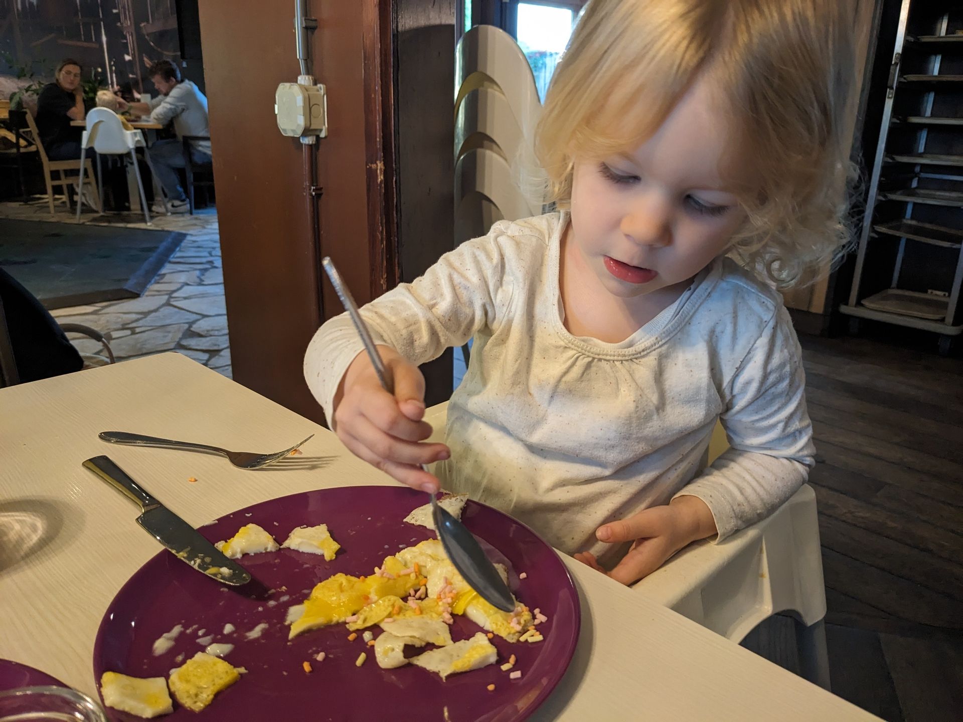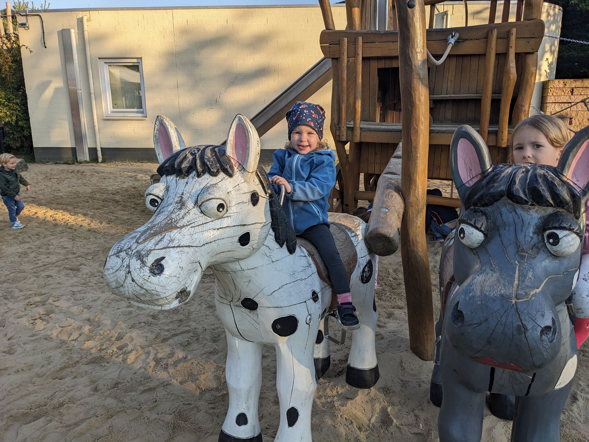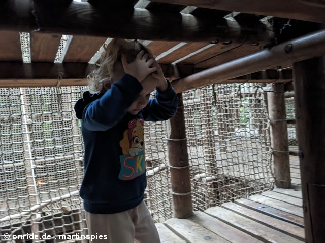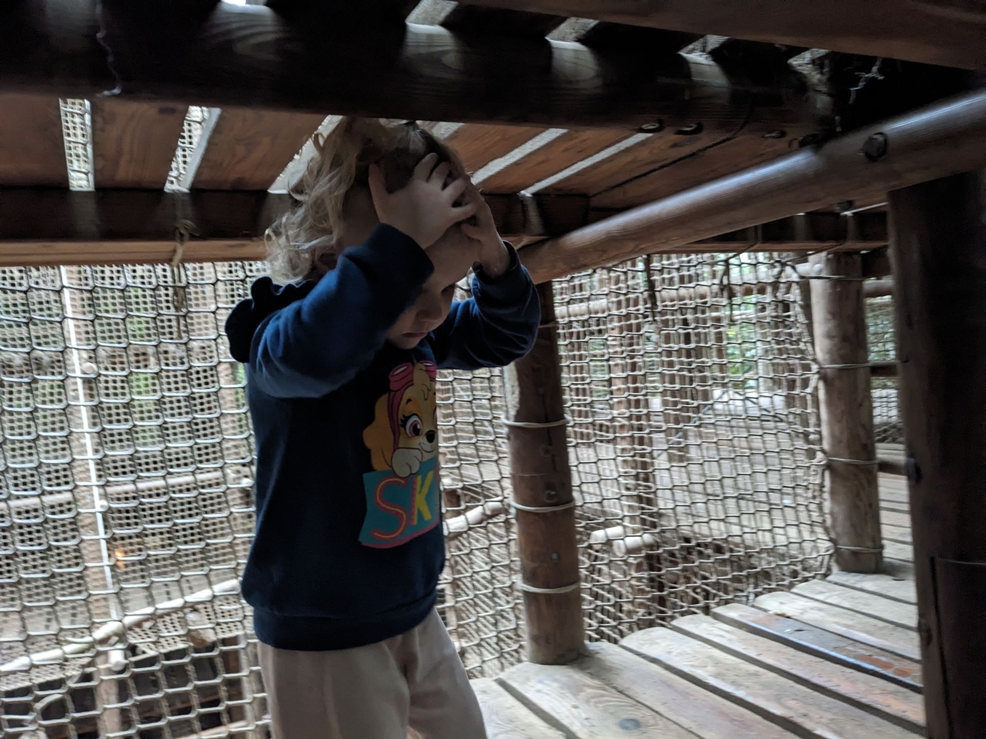 Die ersten Tage hat Marie es noch nicht so richtig hinbekommen gebückt zu laufen. Sie ist also an jedem Balken mit dem Kopf hängen geblieben. Damit das nicht so weh tut lief sie dann dauerhaft so im Klettergerüst rum: