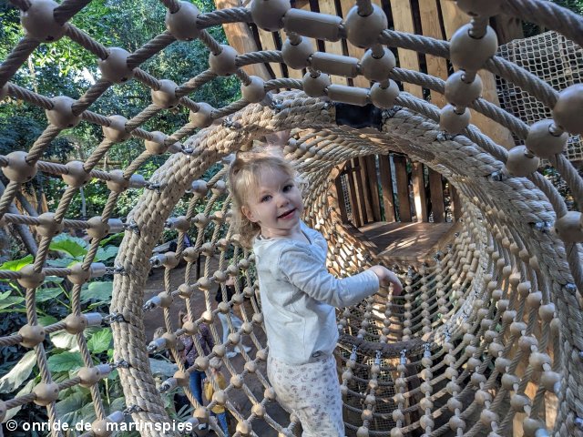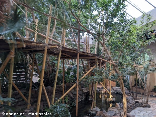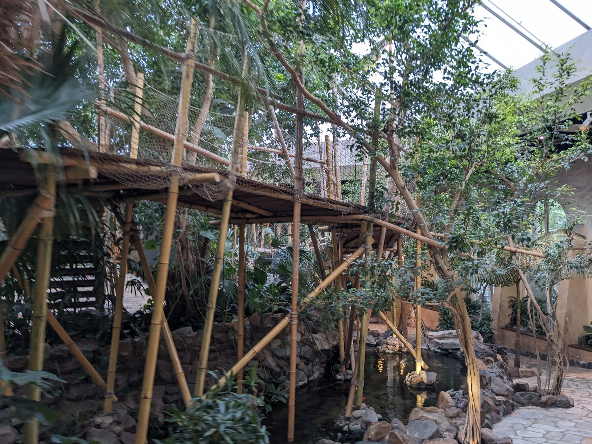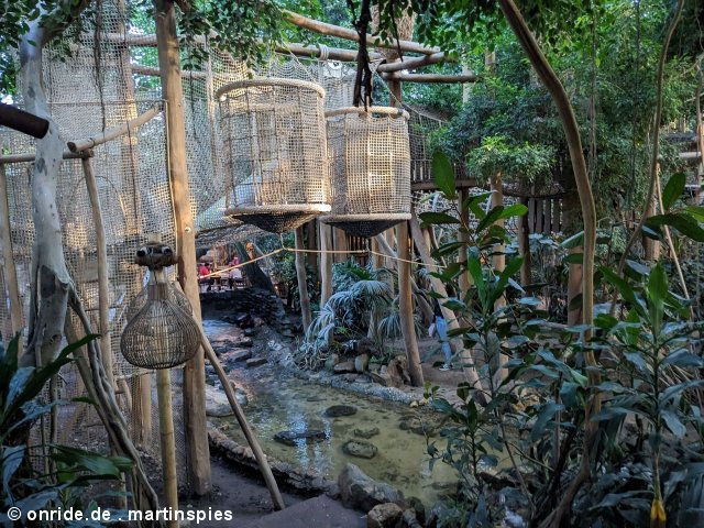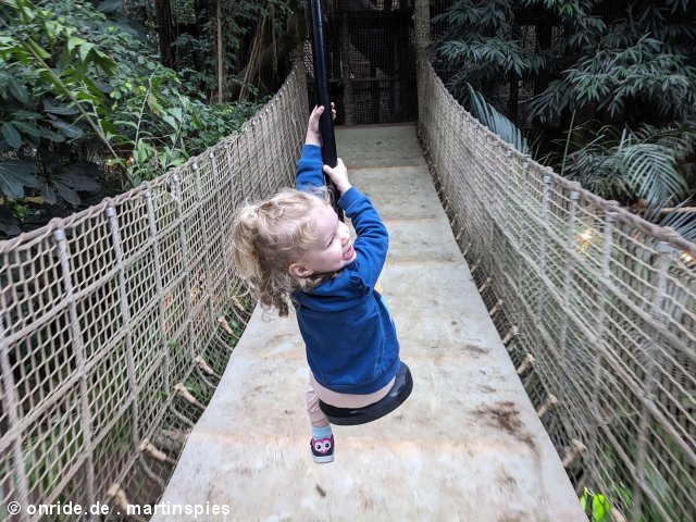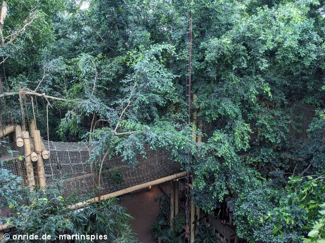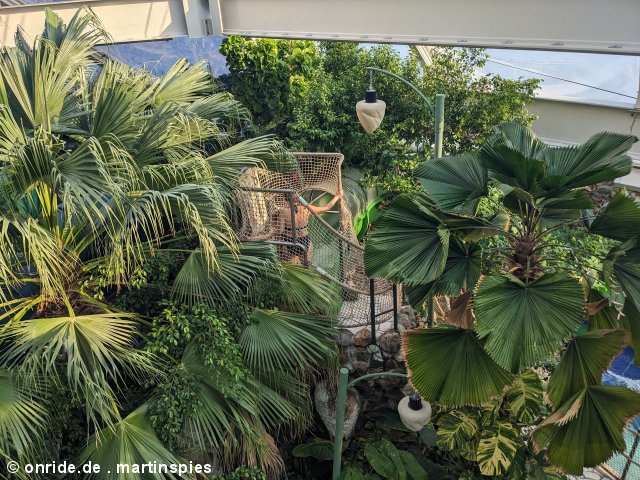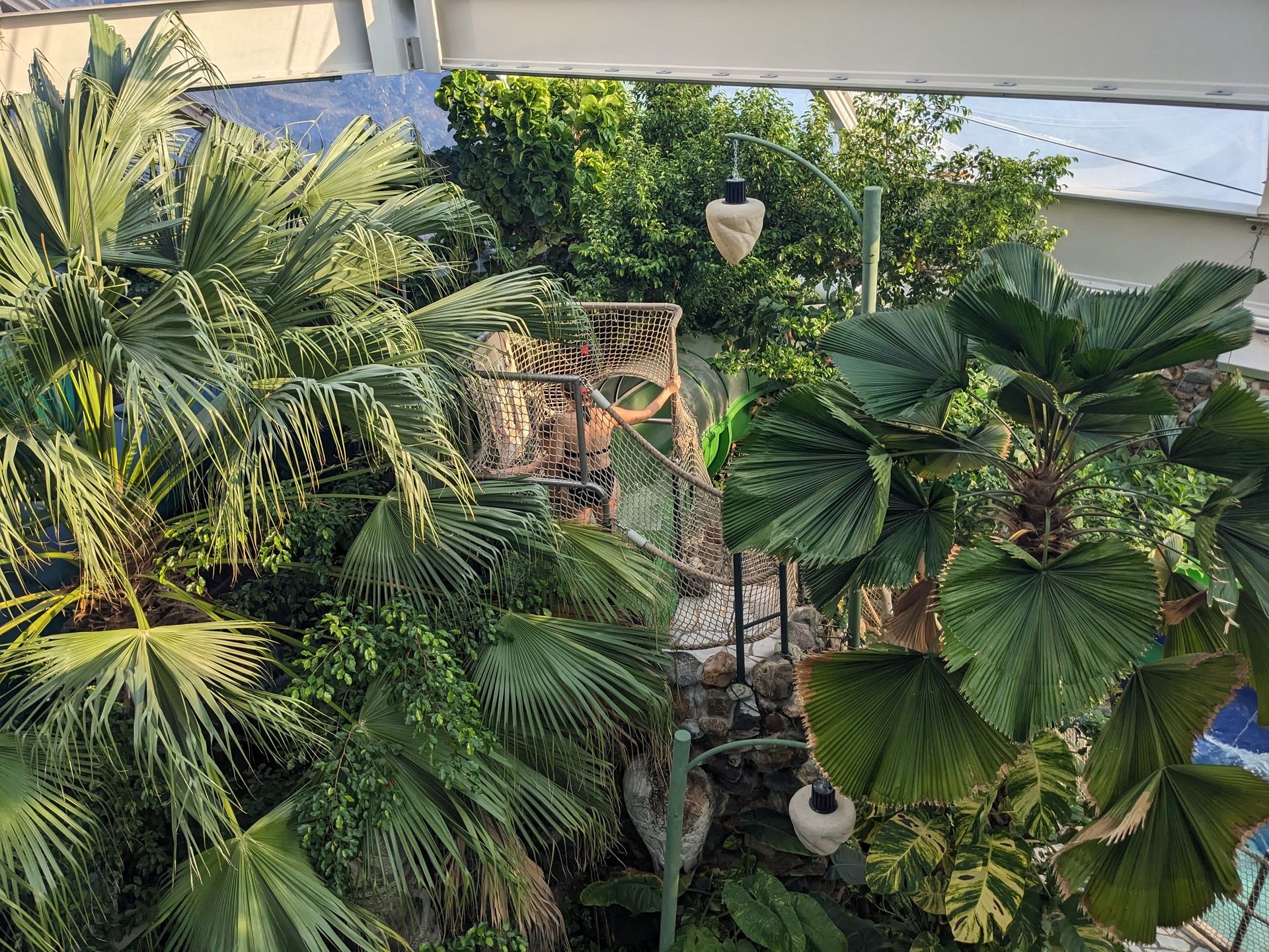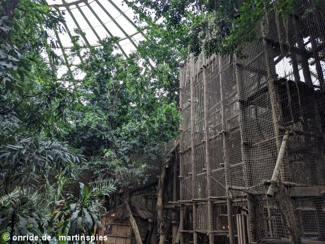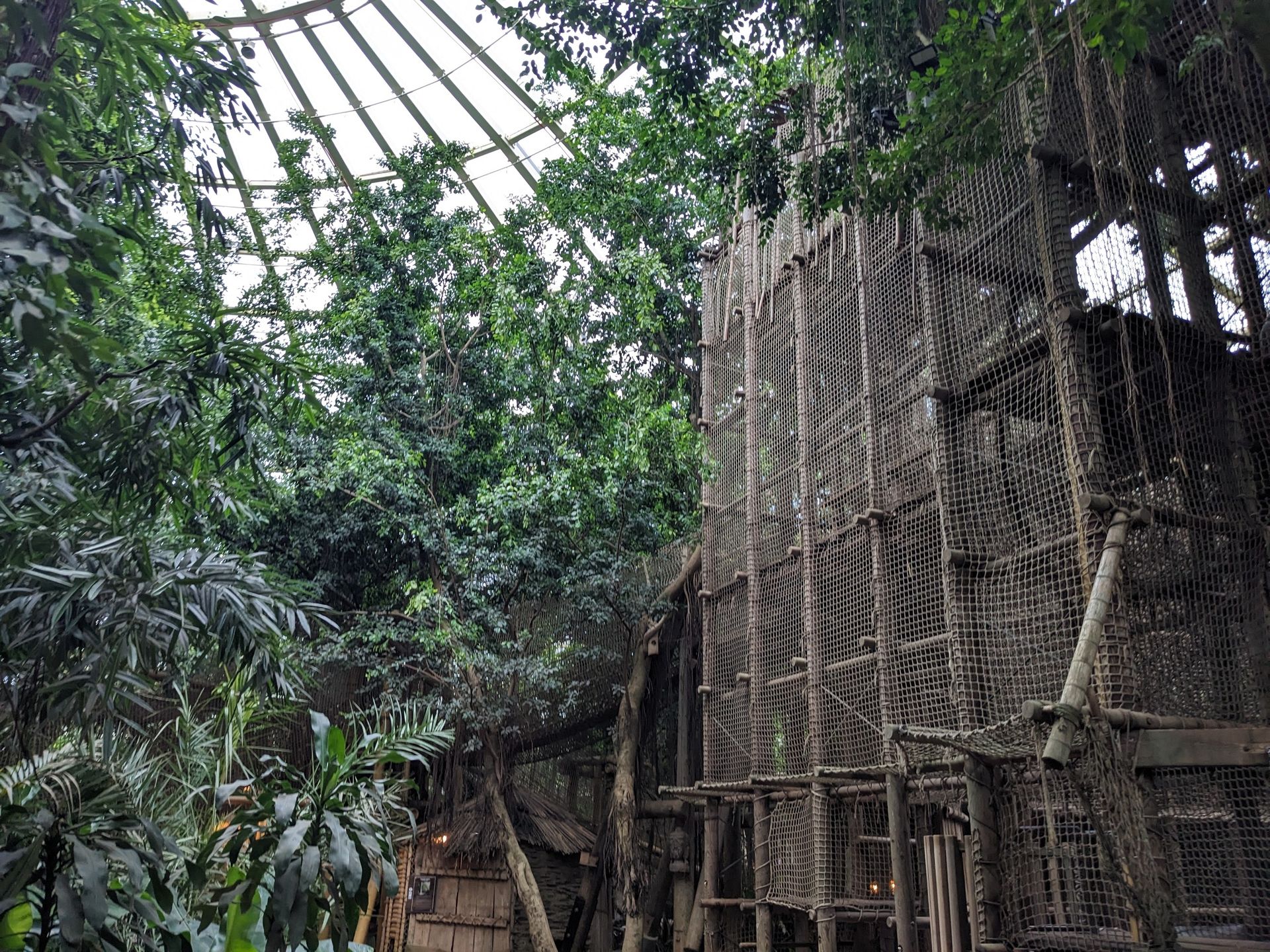 Die Halle ist eine riesige Glaskuppel mit Dschungel darin. Und durch den Dschungel ziehen sich überall Klettergerüste und Spielmöglichkeiten: