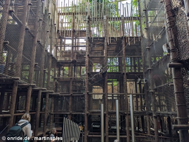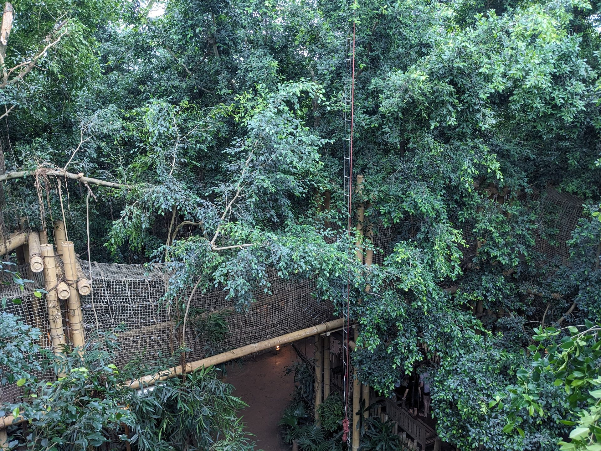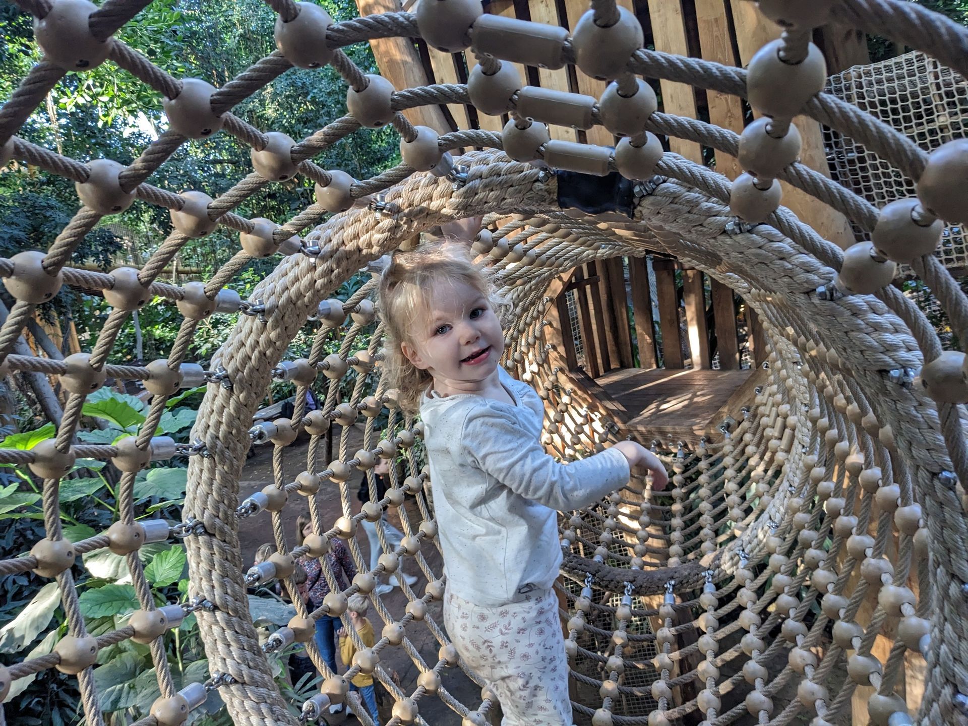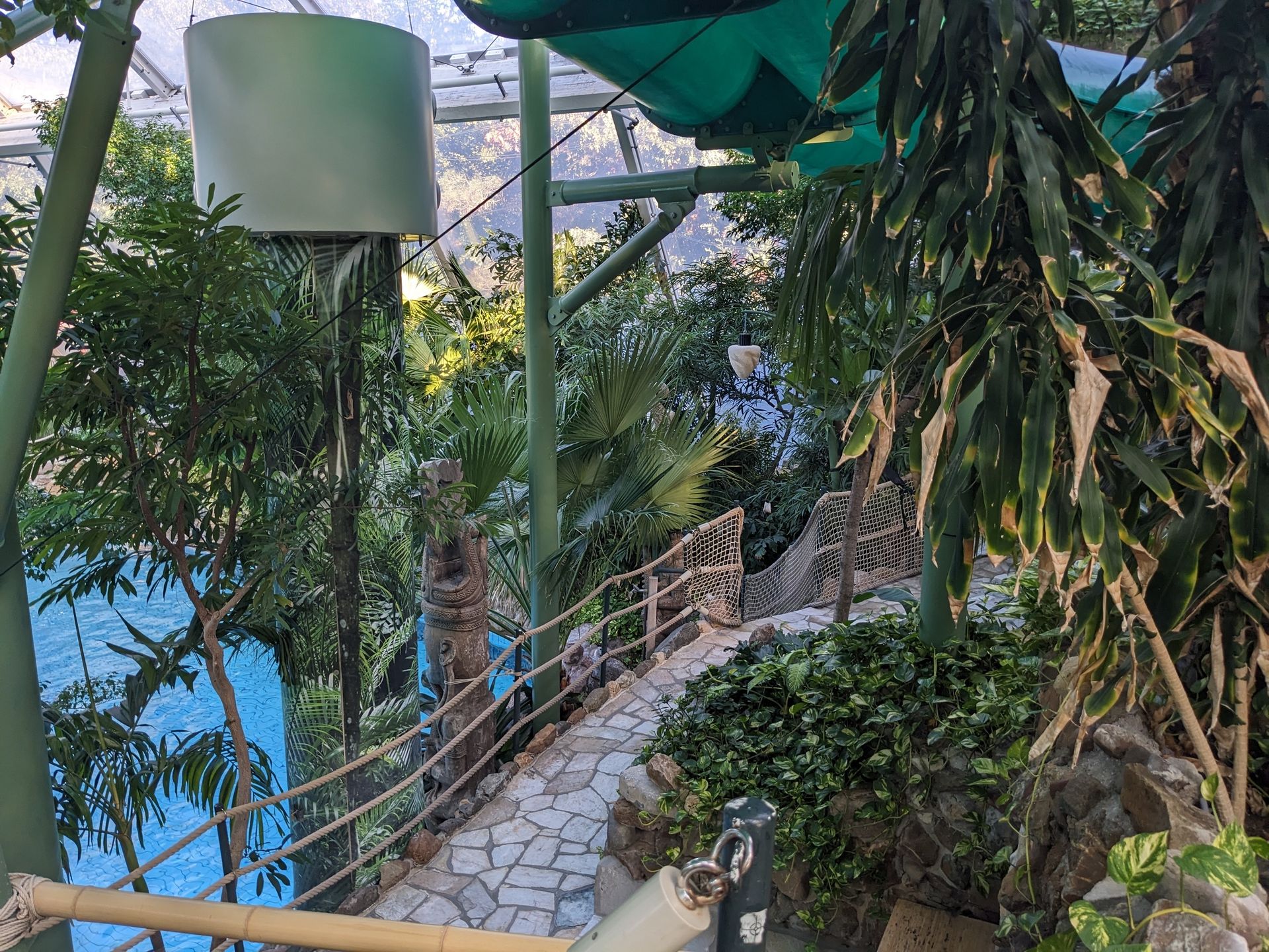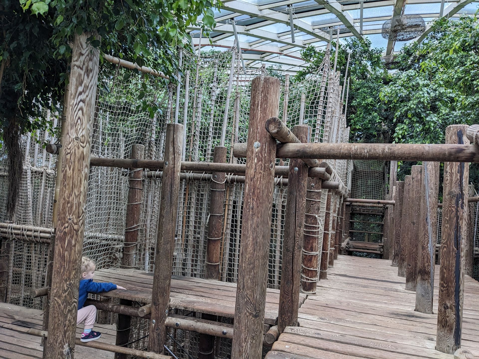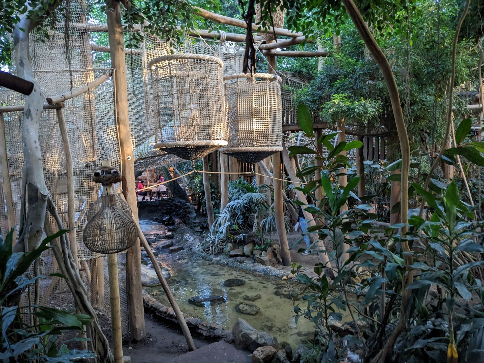 Die Halle ist eine riesige Glaskuppel mit Dschungel darin. Und durch den Dschungel ziehen sich überall Klettergerüste und Spielmöglichkeiten: