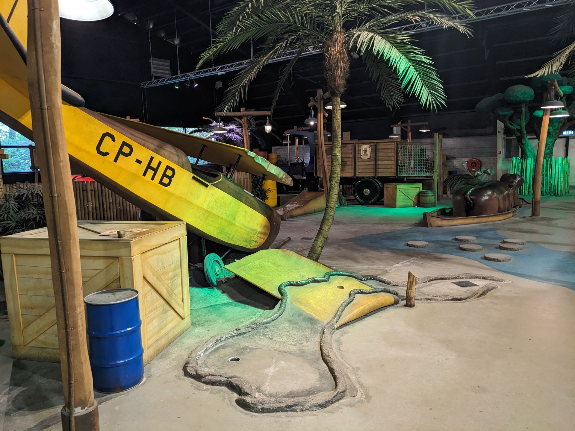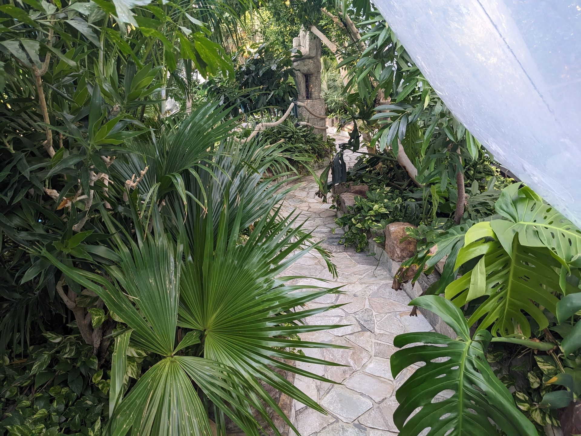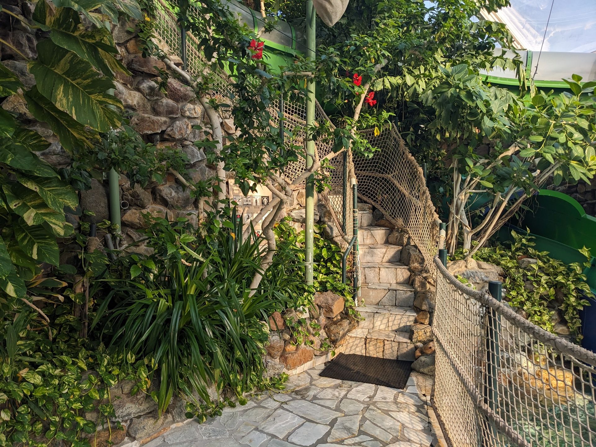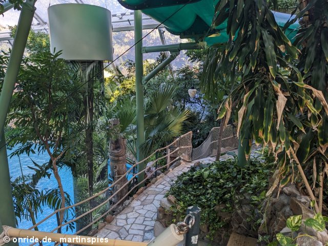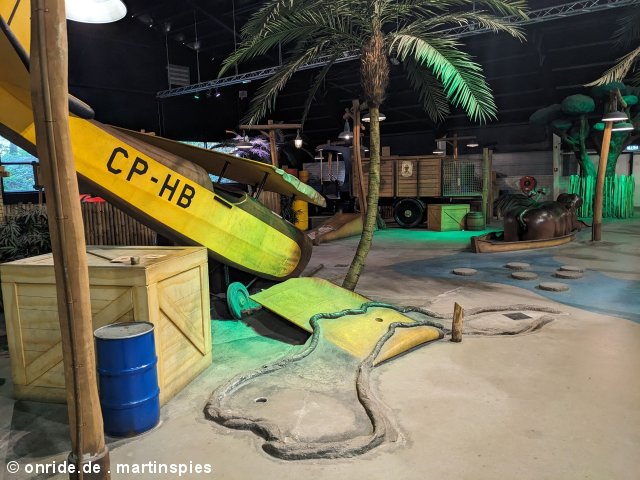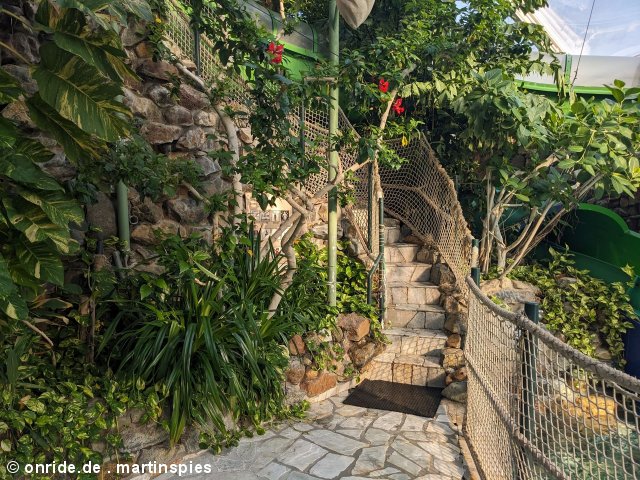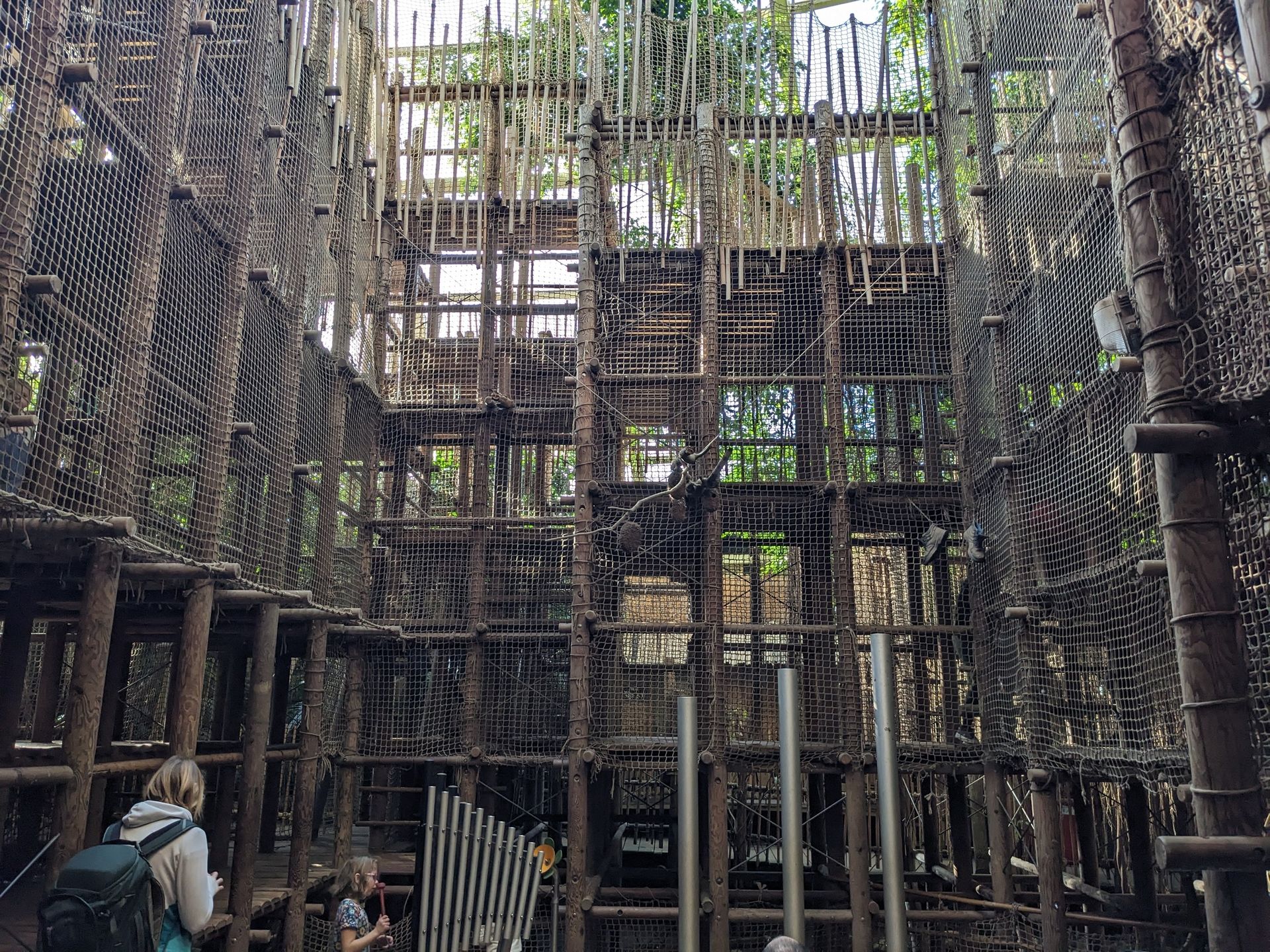 Die Halle ist eine riesige Glaskuppel mit Dschungel darin. Und durch den Dschungel ziehen sich überall Klettergerüste und Spielmöglichkeiten:
