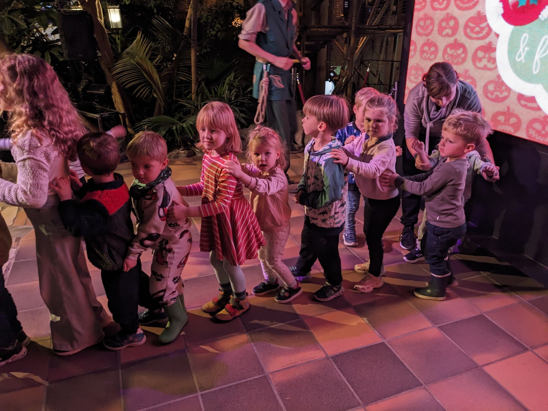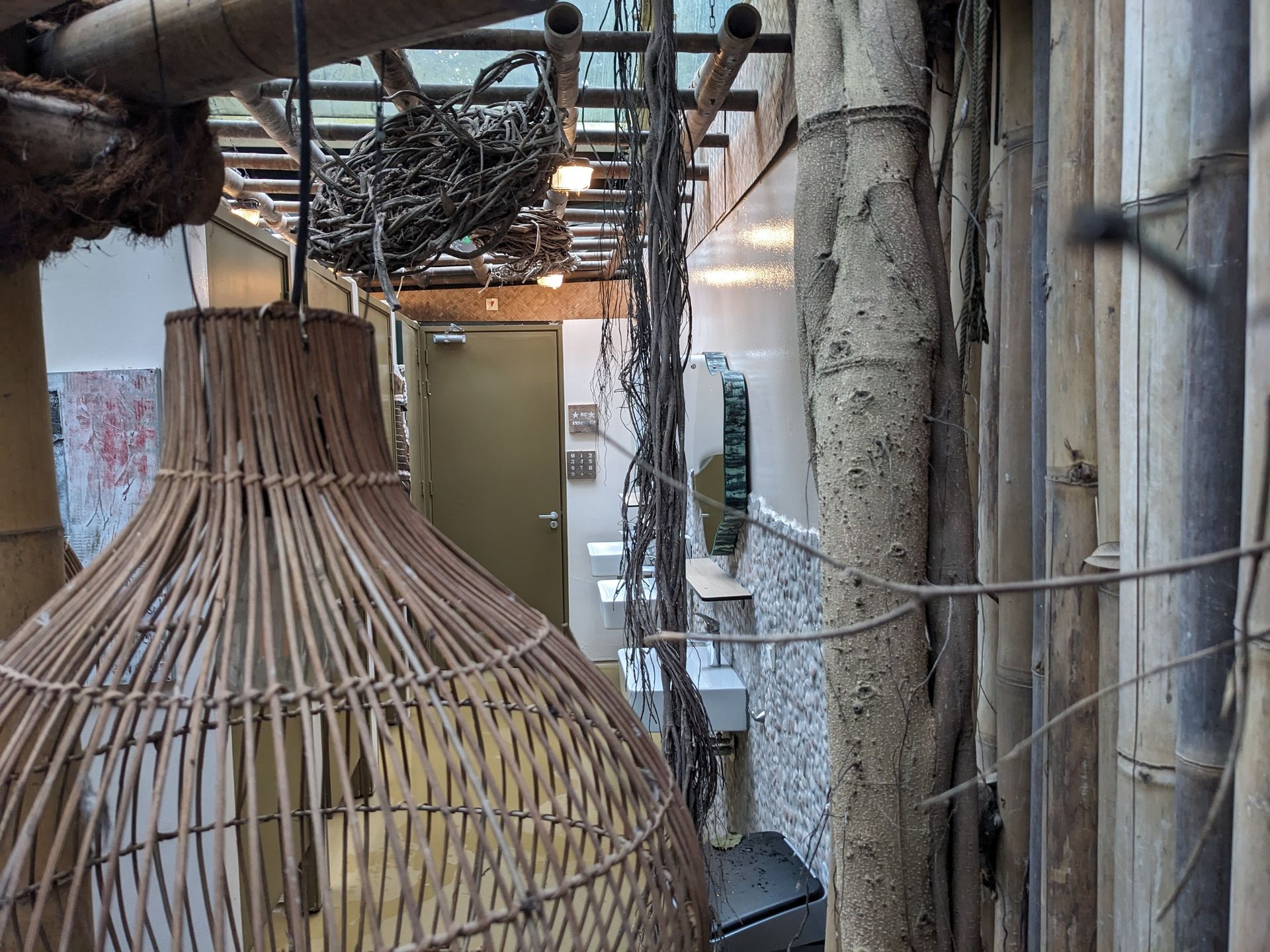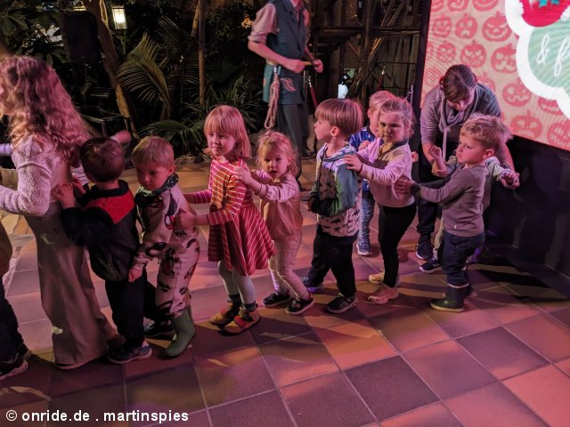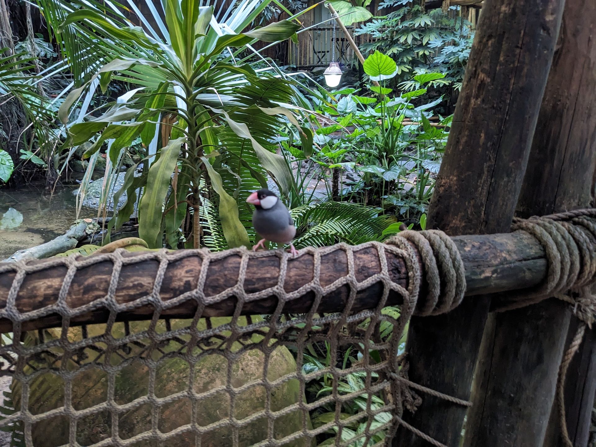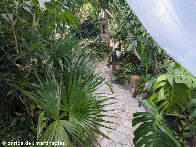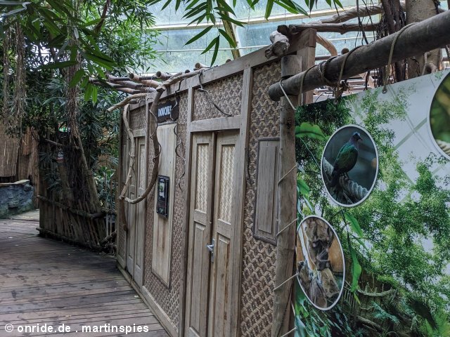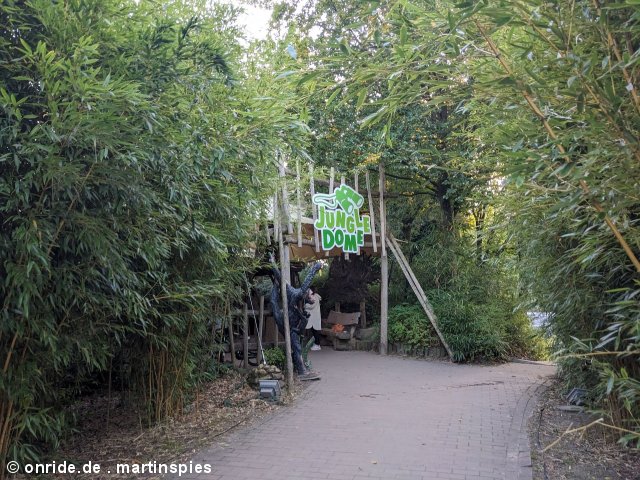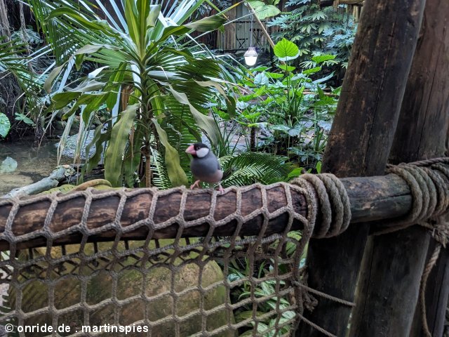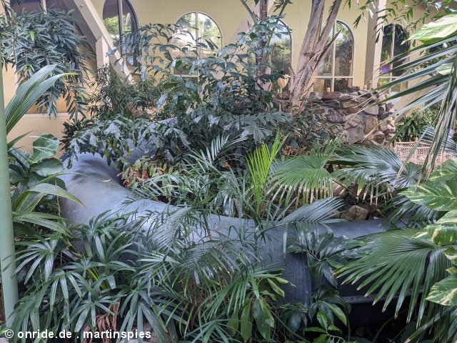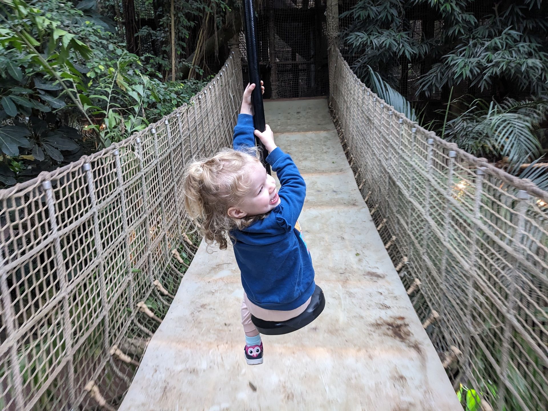 Die Halle ist eine riesige Glaskuppel mit Dschungel darin. Und durch den Dschungel ziehen sich überall Klettergerüste und Spielmöglichkeiten: