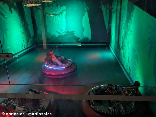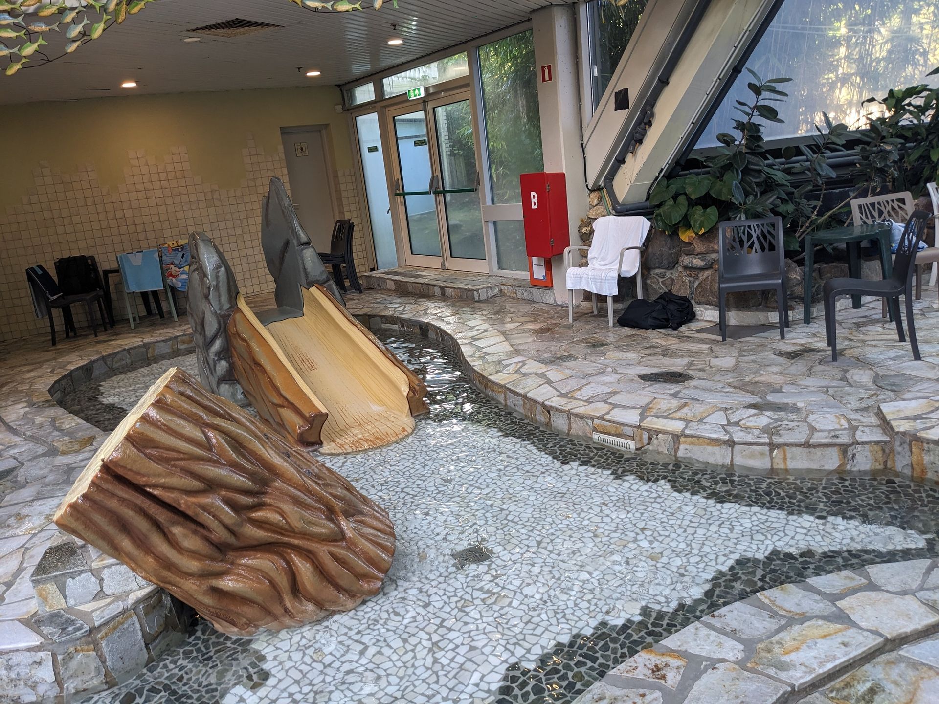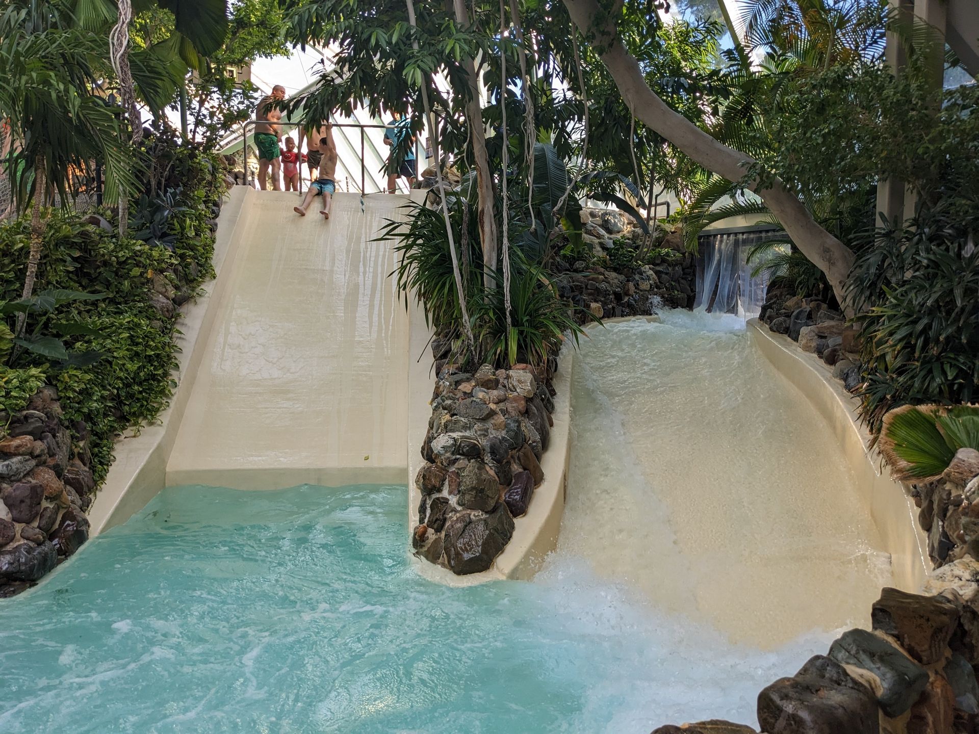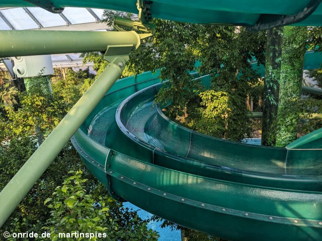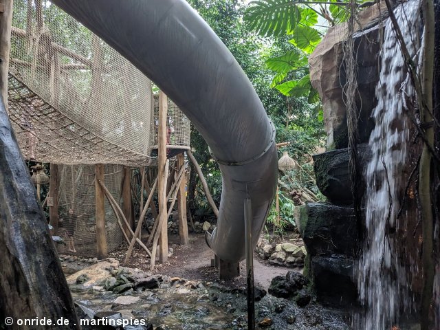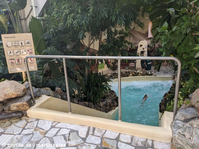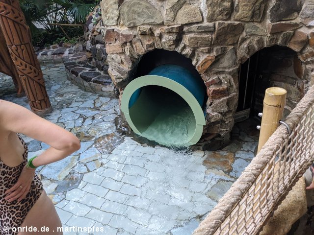 Schließlich führt der Wildwasserfluss wieder nach drinnen, wo eine Steilrutsche mit in den Wildwasserfluss hinein mündet, bzw. in ein kleines Zwischenbecken: