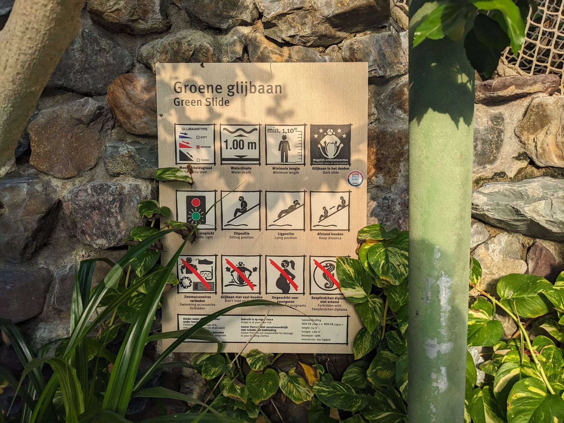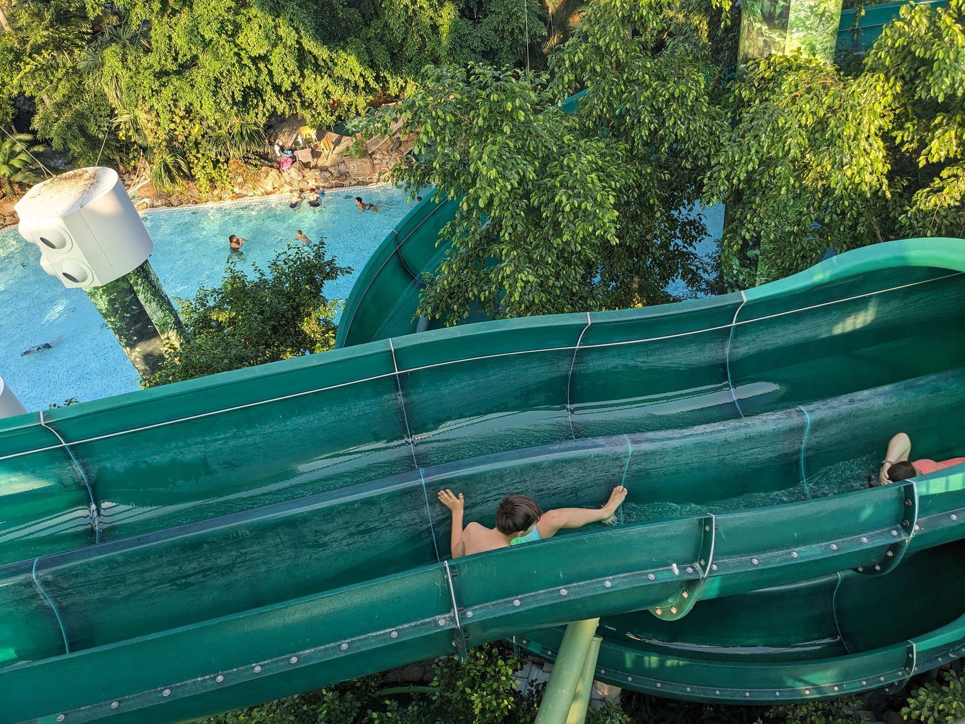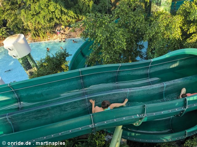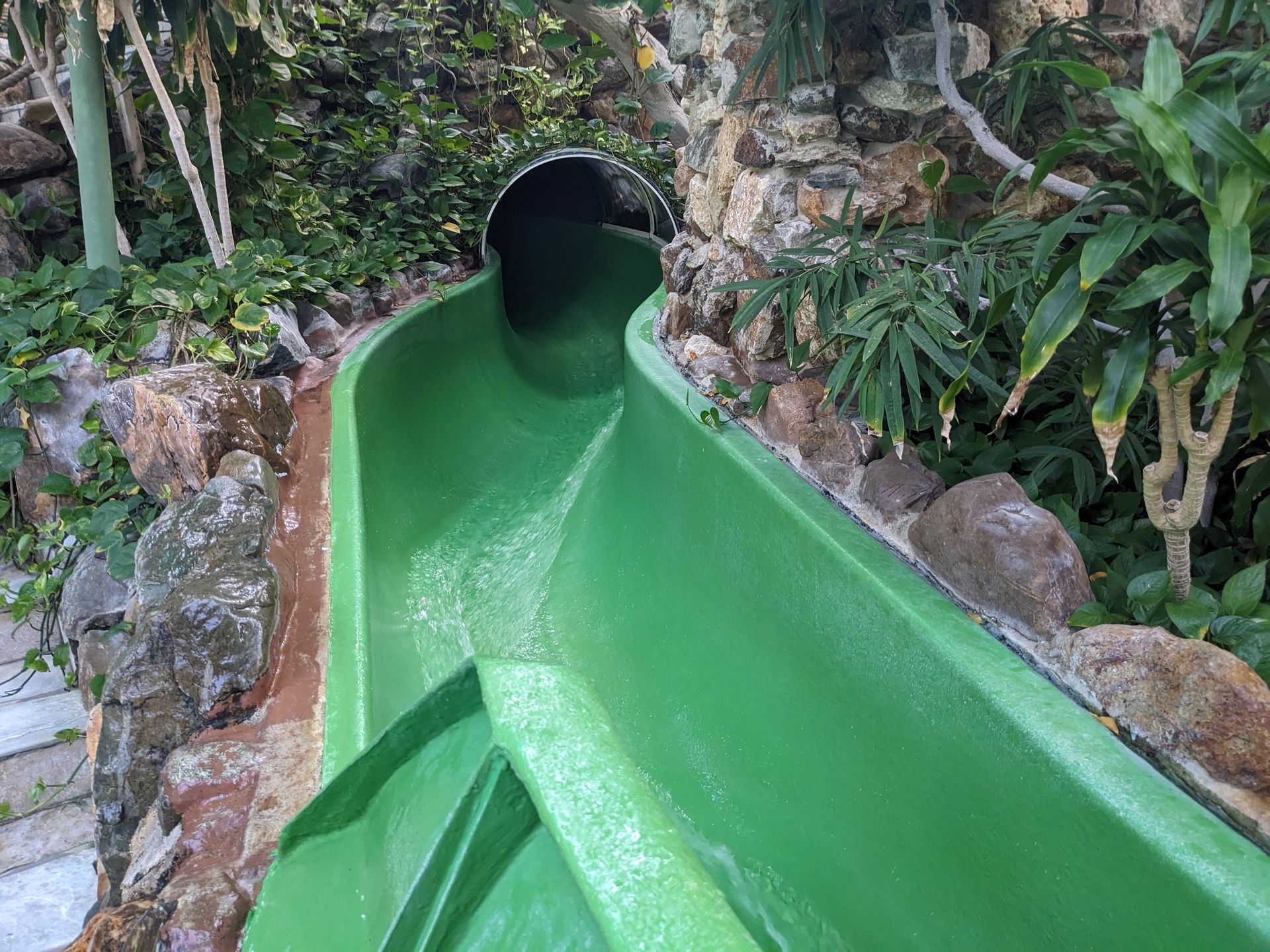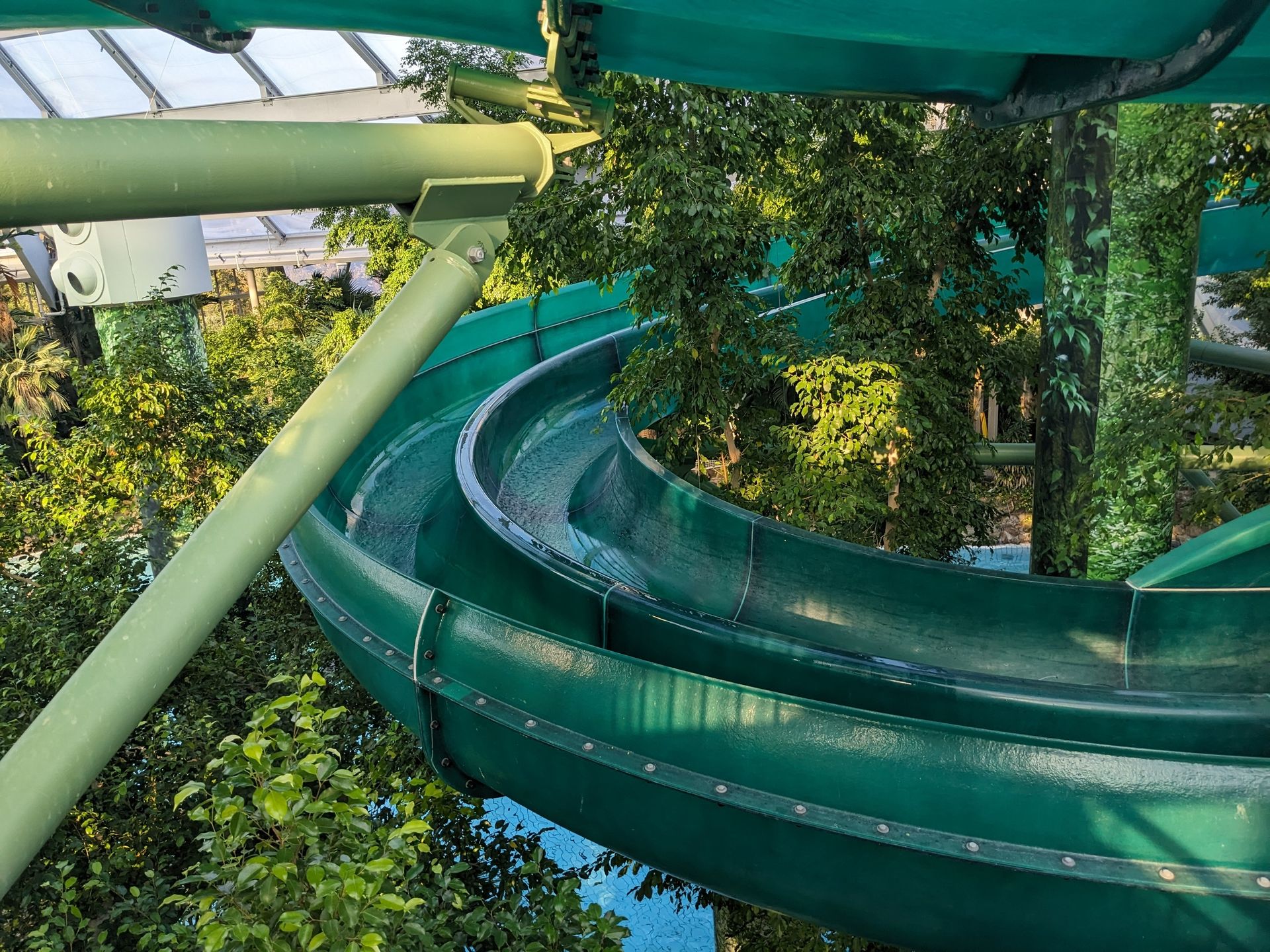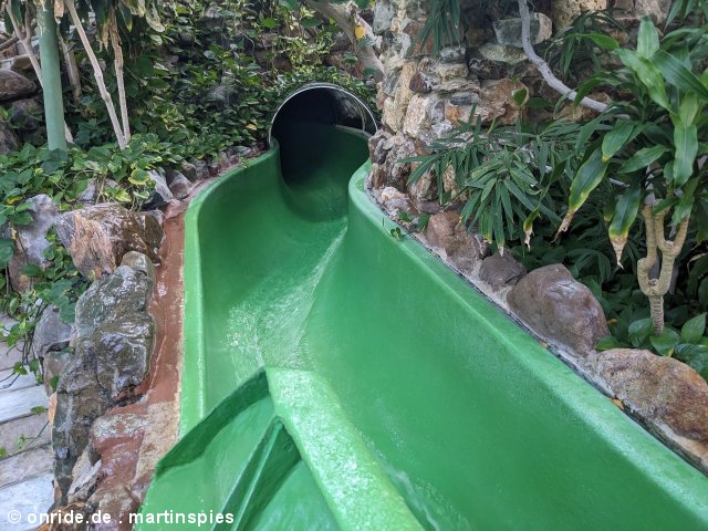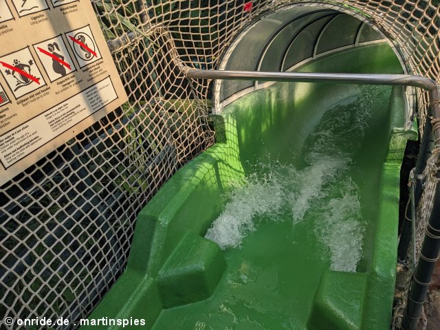 Die grüne Rutsche wurde offenbar mal mit einer neuen GFK-Schicht belegt, so dass die rutsche nicht ganz glatt ist, sondern diese typische Glasfaserstruktur hat. Das stört aber nicht wirklich und die Rutsche ist auch wirklich richtig rutschig. So ist man hier flotter unterwegs also oben in der großen Rutsche und die Strecke mit den ständigen Richtungswechseln ist auch lustig und bringt einen so richtig schön zum Aufschaukeln. Macht mir richtig Spaß!
