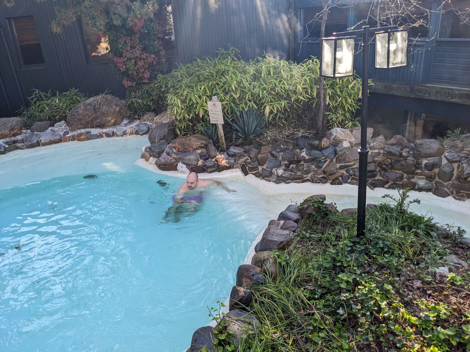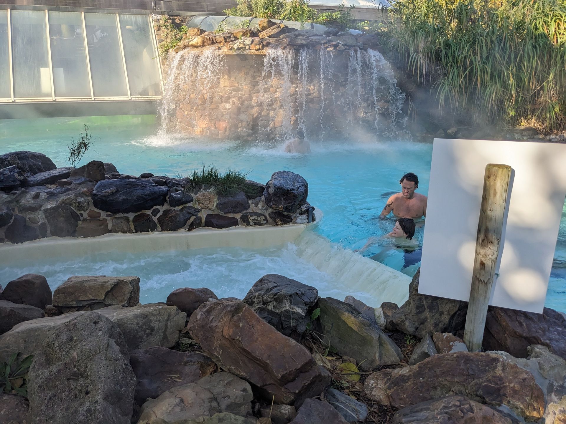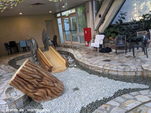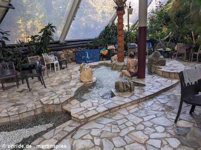 Wenn wir schon mal hier sind, schauen wir uns auch gleich das Außenbecken an. Durch die Lappen geht es nach draußen: