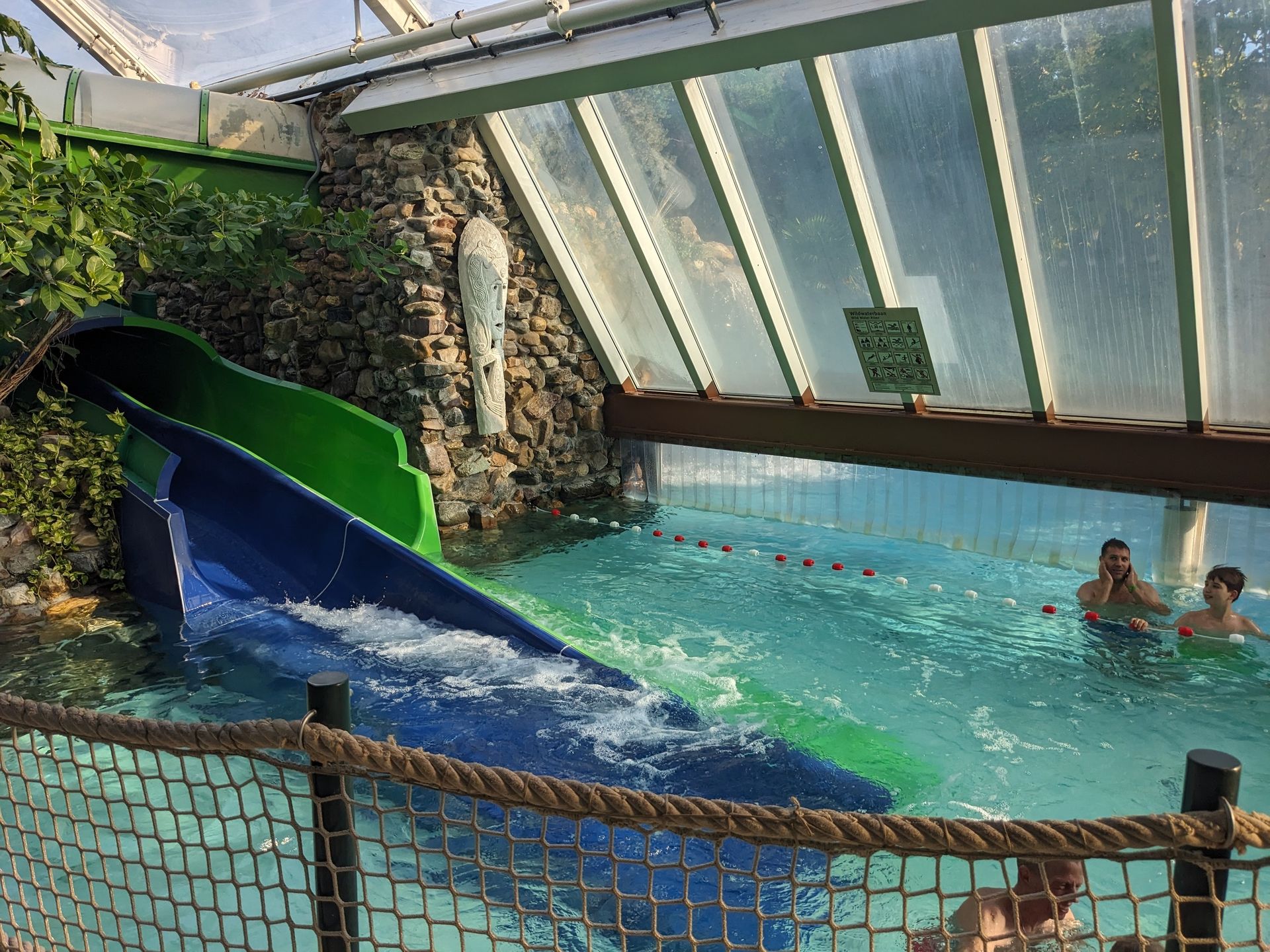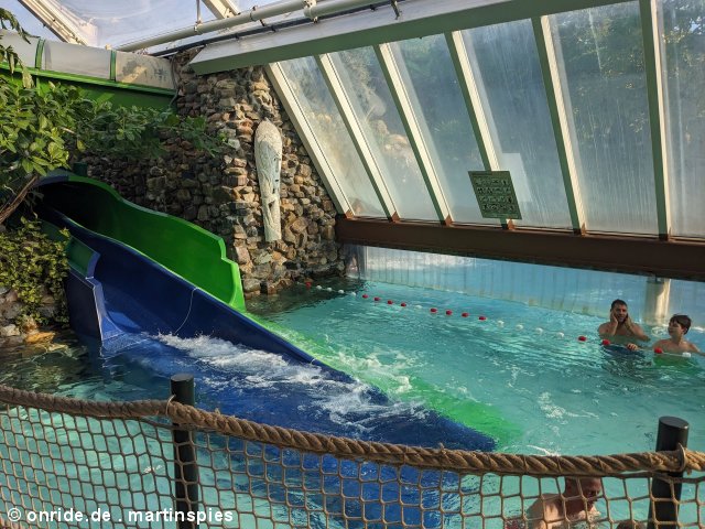 Schließlich endet die die Rutsche per Sofaauslauf im Innenbereich des "Außenbeckens":
