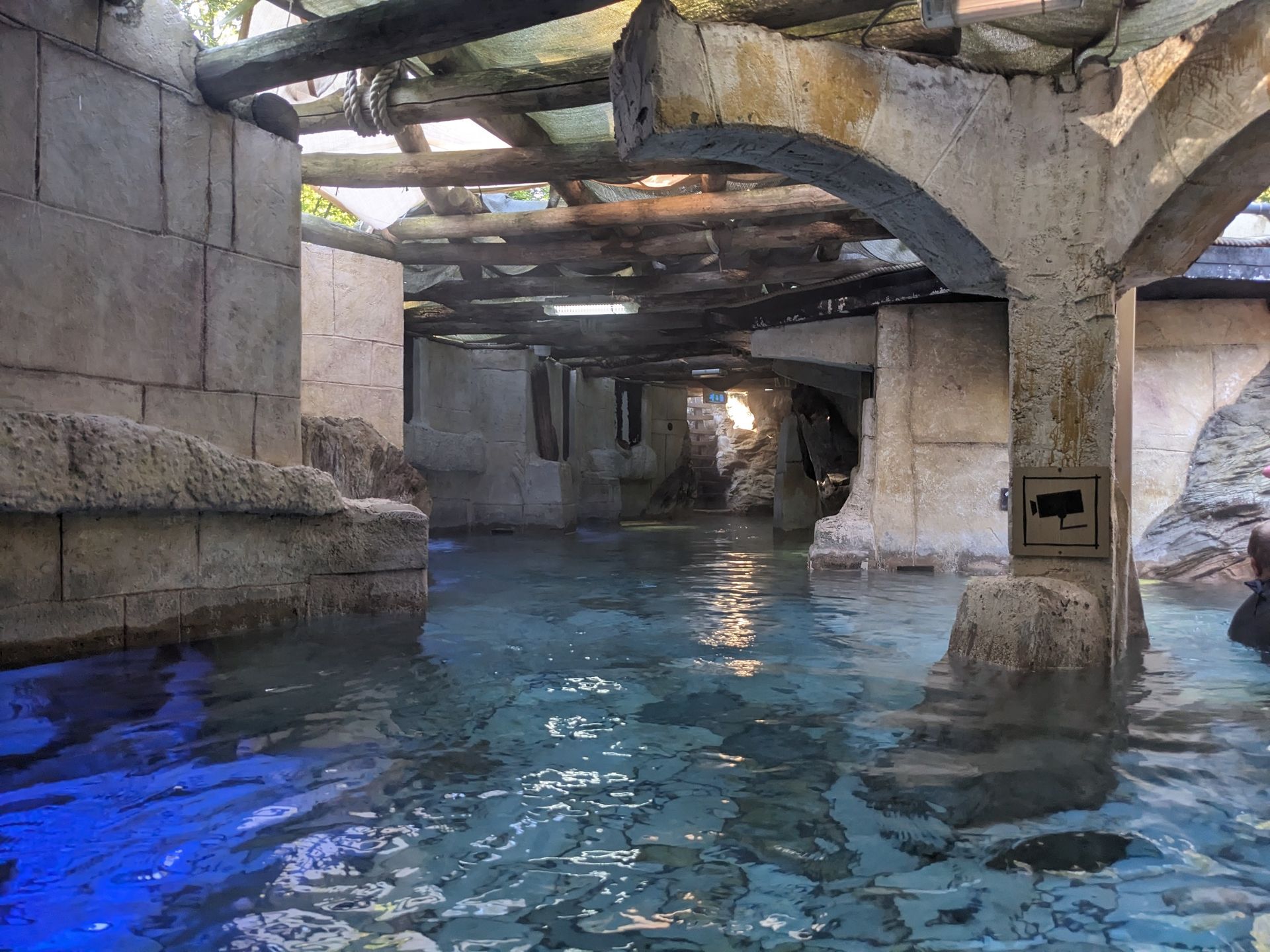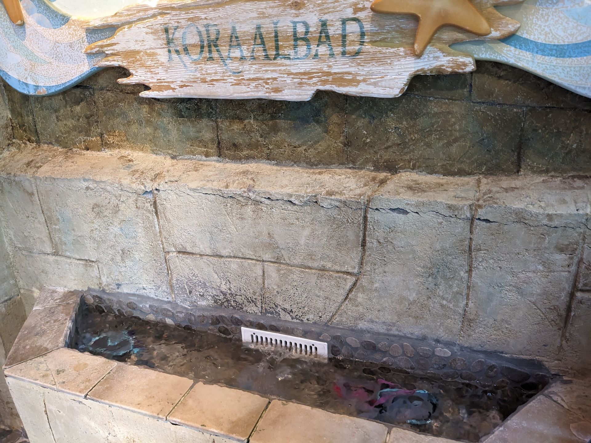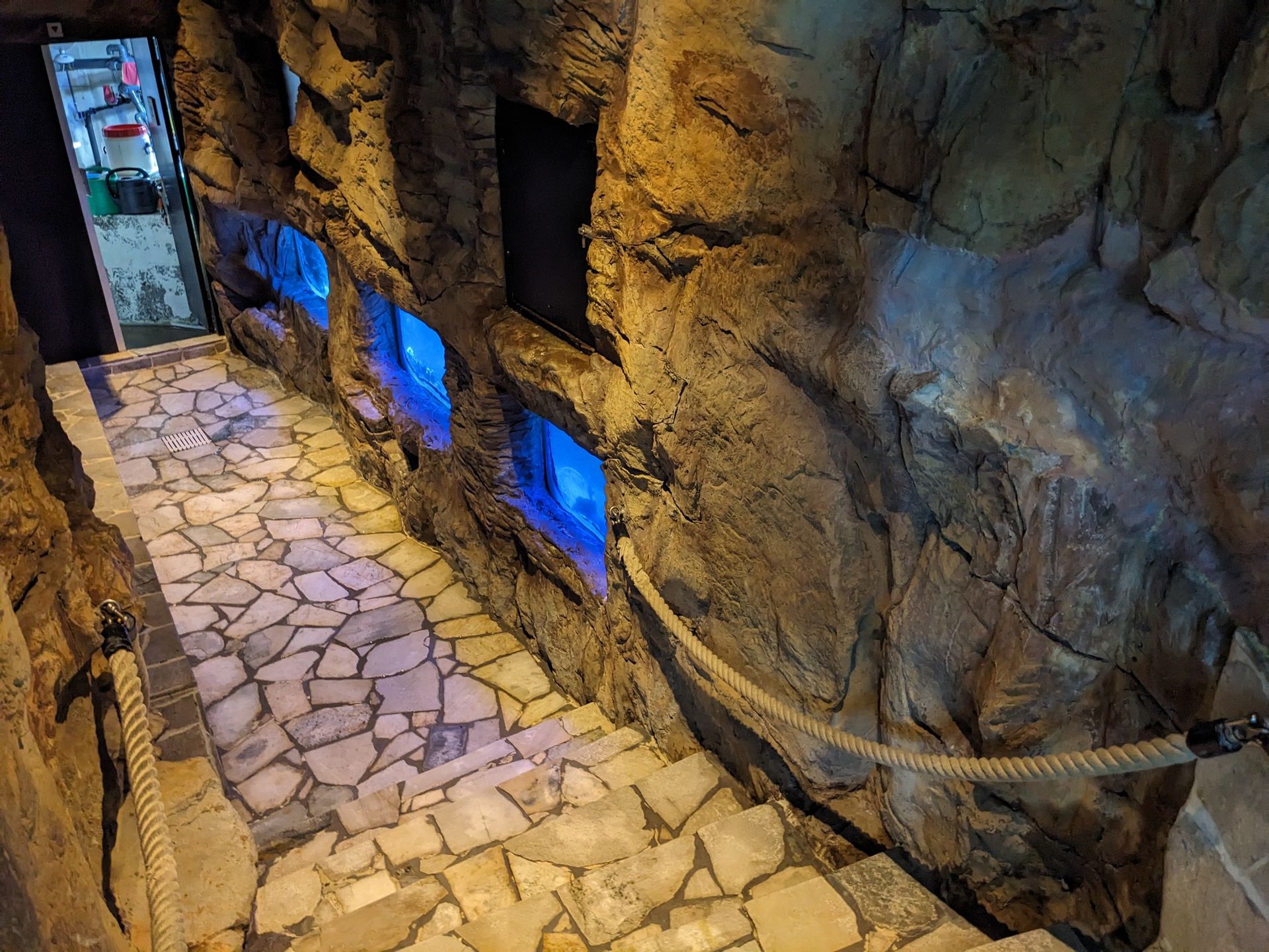 Neben dem Eingang zum Becken gelangt man auch in diesen kleinen Gang, wo man eines der Aquarien von "hinten", ohne zu tauchen, anschauen kann: