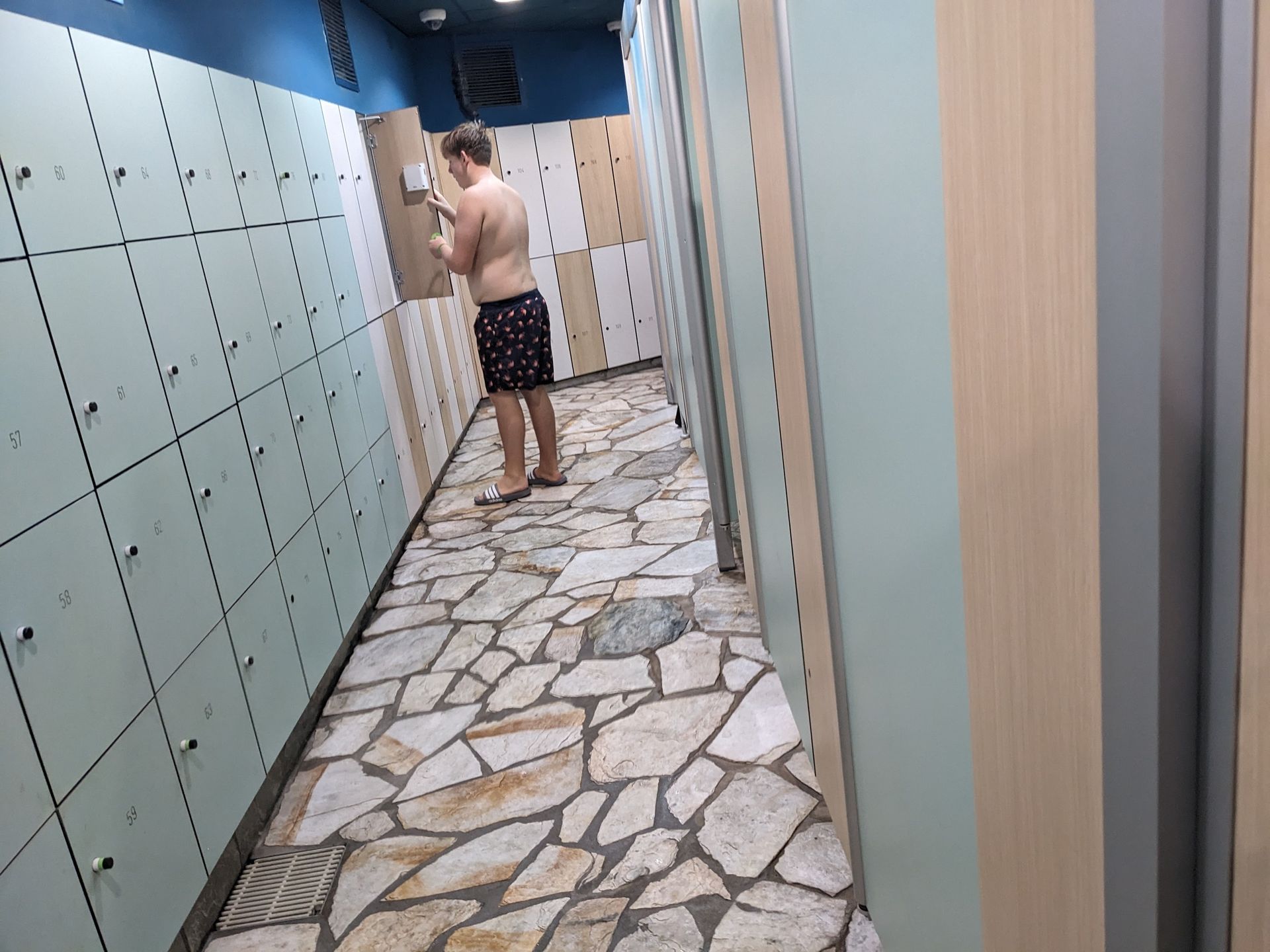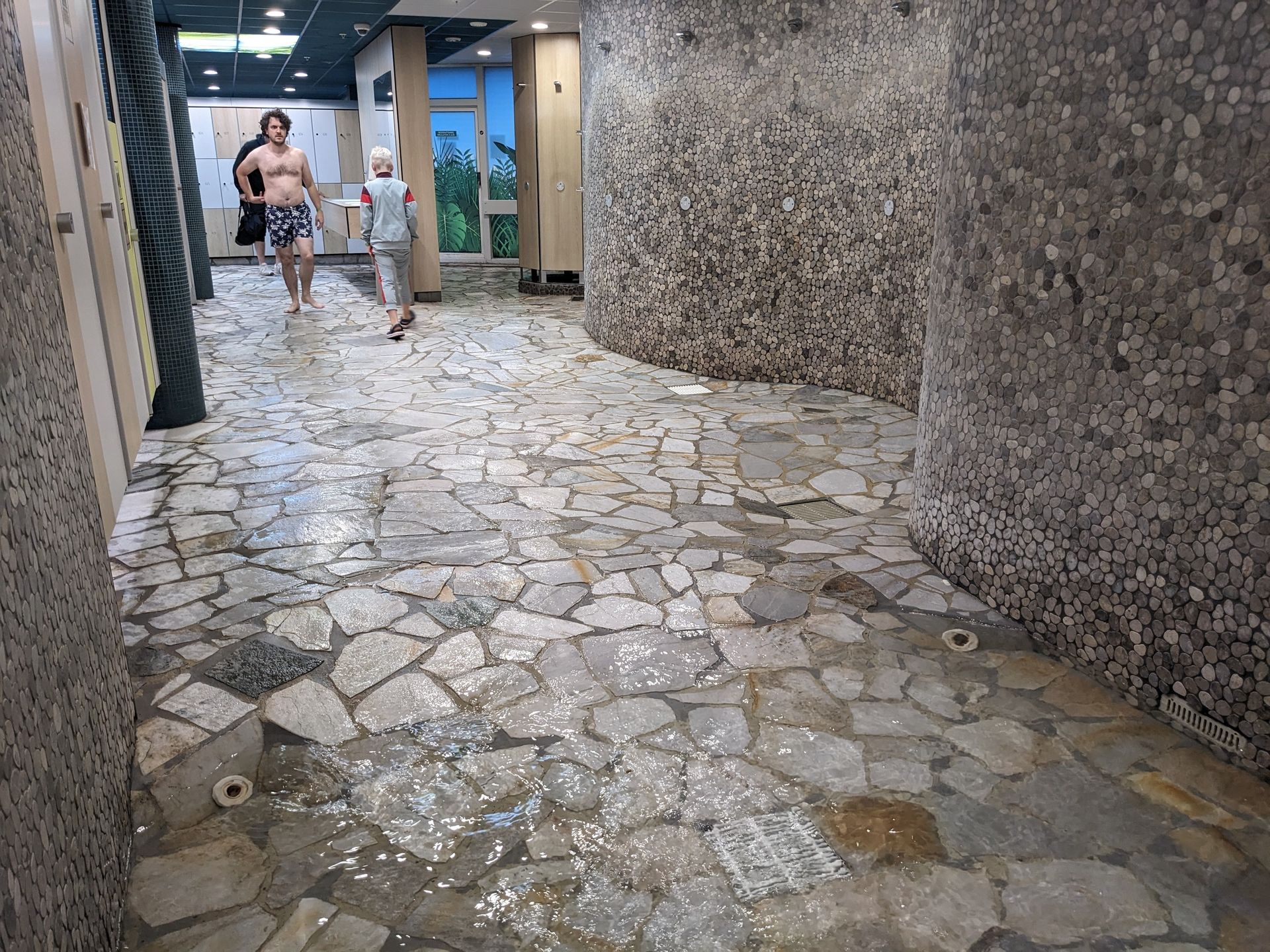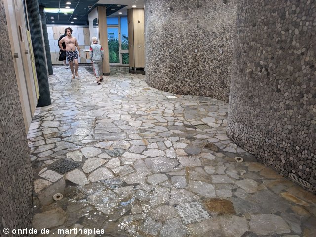 Und dann muss man durch ein Fußbad, wie man es bei uns höchstens aus Freibädern kennt, in die eigentliche Schwimmhalle: