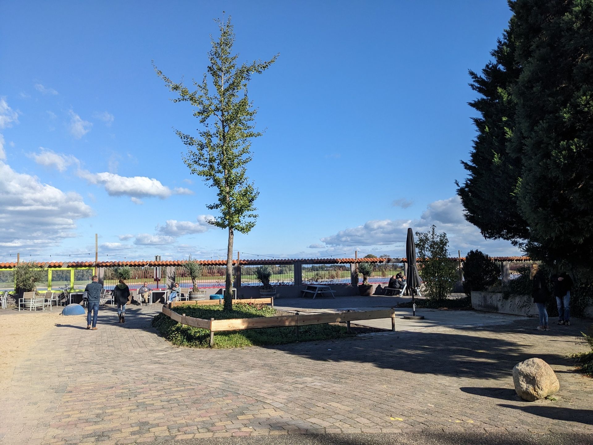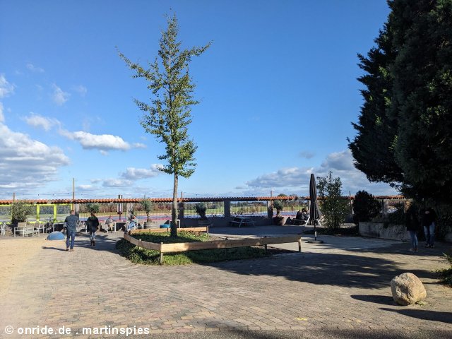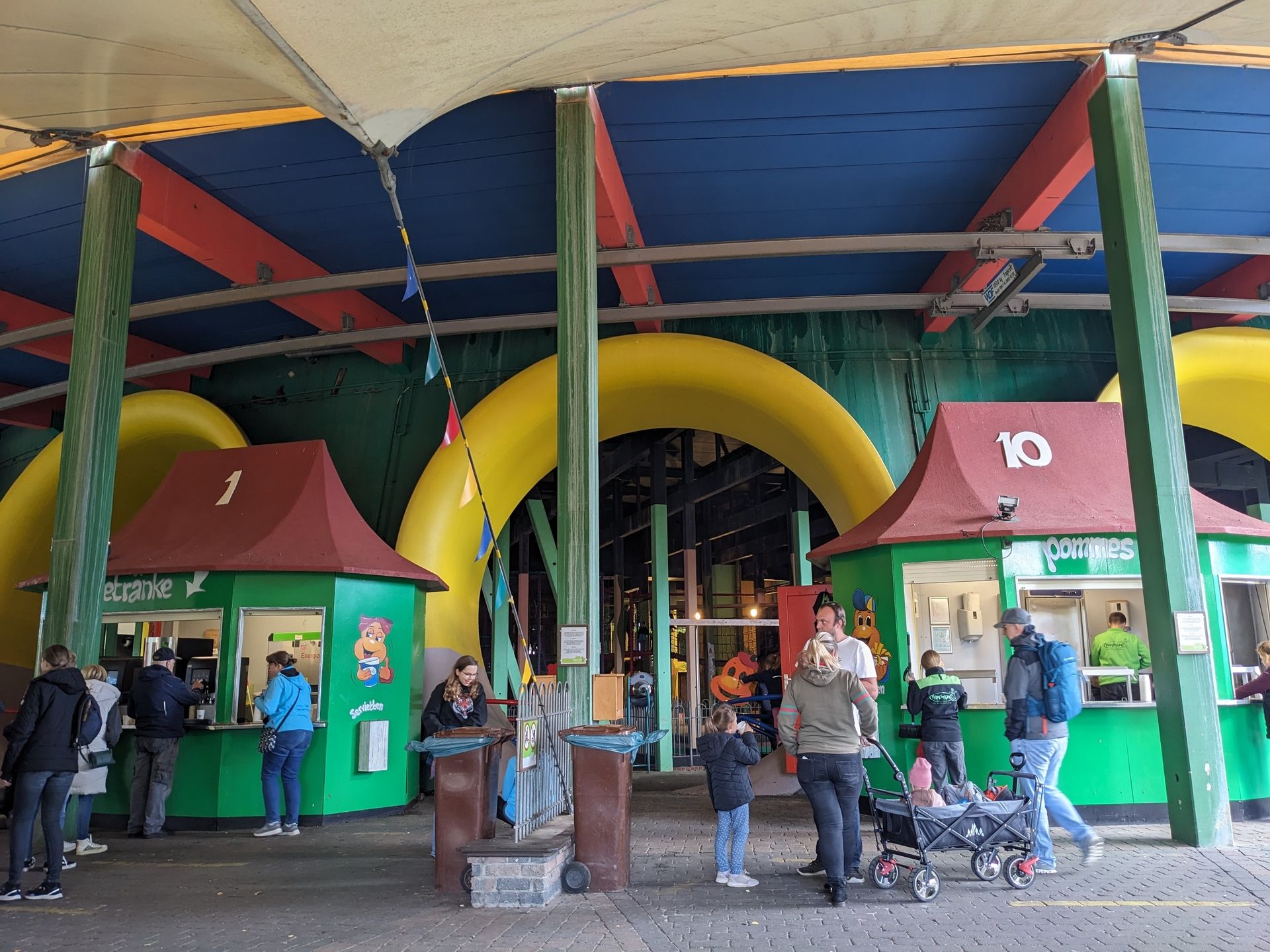 Jetzt aber zum Zentrum des Parks: Der Kühlturm. Während oben der Vertical Swing seine Runden dreht, versteckt sich darunter ein Spielbereich. Und noch viel wichtiger: Essen und Trinken!