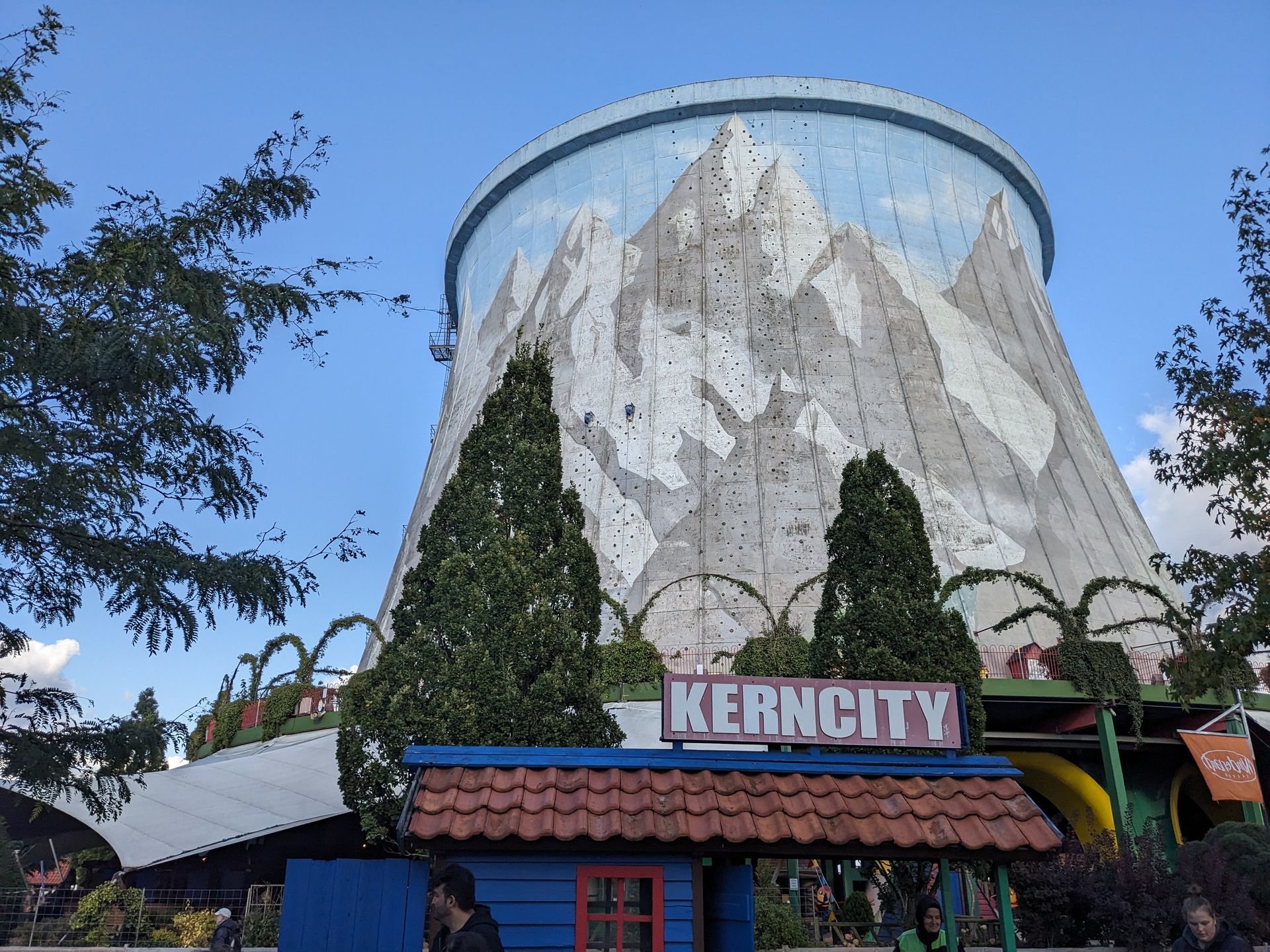 Die Kletterwand am Kühlturm soll angeblich noch in Betrieb sein. Wir haben niemanden klettern gesehen, aber geht auch nur bei passendem Wetter und wenn man sich morgens an der Kasse voranmeldet.