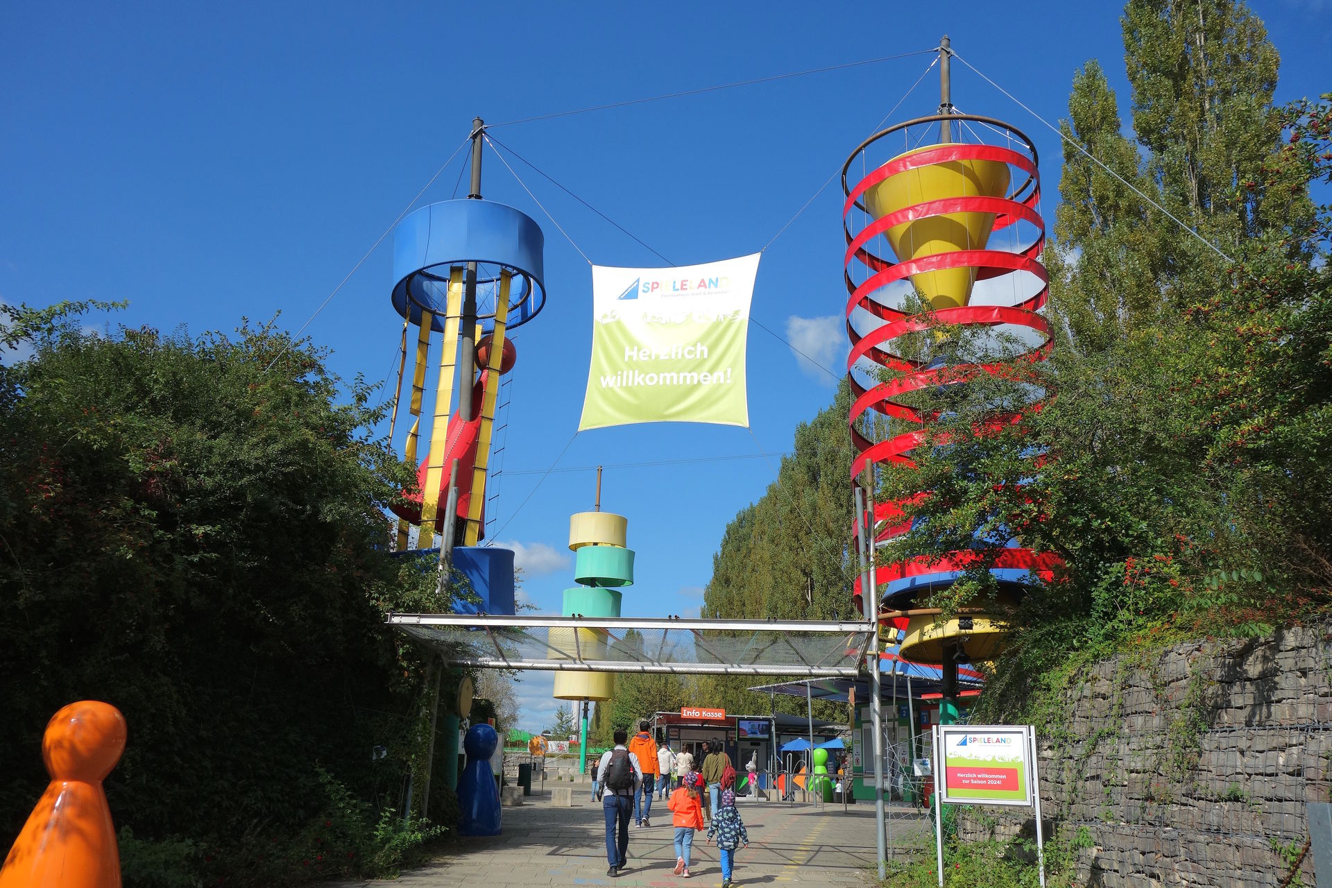 Die allerdings keinerlei Verbindung zur Sendung mit der Maus hat, die ja ursprünglich der Namensgeber des Bereichs war. Nachdem 2024 auch der Freifallturm seinen Bezug zur Maus verlor und stattdessen dem Spiel Lotti Karotti angepasst wurde, erhielt der Themenbereich einen allgemeineren Namen, nämlich FUNtastische Erlebnisinseln. Aus dem Maus Kino wurde dabei die Filmarena, wo aktuell der nicht mehr ganz taufrische Film Turtle Vision läuft. Der Rest des Mini-Mundus-Geländes wurde zum Ravensburger Spieleland Feriendorf umgebaut. Seit 2016 kann man dort nun in verschiedenen Ferienhäusern übernachten, sein Wohnmobil parken oder das eigene Zelt aufschlagen. Der Übergang zum Park ist mit einem Tor versehen, welches zumindest tagsüber einfach offen steht. Eine Übernachtung kann entsprechend nur in Kombination mit dem (vergünstigten) Parkeintritt gebucht werden. Der frühere Eingang von Mini Mundus dient als Rezeption. Und da wir näher an diesem als am eigentlichen Parkeingang geparkt hatten und nicht nochmal durchs ganze Spieleland zurück laufen wollten, nahmen wir den Weg am großen Feriendorf-Restaurant vorbei, um den Park dort zu verlassen. Statt mit einem Tunnel unter geht es hier mit einer Brücke über die Straße zum Parkplatz. Die Rezeption am Ende der geschwungenen Rampe war jedoch unbesetzt und die Drehkreuze waren arretiert. Zum zweiten Mal an diesem Tag wollte uns ein Park nicht gehen lassen und wir mussten wie im Flipped Funpark wieder über die Drehkreuze rüberklettern.