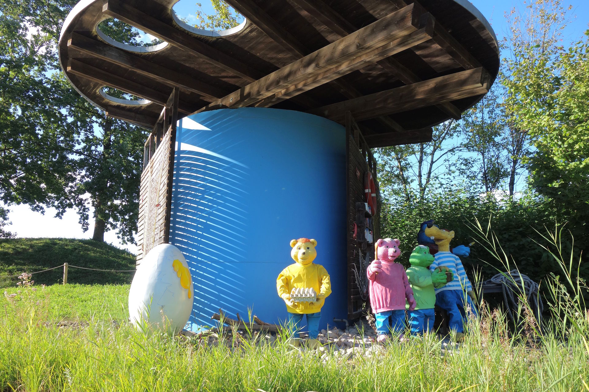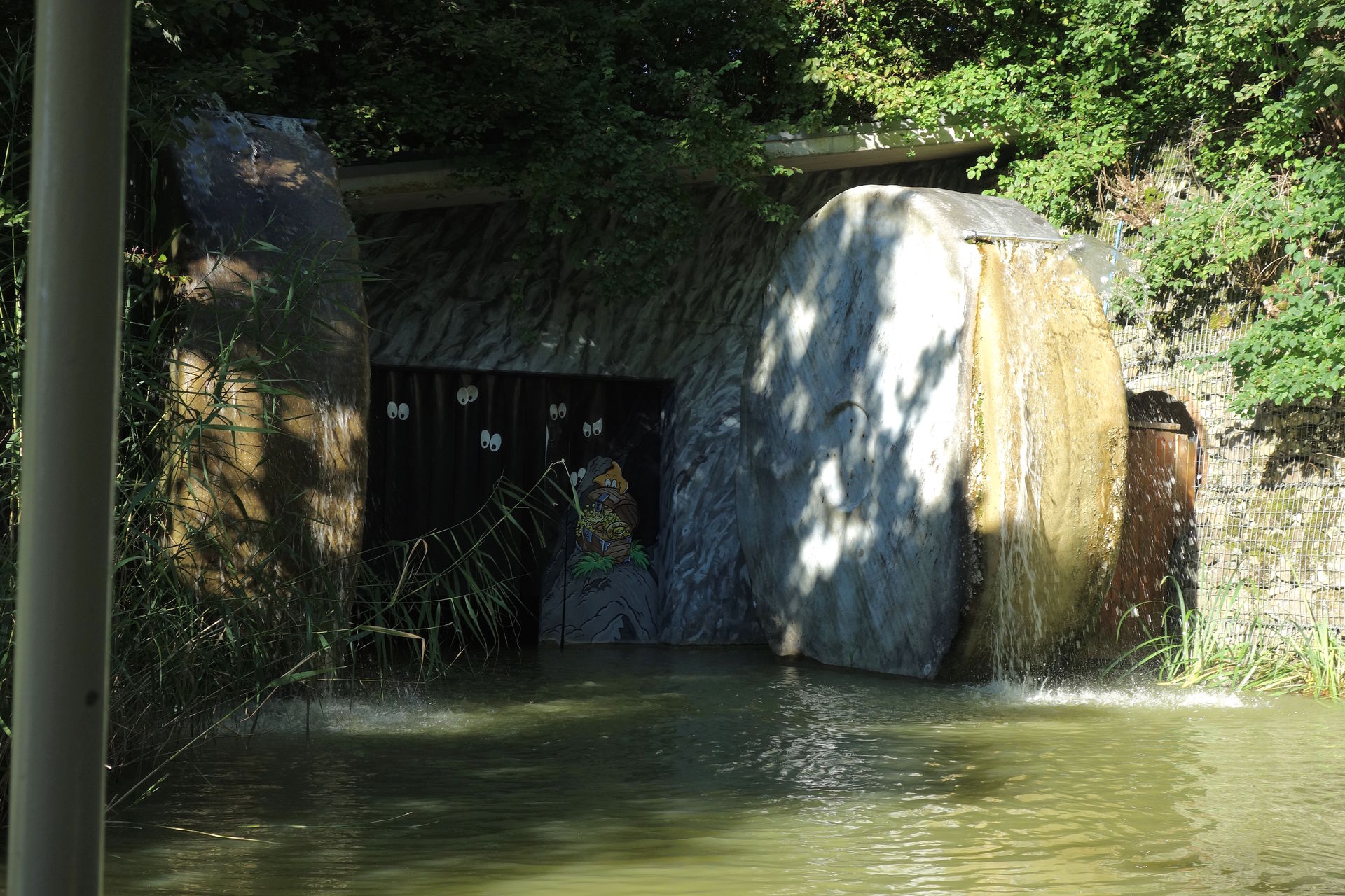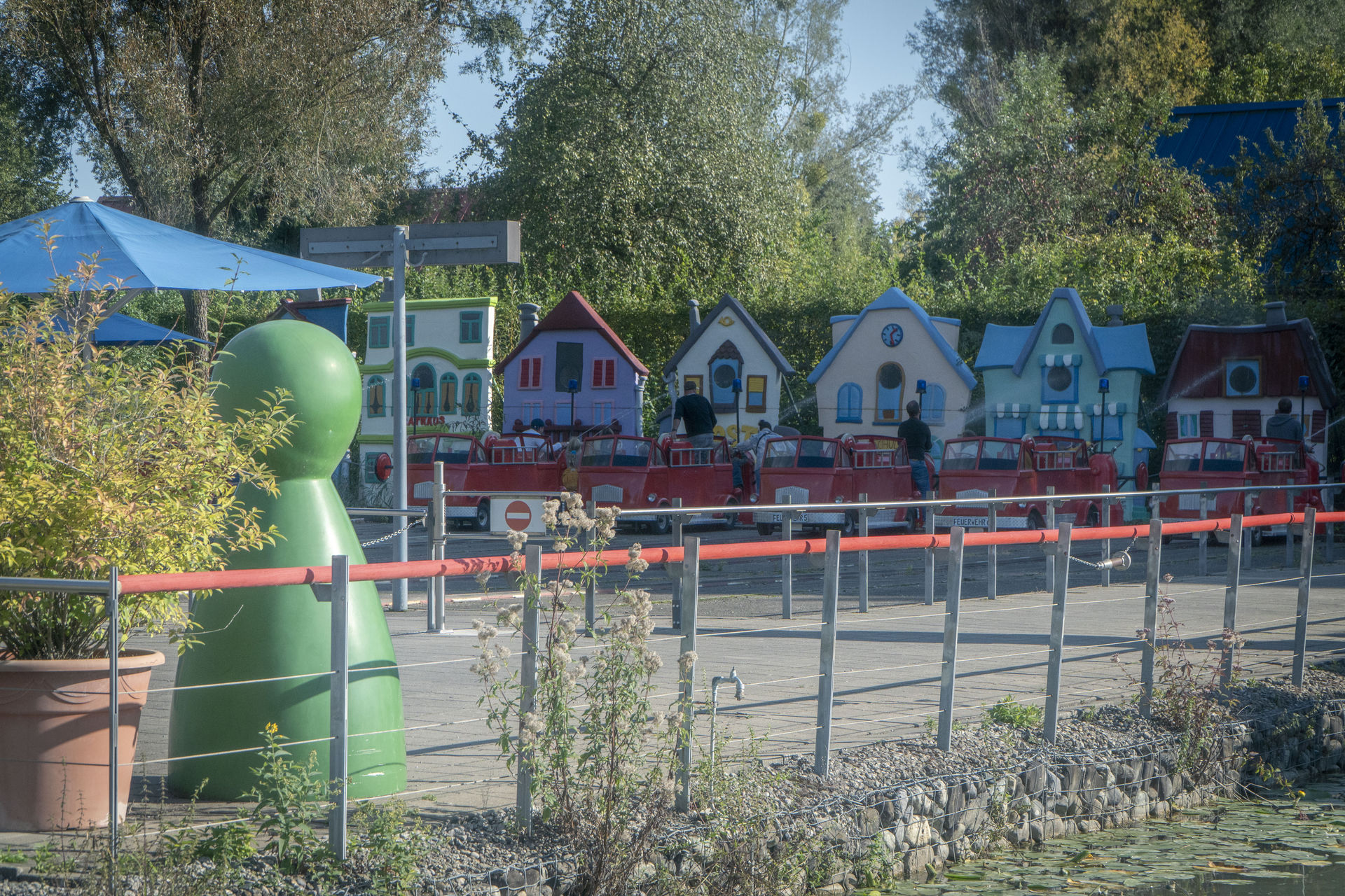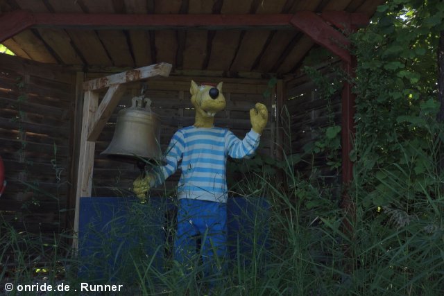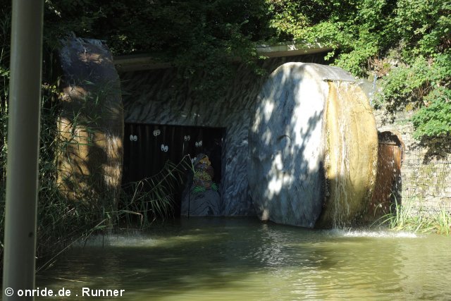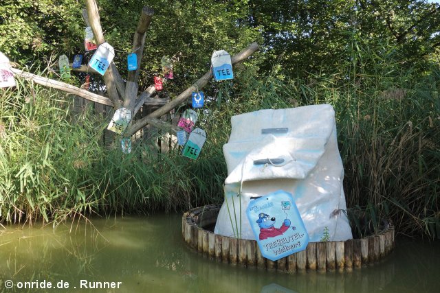 Dort nimmt man sich zum Start eine Papierkarte mit vier Figuren, stempelt ein und bahnt sich dann seinen Weg durch das Labyrinth, dessen Wände wie in der Spielvorlage tatsächlich zum Teil verschoben werden können. Ziel ist es, die vier Figuren in den Ecken des Labyrinths zu finden und mit einer Stempelzange auf der Karte abzustempeln. Hat man alle vier Stempel gesammelt, geht es wieder nach draußen, wo man anhand des Zielstempels sieht, wie lange man gebraucht hat. Außerdem gibt es einen kleinen Autoscooter, der nach dem Spiel Tempo, kleine Schnecke gestaltet wurde. Auf eine Achterbahn zur Umsetzung des Spiels Das Nilpferd in der Achterbahn hat man 2002 leider verzichtet. Stattdessen gab es als Abwandlung Das Nilpferd in der Wasserbahn in Form eines Wasserski-Rondells, zu dessen Eröffnung sogar ein echtes Zwergflusspferd zugegen war. Ob dessen Ausbruch echt oder gestellt war, vermag ich nicht zu sagen. Aber eine Google-Suche offenbart, dass es zumindest ein gleichnamiges Flusspferd (Elsbeth) gab, das bei einem Gastspiel des Zirkus Fliegenpilz in Fürth ausgebüxt war und erst nach einer Woche wieder eingefangen werden konnte. Die Story hatte einen derartigen Medienrummel zur Folge, dass es in Fürth bis heute eine Elsbeth-Statue gibt und es soll auch weitere Ausbrüche des Flusspferds gegeben haben, die laut Wikipedia aber eher inszeniert gewirkt haben sollen. Namensgleichheit samt Ausbruch lassen mich daher vermuten, dass man auch im Ravensburger Spieleland auf den Zug aufgesprungen war und es sich um einen fingierten Ausbruch des selben Flusspferds gehandelt haben könnte.