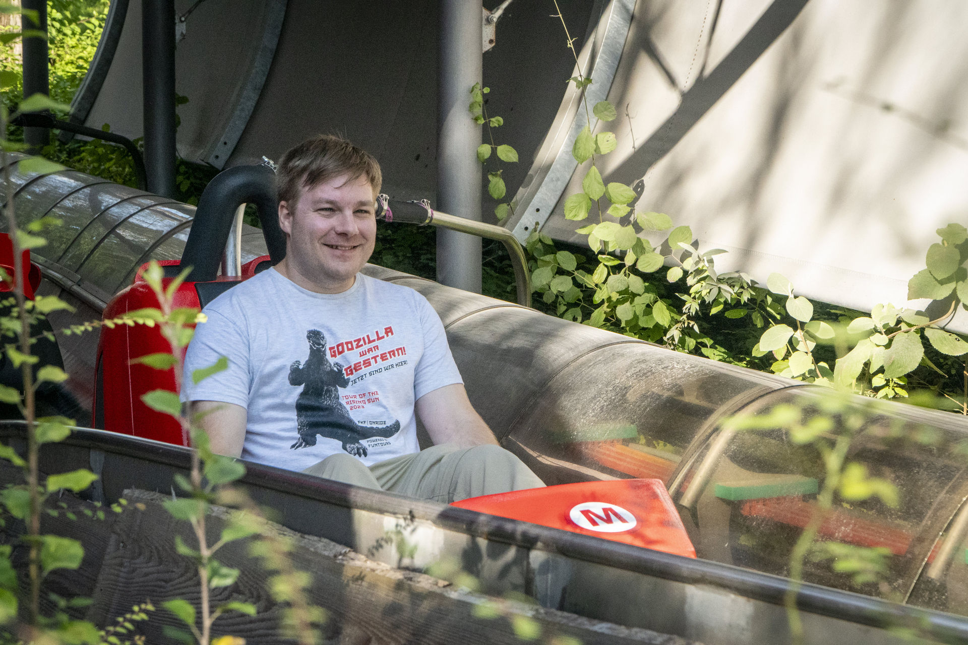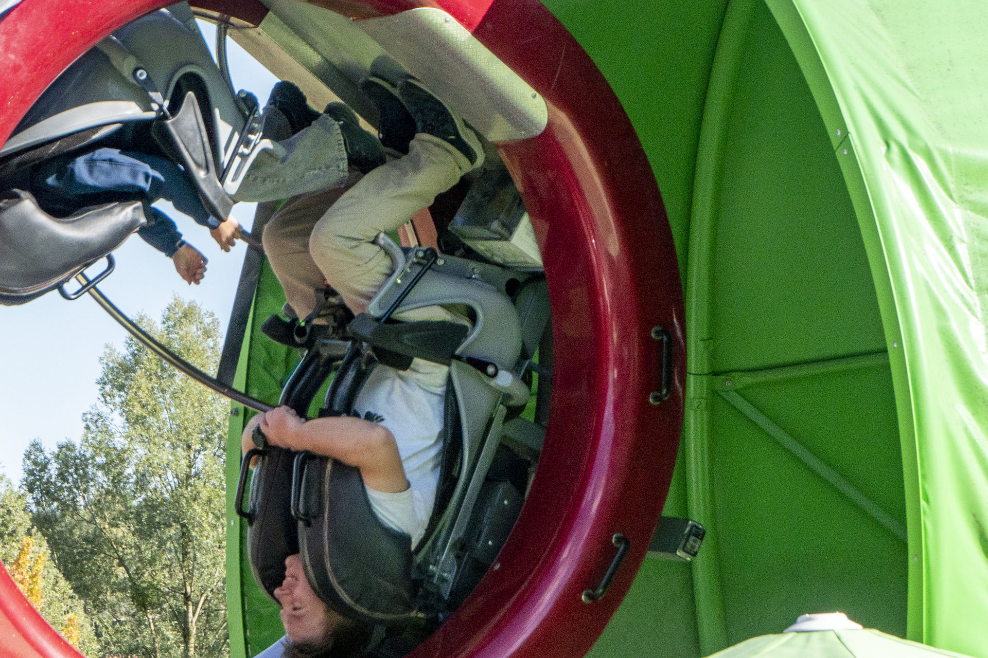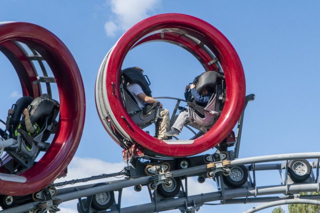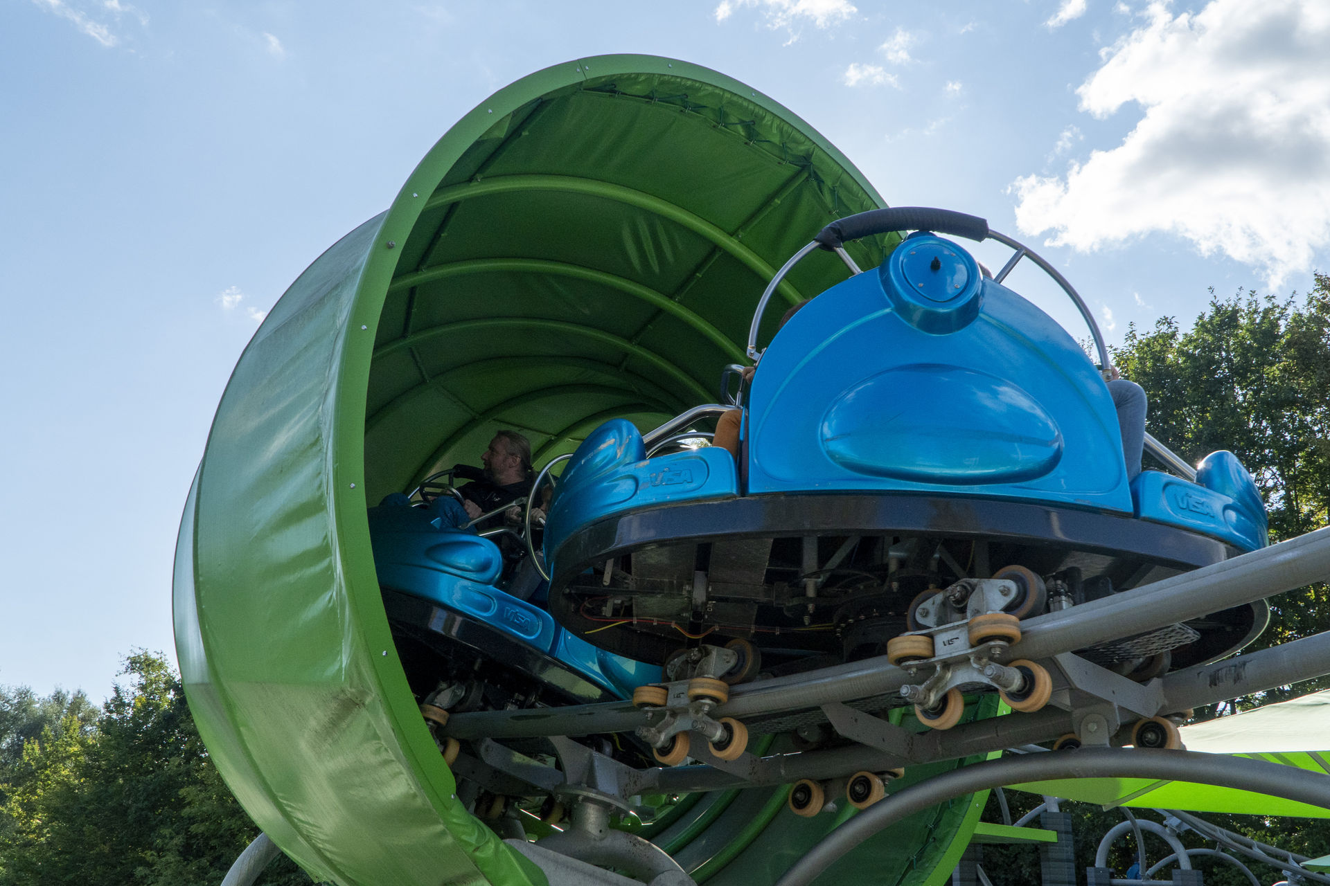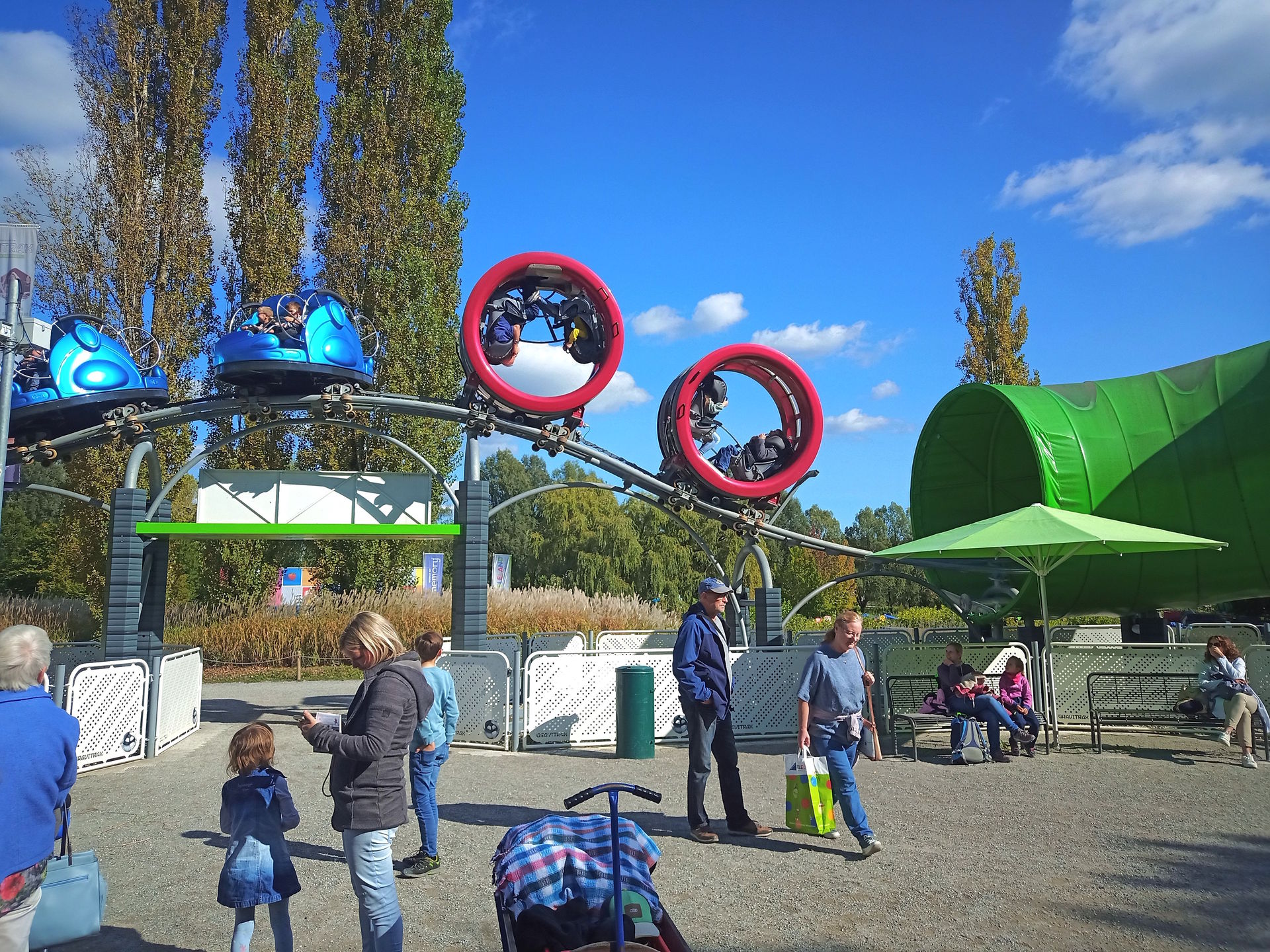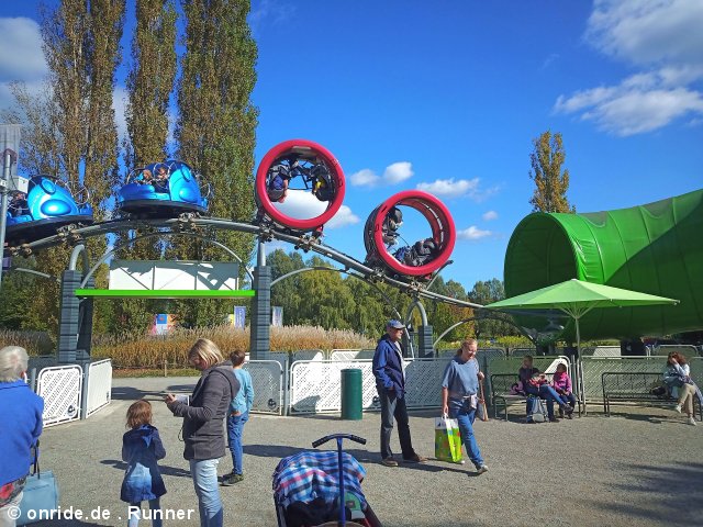 SBF Visa. Das Besondere dabei: Es gibt zwei Wartebereiche, denn der Zug besteht aus zwei verschiedenen Wagentypen. Während die drei hinteren Wagen die klassischen Spinning-Coaster-Gondeln sind, wird der Zug von zwei Überschlagsgondeln angeführt. Diese Hamsterrad-Wagen hatte SBF erstmals 2019 auf der IAAPA präsentiert, das Ravensburger Spieleland gehörte zu den ersten Parks, die eine Achterbahn mit derartigen Gondeln eröffnete. Allerdings finden in so einem Hamsterrad nur zwei Passagiere Platz, während die Spinning-Gondeln jeweils vier Plätze bieten. Macht hier also 4 Hamsterrad-Fahrgäste zu 12 Spinning-Fahrgästen pro Fahrt. Trotz der entsprechend längeren Wartezeit wollten wir aber natürlich die Überschlags-Gondeln ausprobieren. Als nach etwa 20 Minuten ein Single Rider gesucht wurde, schickte Stormrunn3r mich vor, damit ich anschließend noch die Bobkart-Bahn fahren könnte.
