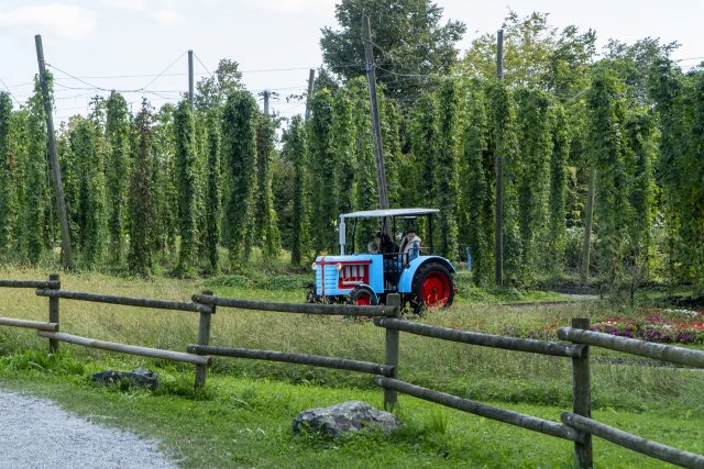 Hier dreht sich - wie unschwer zu erkennen ist - alles um das Thema Landwirtschaft und Bauernhof. Vorbei am Tierkarussell wird der Weg von einigen bunten Scheunen gesäumt. Eine davon beherbergt die Gaststätte Grüne Oase, eine zweite den Biergarten. Auch der Wartebereich der oben zu sehenden Traktorfahrt zwischen diversen echten Feldern mit Mais, Kartoffeln, Hopfen und mehr befindet sich nebst einem Dorfladen natürlich in einer Scheune. Gegenüber wurden die echten Ponys 2010 durch eine elektrische Ponyreitbahn ersetzt. Bei der 2022 neu eingerichteten OMIRA-Milchscheune steckt die Behausung sogar schon im Namen. Dort können sich die Besucher unter anderem am Kühemelken versuchen, oder auch eine Boulderwand erklimmen. Besonders cool fand ich die John Deere Agrar-Erlebniswelt, bei der die Kleinen mit Trettraktoren umherfahren, verschiedene Güter laden und sogar einen echten John-Deere-Traktor erkunden können. Der grün-gelbe Landmaschinenhersteller löste 2023 die deutsche Marke Claas als Sponsor des Spielparcours ab - inklusive neuer Trettraktoren im entsprechenden Design. Ebenfalls erneuert wurde 2022 die Parkeisenbahn, welche das Spieleland von der Grünen Oase aus mit einer zweiten Station in Käpt'n Blaubärs Wunderland einmal umrundet. Die formschöne Schwäbische Eisenbahn wurde in den Ruhestand versetzt und kann nur noch als Standmodell neben den Gleisen bewundert werden. Der neue BRIO Express kommt mit neuester Technik (sprich, Elektroantrieb) daher, das Design ist einem (aus meiner Sicht leider) modernen Reisezug des namensgebenden Holzeisenbahnherstellers aus Schweden nachempfunden, den Ravensburger 2015 übernommen hatte.