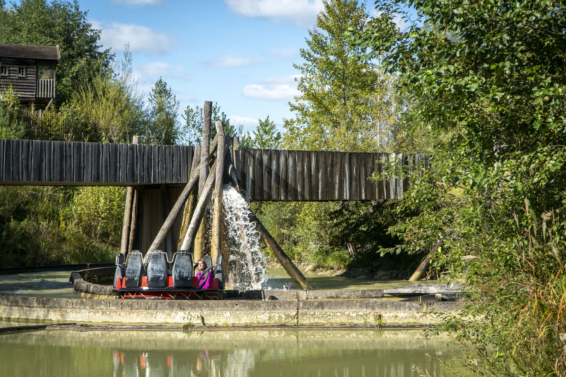 Die Wartezeit betrug glücklicherweise nur gute 10 Minuten, dann konnten wir zusammen mit einer Mutter und ihren Kindern in einem der 9 Personen fassenden Boote Platz nehmen. Von der Station aus schipperte man zunächst mit ein wenig Geschlängel zum Liftturm, wo die Fahrt leider von einer gewissen Wartezeit unterbrochen wurde. Denn zunächst musste das vorausgefahrene Boot endlich nach oben befördert werden, ehe der Lift mit einem ordentlichen Platsch wieder ins Wasser eintauchen und unser Boot aufnehmen konnte. Dann ging es aber in Windeseile hinauf auf eine Höhe von 12 Metern, wo das Boot schließlich die Abfahrt hinuntergeschoben wurde. Die sich im etwa 4 Meter hoch aufgeständerten Auslauf auftürmende Welle wurde glücklicherweise größtenteils vor dem Boot hergeschoben und die Insassen wurden lediglich durch Spritzwasser erfrischt. Nach einer Rechtskurve fuhr man auch schon in den eher von Hafema-Raftings bekannten Strudel ein, der hier einen Durchmesser von satten 26 Metern aufwies. Der wird seit 2015 von einer spektakulären Hängebrücke überspannt, die den bereits 2009 eröffneten Spielplatz Abenteuer-Camp mit Kletterberg ergänzt. Nach etwa anderthalb Runden im Strudel wurde das Rafting-Boot in eine 2,5 Meter überwindende Abfahrt gezogen, an deren Ende tatsächlich mal eine kleine Welle ins Boot schwappen konnte.