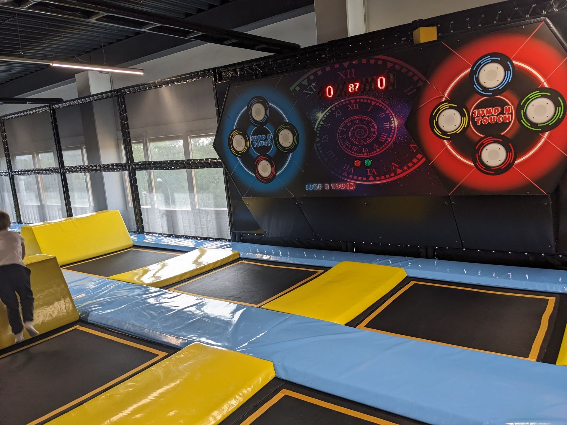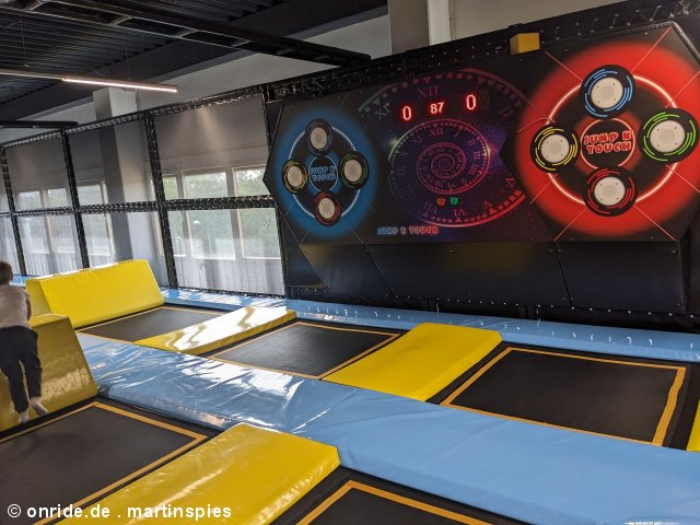 Um das zentrale Klettergerüst herum sind weitere Angebote angeordnet. Z.B. diese Trampoline: