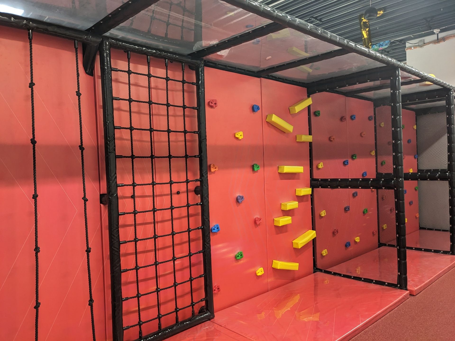 In der Mitte ist die Halle etwas höher, hier ist genau passend das große Klettergerüst eingebaut: