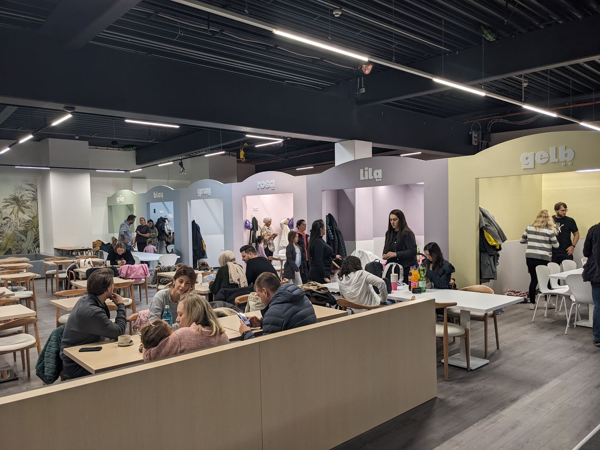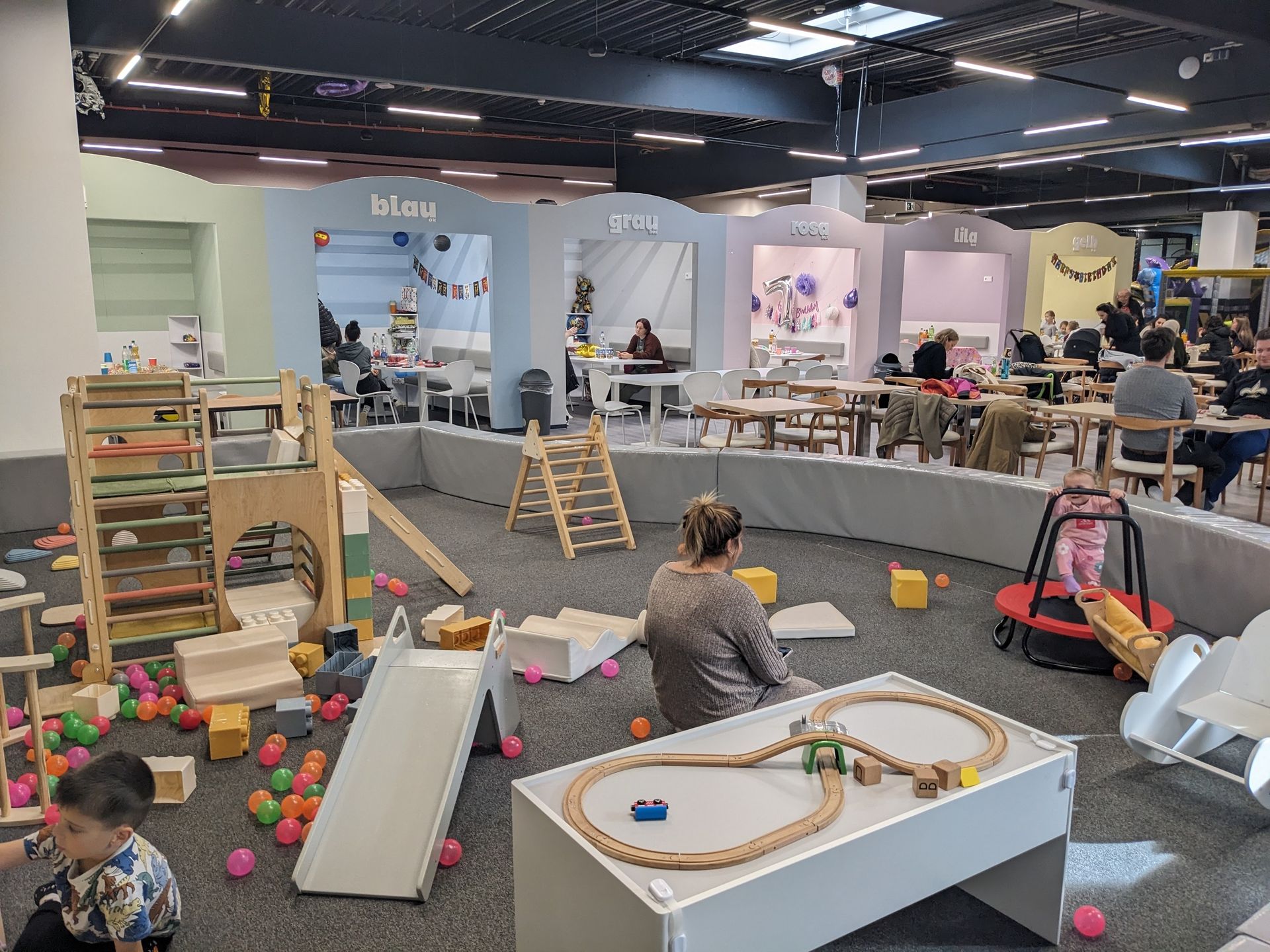 Für die Kleinsten gibt es neben der Gastro einen entsprechenden Bereich. Etwas ungewohnlich in Holz und Pastellfarben: