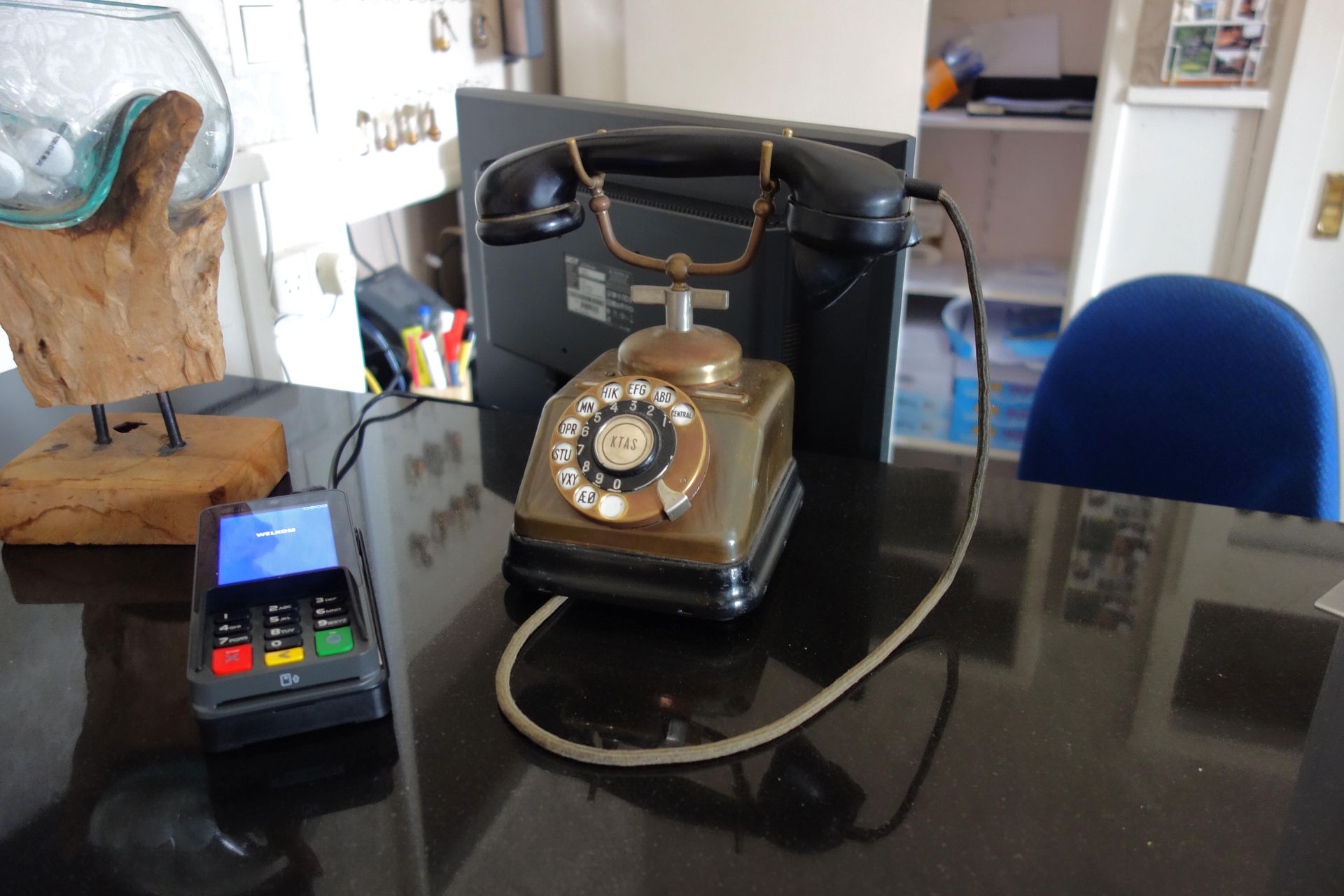 Cool fand ich ja das Wählscheibentelefon als Klingelersatz. Wenn man die 0 wählt, wird das Personal herbeigeklingelt.