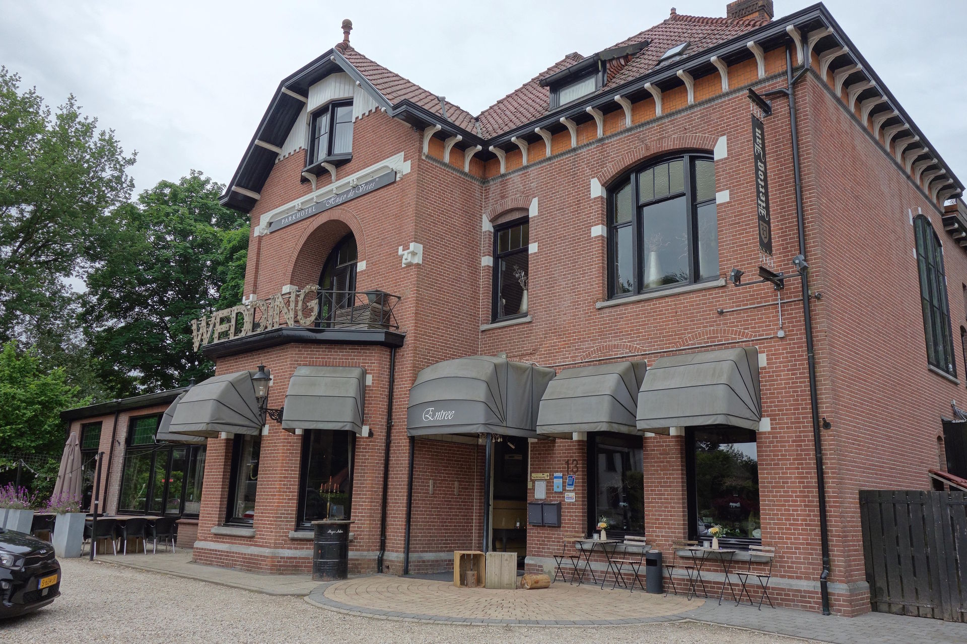 Die Jugenstilvilla war 1904 als Villa De Boeckhorst erbaut worden. Im Jahr 1918 kaufte der Botaniker Hugo de Vries das Anwesen, um dort seinen Ruhestand zu verbringen und seine Forschungen mit der Nachtkerze fortzusetzen. De Vries, der auch einige Studien in Heidelberg und Würzburg durchgeführt hatte, unterhielt gute Beziehungen zum berühmten Evolutionstheoretiker Charles Darwin, war allerdings nicht ganz mit dessen Theorie einer langsamen und schrittweisen Evolution einverstanden. Stattdessen stellte er die Mutationstheorie auf, wonach sich neue Arten durch plötzliche, große genetische Veränderungen - also Mutationen - entwickeln. Grundlage hierfür bildeten die Mendelschen Regeln, deren erste Publizierung durch Gregor Mendel 1865/66 jedoch kaum zur Kenntnis genommen worden und schnell wieder in Vergessenheit geraten waren. Erst um 1900 wurden sie von de Vries (und unabhängig zwei weiteren Wissenschaftlern) wiederentdeckt und bestätigt. Hugo de Vries verstarb 1935. Wann genau seine Villa zum Hotel umgebaut wurde, konnte ich leider nicht herausfinden, aber das Gemeindearchiv lieferte immerhin ein online einsehbares Bild, datiert auf das Jahr 1960, welches die Villa mitsamt des Restaurant-Anbaus zur Linken zeigt. Das heutige Parkhotel Hugo de Vries - mit Fokus auf Hochzeitsfeiern - wurde gemäß Linkedin-Profil dann 1986 eröffnet.