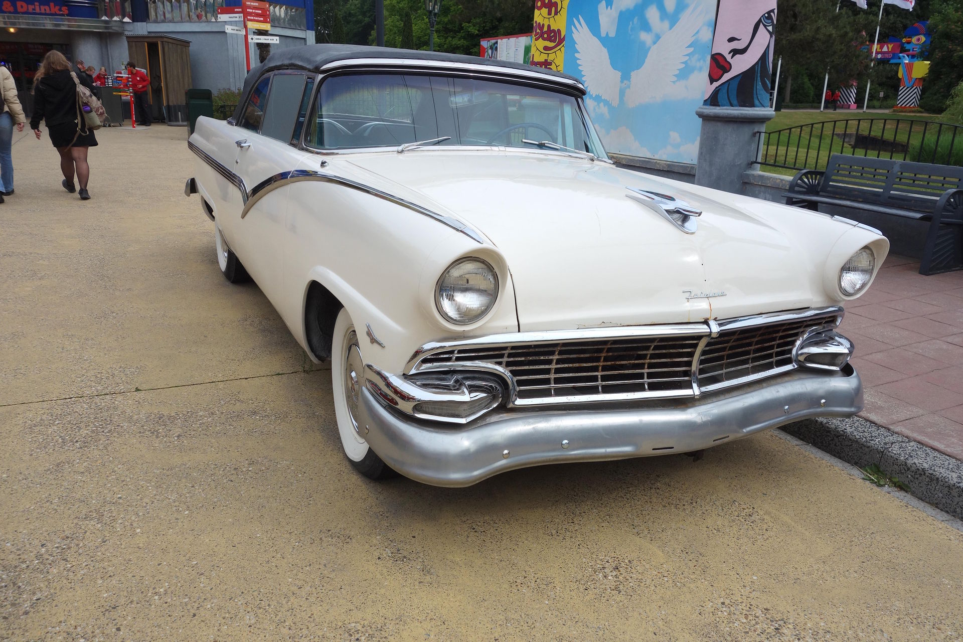 Der am "Straßenrand" parkende 1956er Ford Fairlane im eleganten Weiß bildet einen gelungenen Kontrast zu den poppig bunten Fassaden.