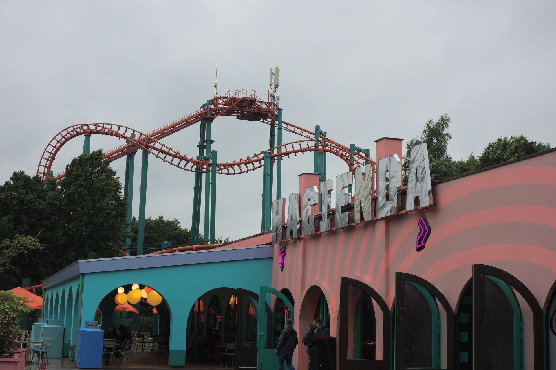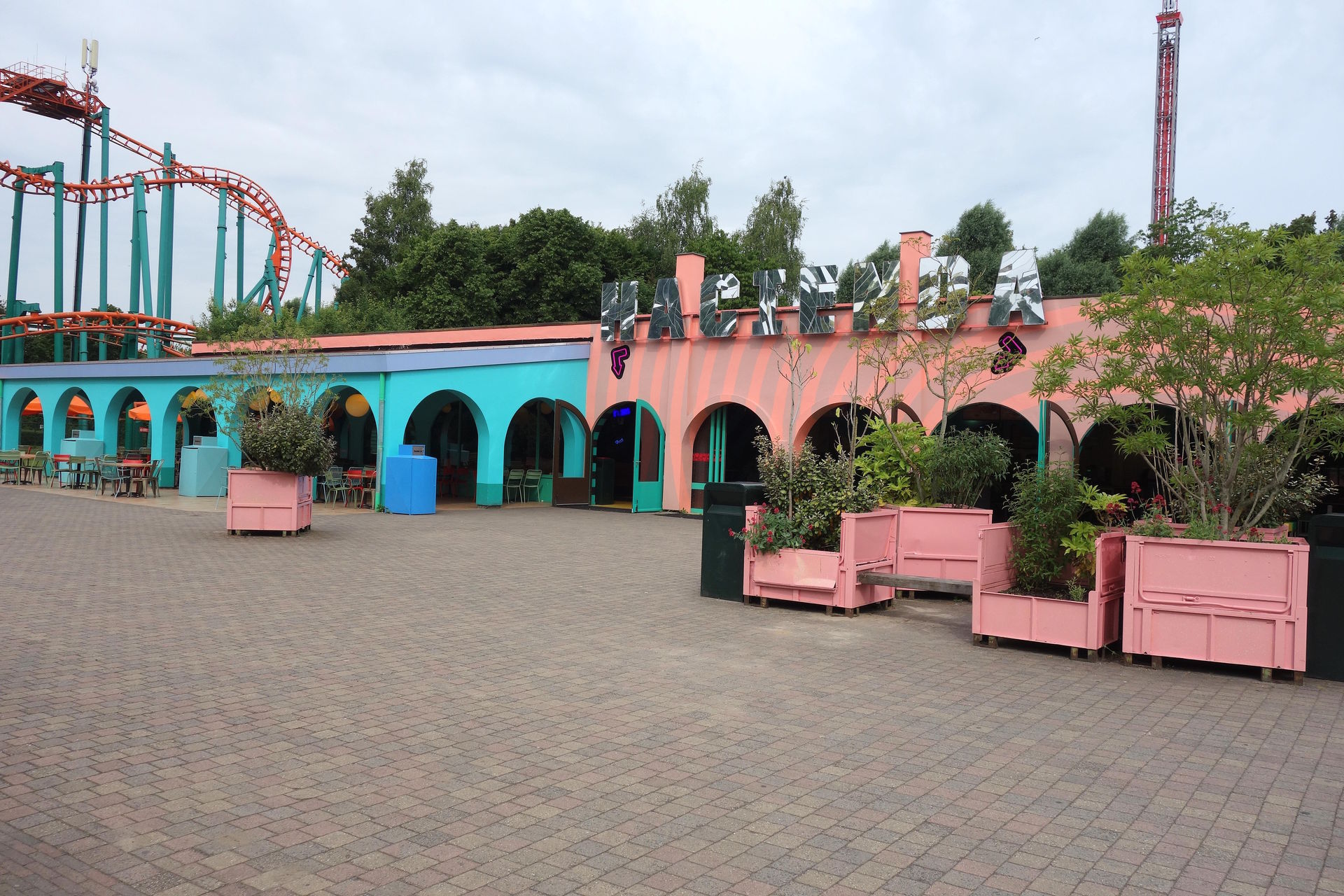 Im Jahr 2012 wurde hier (bzw. hinter den Bäumen in einem neuen "Würfel" links des Bildausschnitts, die zu sehende Fassade bildete nur den Eingang) mit Club Psyke ein 5D-Kino eröffnet, das jedoch nur eine recht kurze Lebensdauer hatte. Nachdem 2016 schon die Halloween-Maze The Clinic im Eingangsgebäude eingerichtet worden war, folgte im Jahr darauf mit NeuroGen ein einzigartiges VR-Horror-Erlebnis anstelle des eigentlichen 5D-Kinos. Basierend auf dem Clinic-Maze wurden die Besucher hier einzeln zu ihrer Behandlung geführt. Diese fand ausgestattet mit einer VR-Brille auf einem SFX Motion-Seat statt. Hätte ich tatsächlich gerne mal ausprobiert, allerdings machte Corona der Praxis den Garaus. Während die VR-Attraktion 2020 und 2021 wegen der Hygiene-Auflagen geschlossen bleiben musste, wurde 2022 bekannt gegeben, dass NeuroGen durch ein weiteres Halloween-Maze ersetzt wird, nämlich Slaughterhouse. Dort wird man quasi am Fleischerhaken hängend durchs Schlachthaus gezogen. Klingt auch interessant, brachte uns außerhalb der Halloween-Zeit jedoch leider nichts.