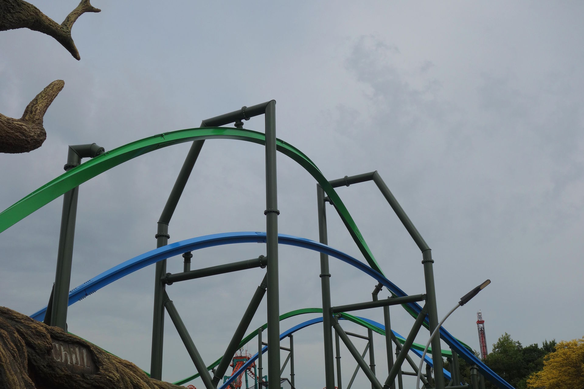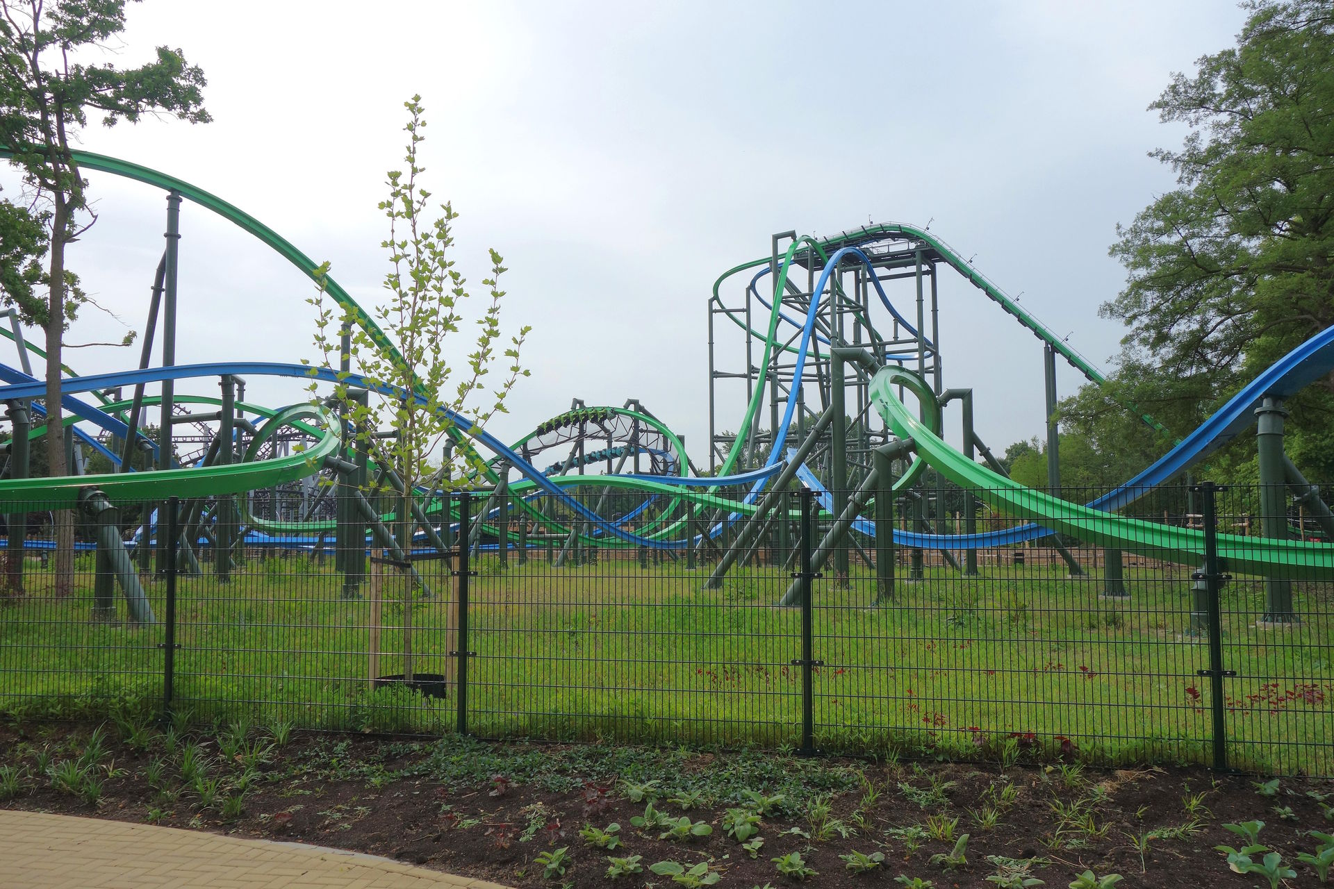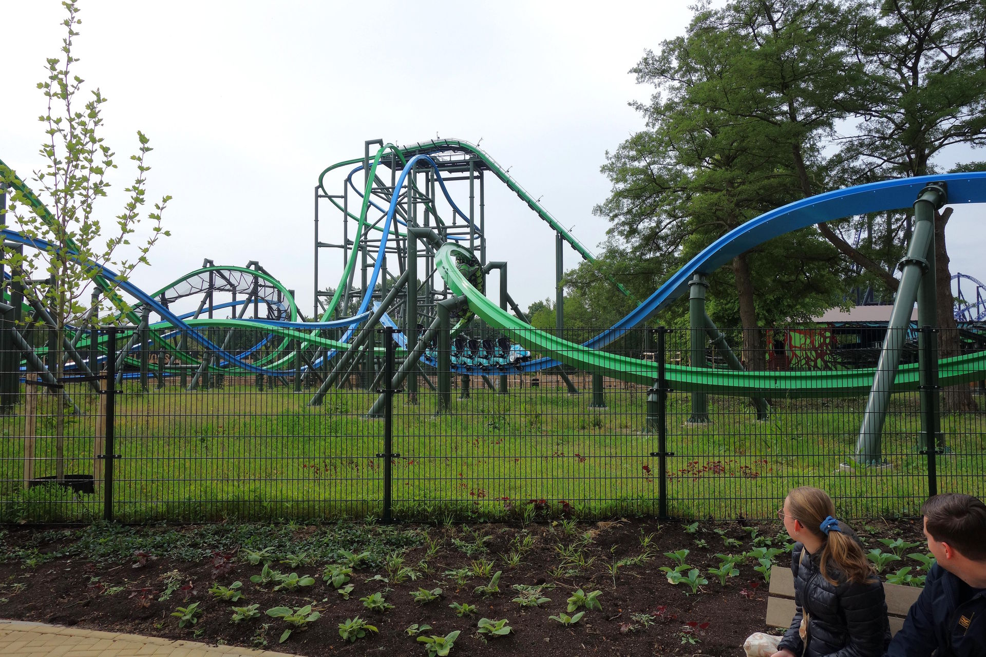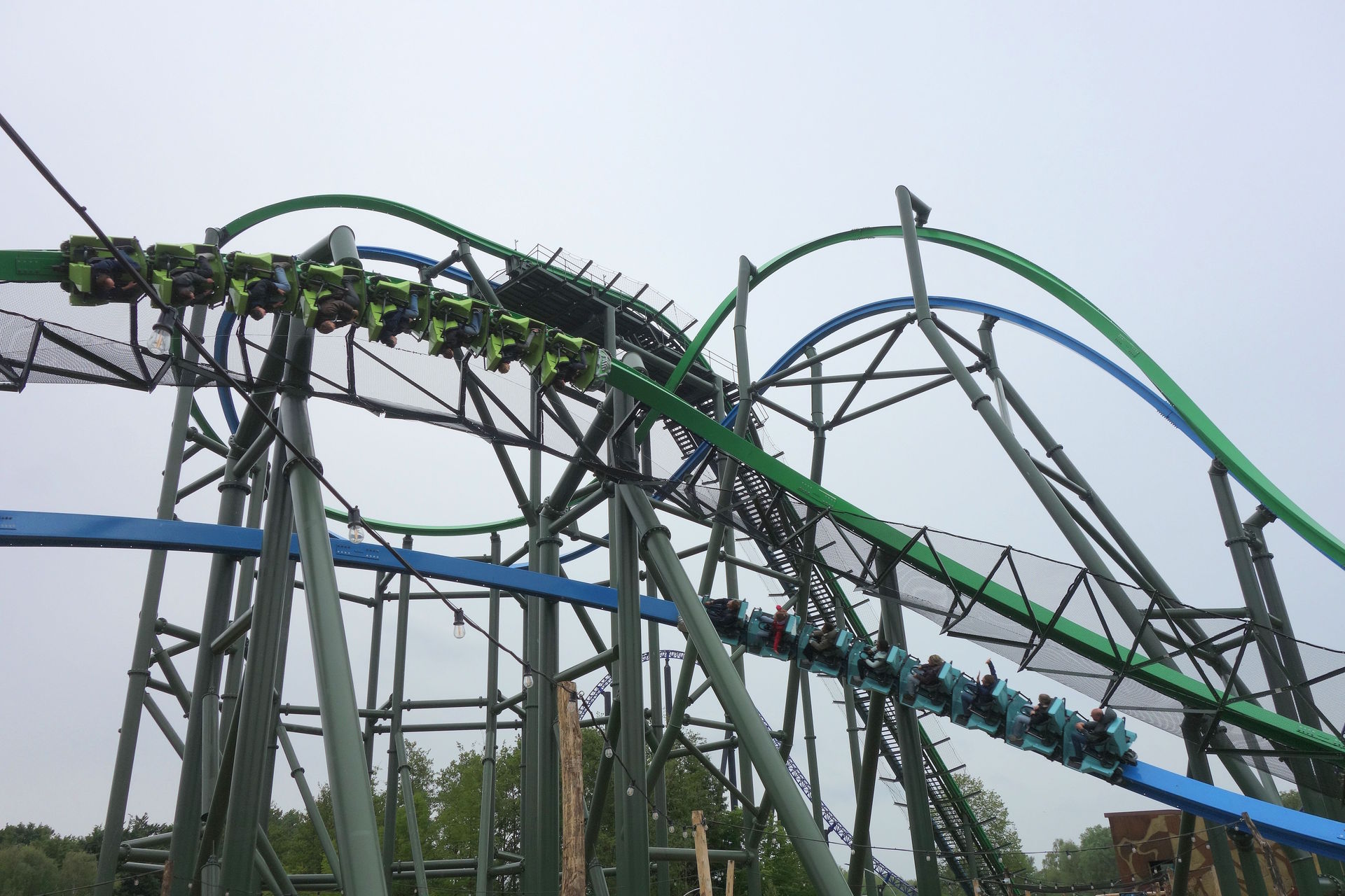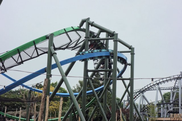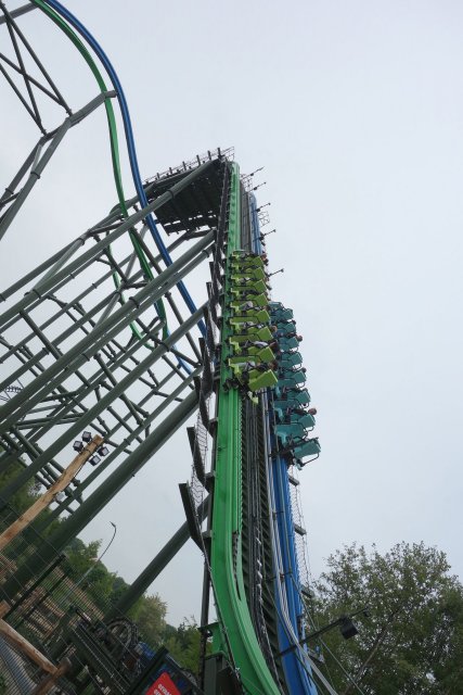 Inversion der Thrill-Seite darstellt. Bei rcdb ist diese Wende als Cutback gelistet, dafür kommt mir das Element aber zu flach und zu weit vor. Blau vollführt unterdessen nach dem Airtimehügel einen Schwenk nach rechts, ehe es mit vielleicht 90° linksherum und knapp unter der grünen Spur durch die Wende geht. Leider stört das Netz hier ziemlich den Dueling-Effekt. Im weiteren Verlauf unterscheiden sich die Layouts der beiden Bahnen deutlich. Thrill absolviert eine Rolle (bzw.