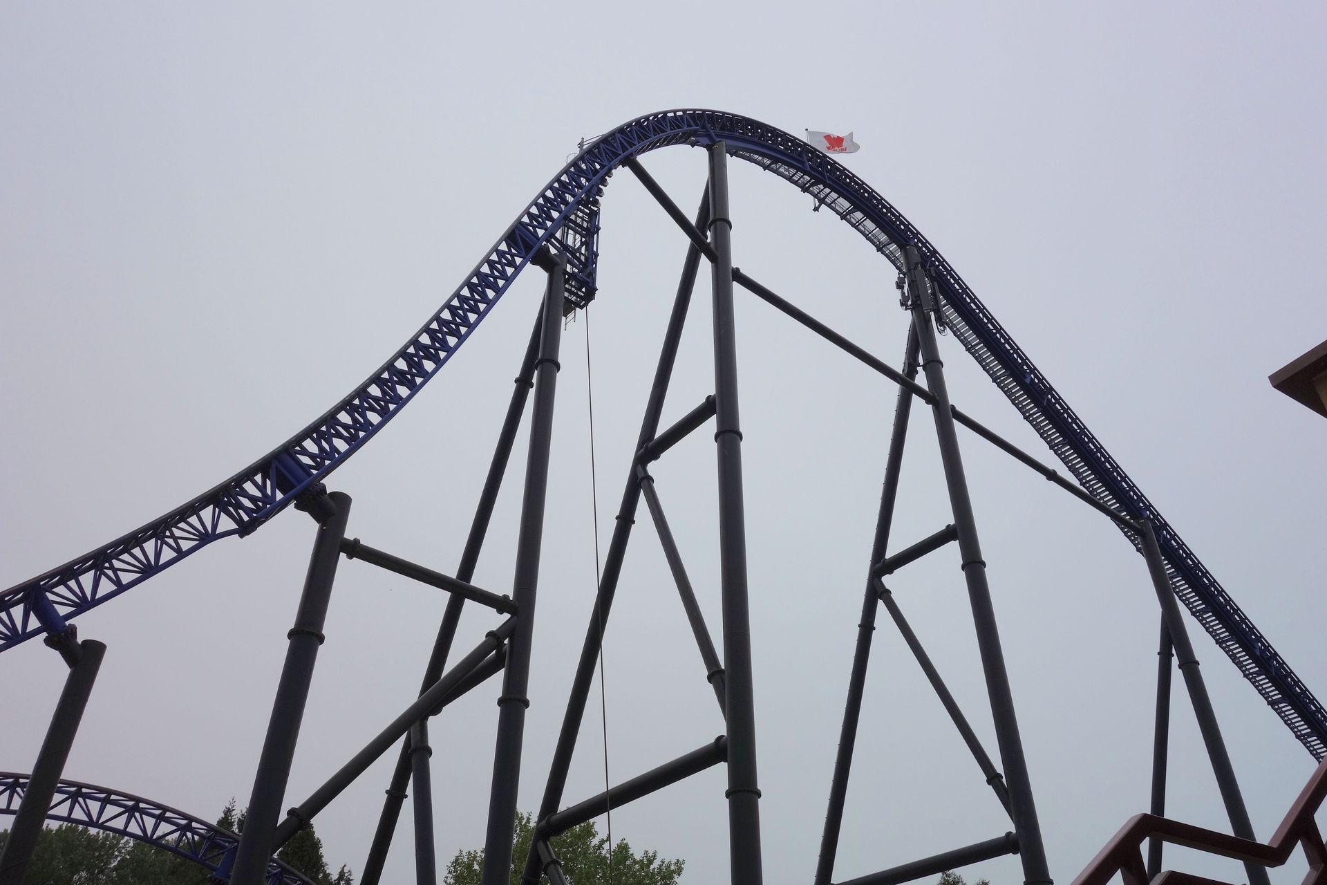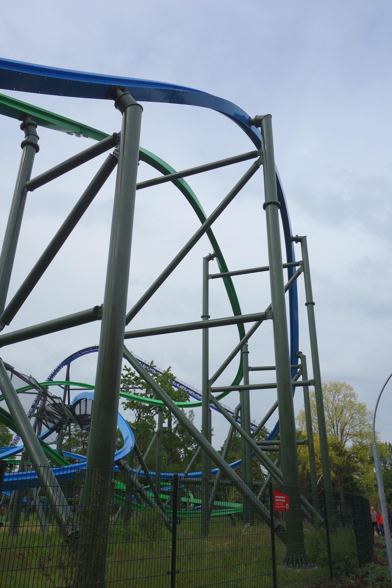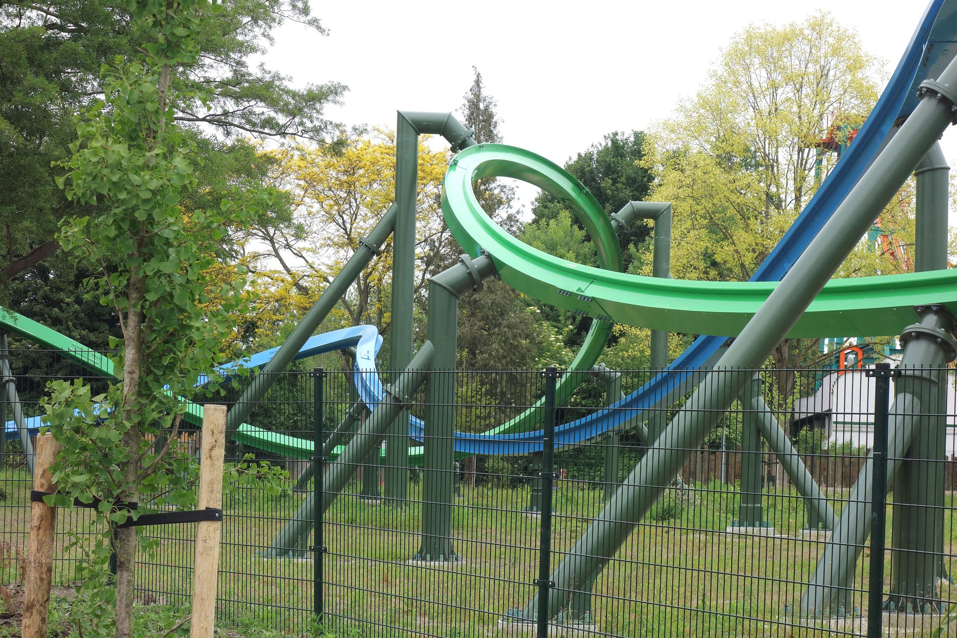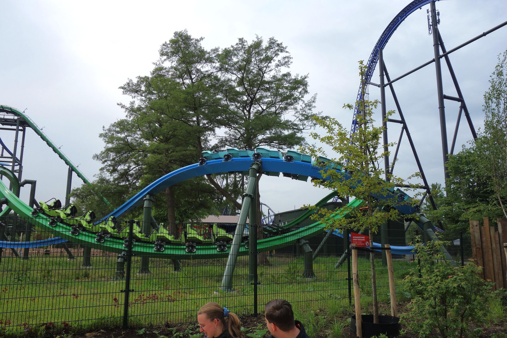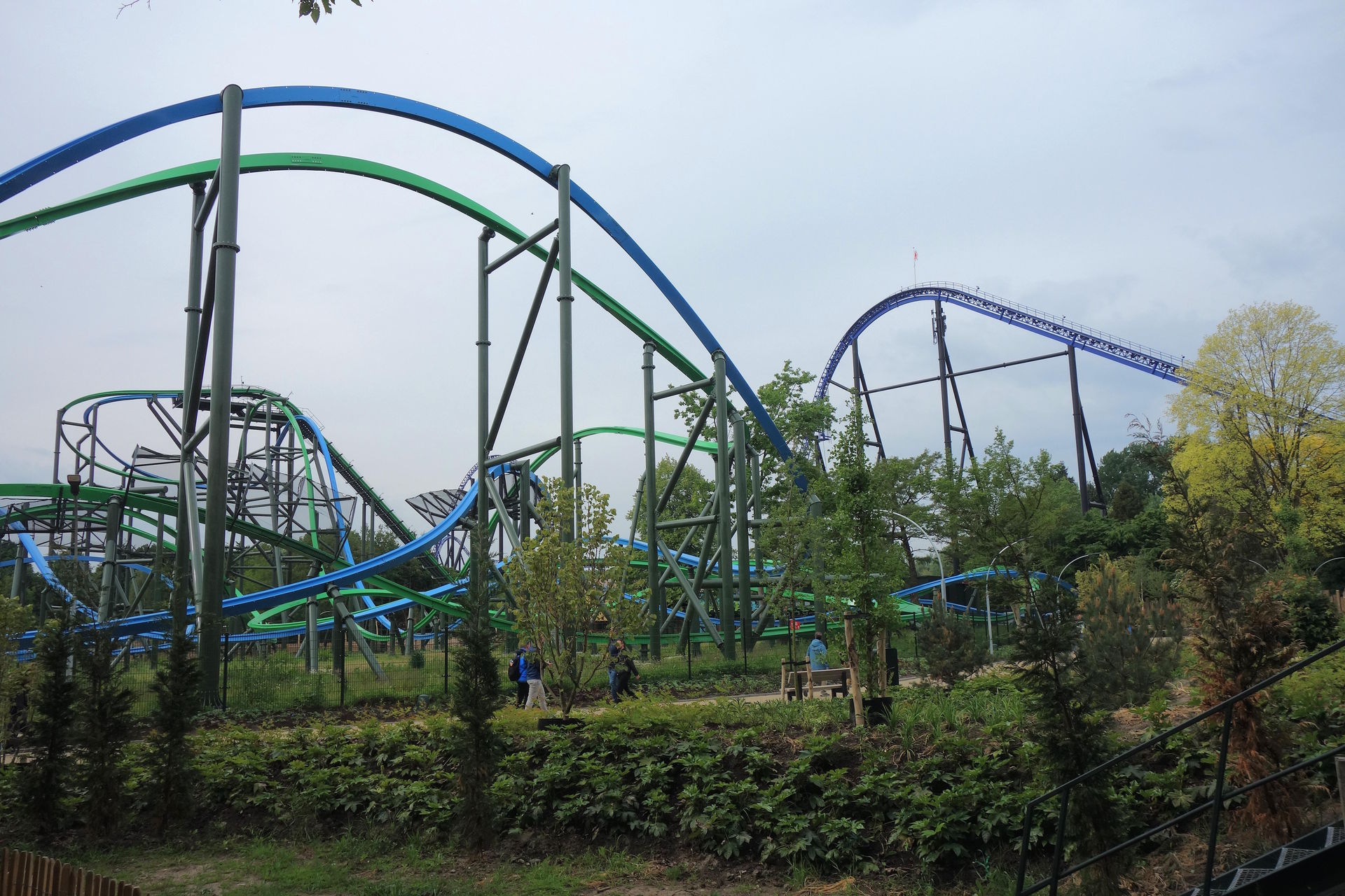 Inversion der Thrill-Seite darstellt. Bei rcdb ist diese Wende als Cutback gelistet, dafür kommt mir das Element aber zu flach und zu weit vor. Blau vollführt unterdessen nach dem Airtimehügel einen Schwenk nach rechts, ehe es mit vielleicht 90° linksherum und knapp unter der grünen Spur durch die Wende geht. Leider stört das Netz hier ziemlich den Dueling-Effekt. Im weiteren Verlauf unterscheiden sich die Layouts der beiden Bahnen deutlich. Thrill absolviert eine Rolle (bzw.