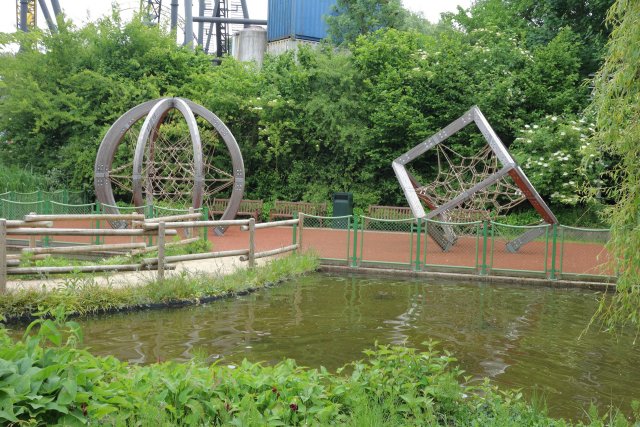 Das einstige Fundament der 2016 geschlossenen Schiffschaukel im angrenzenden Teich wurde 2022 ebenfalls mit Klettergebilden bestückt.