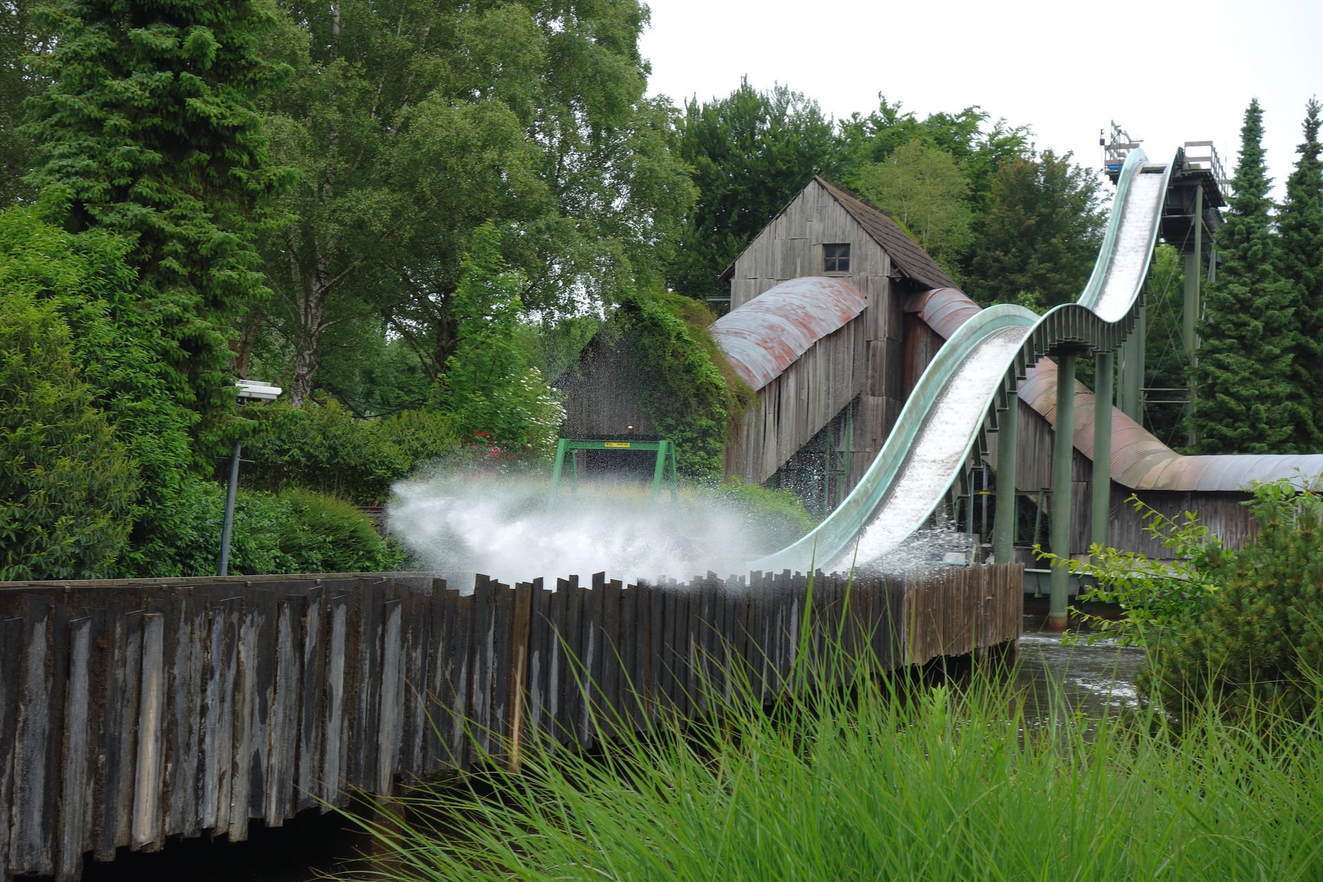 Gleich gegenüber erhebt sich die 524 Meter lange und 13 Meter hohe Wildwasserbahn Crazy River mit gleich 3 Schussfahrten.