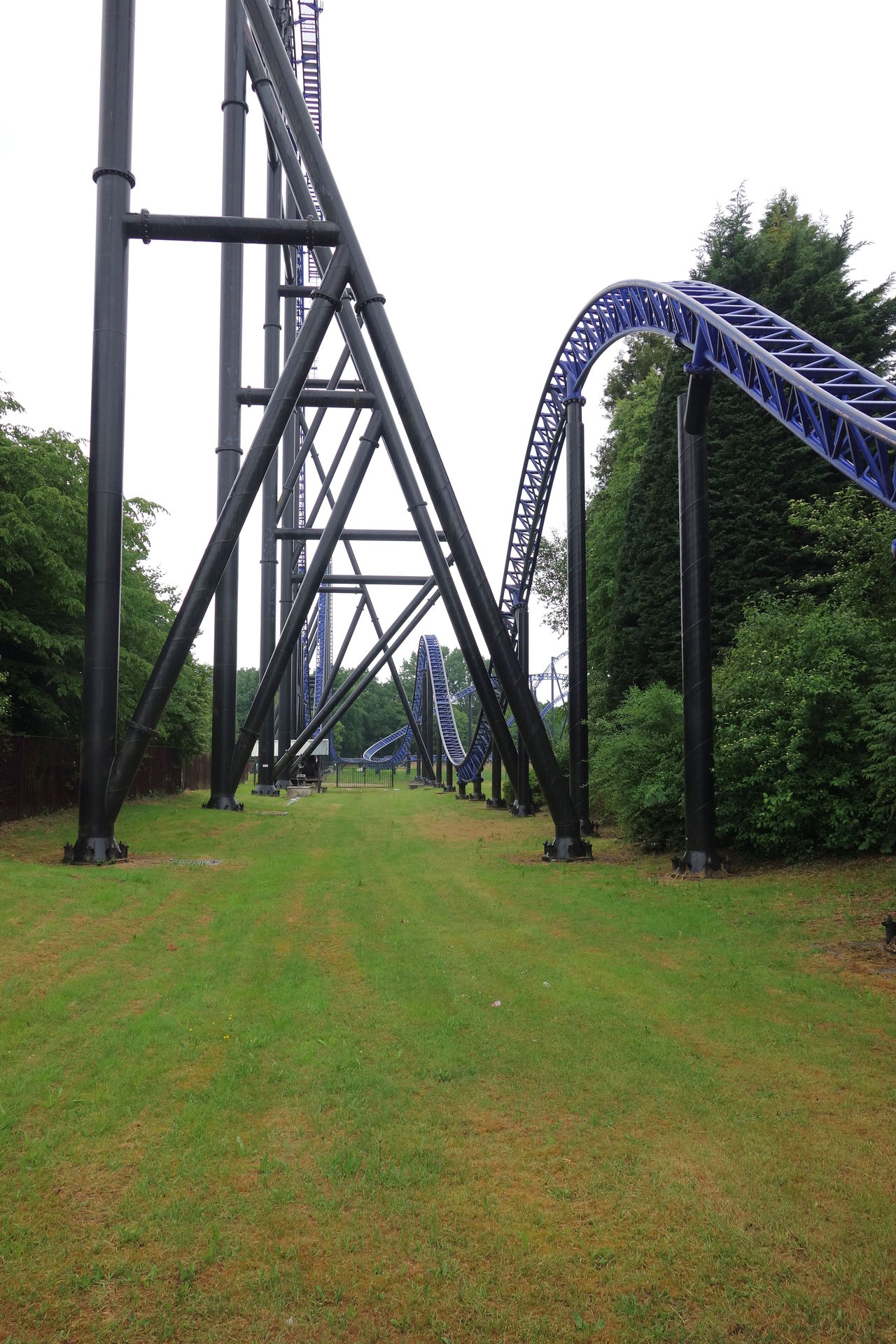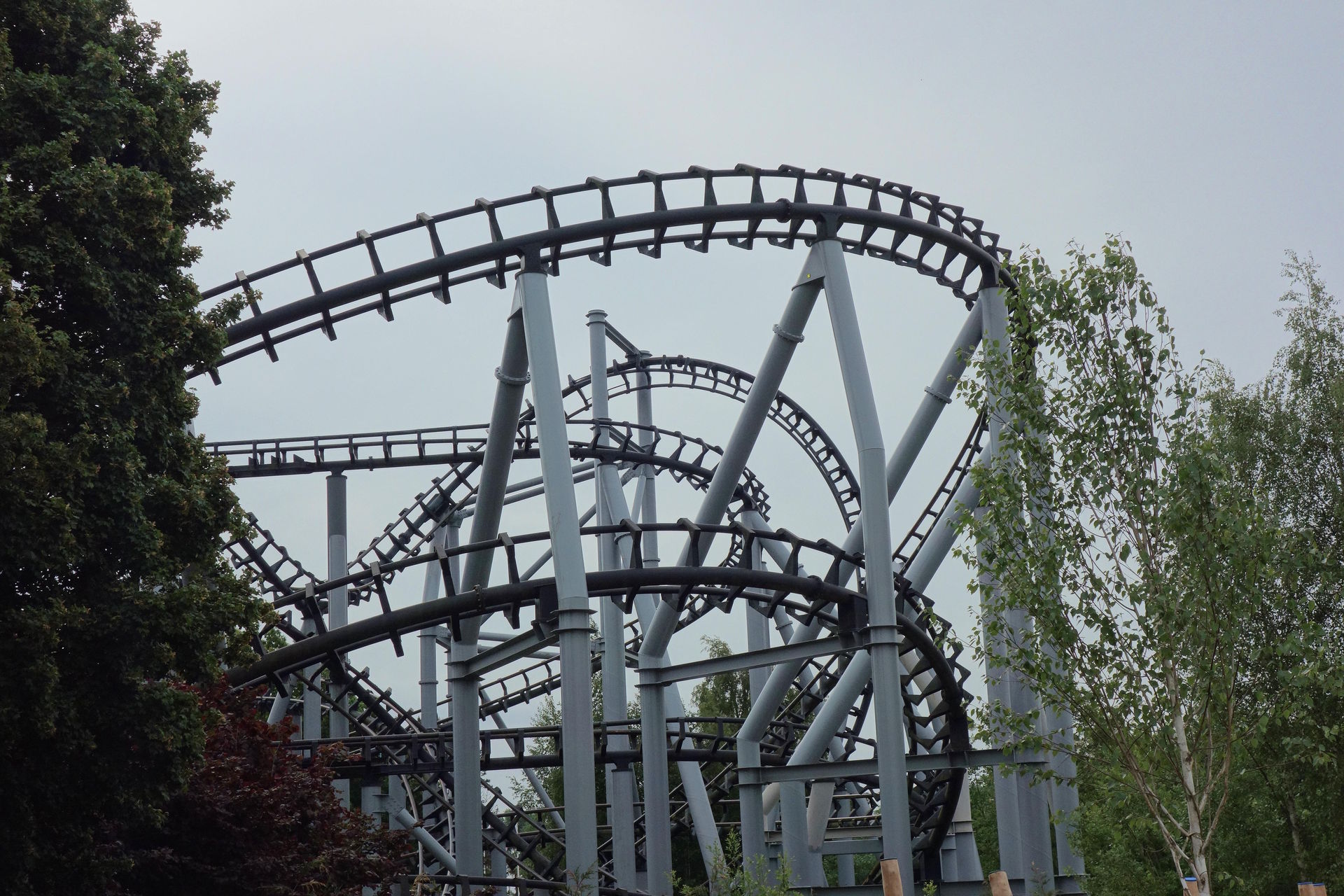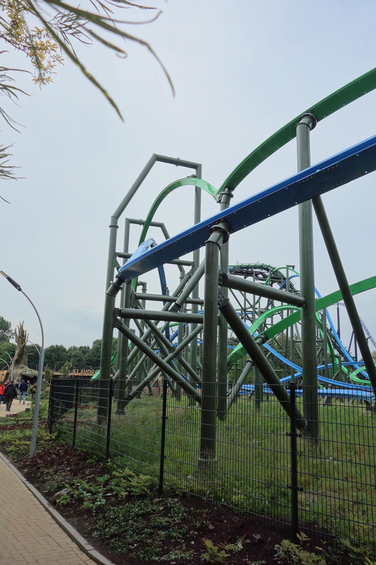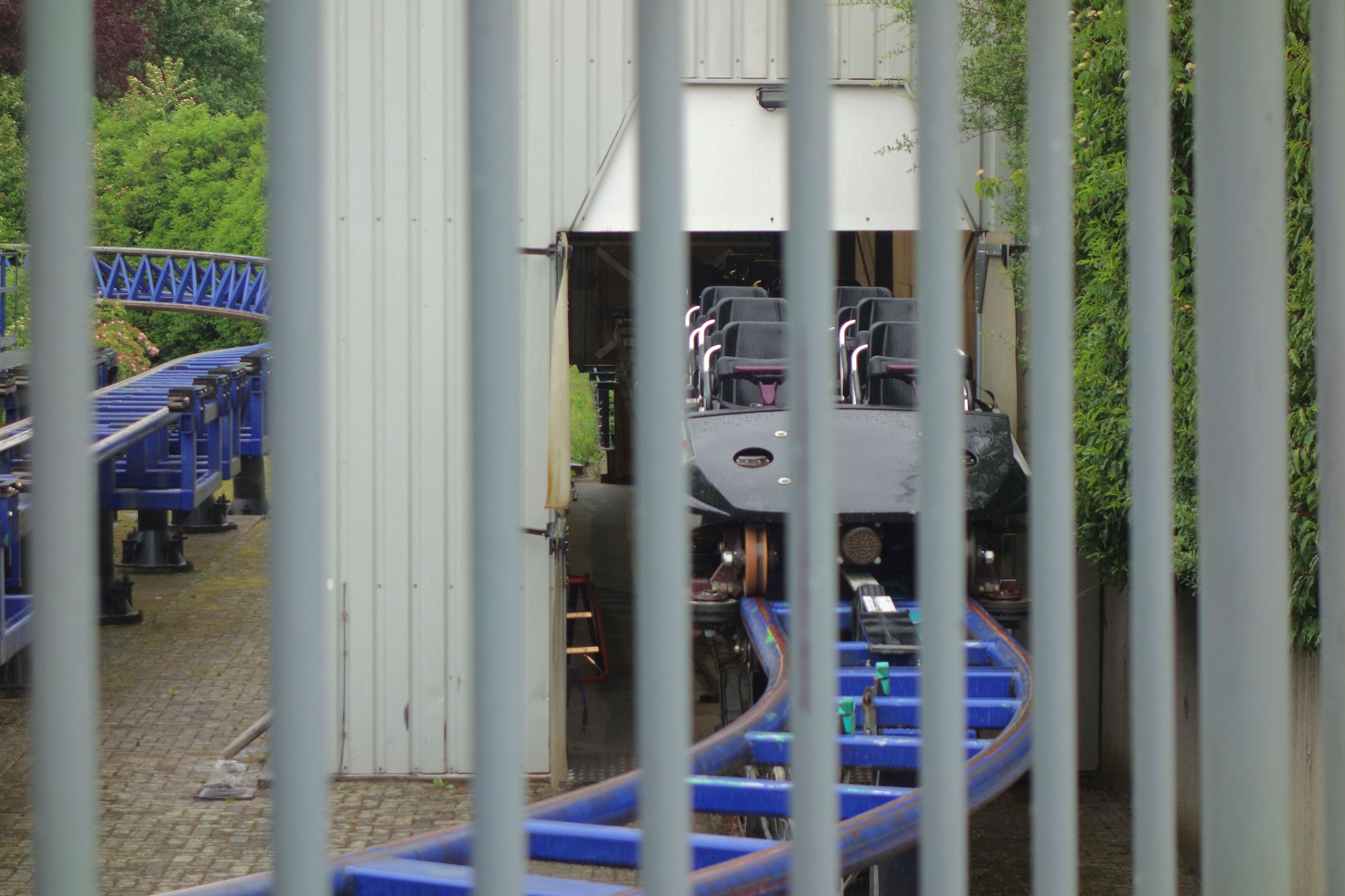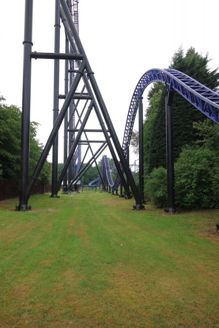 Und auch die neue Farbgebung wirkt durchaus edel - die wurde allerdings auch schon früher eingeführt. Als die damals höchste und schnellste Achterbahn in BeNeLux 2002 eröffnet wurde, hatte man sich wohl am ursprünglich angedachten Farbschema von Xpress orientiert. Die Schienen waren grün und die Stützen lila. Just vor meinem Erstbesuch 2014 war das ausgeblichene Lila der Stützen leider einem langweiligen Schwarz gewichen. Auch der lilane Zug war schwarz lackiert worden. Die Zäune und auch die Sitze der Züge blieben allerdings lila und passten nun natürlich gar nicht mehr zum Rest der Bahn. Anlässlich des 15. Geburtstags von Goliath wurden zur Saison 2017 dann auch die Schienen neu lackiert - in einem dunklen Blau. Gleichzeitig wurde auch der zweite Zug - vorher grün - in schwarz umgefärbt. Inzwischen erinnern nur noch einige lila Akzente in den Zügen an das ikonische Farbkleid, das ich leider nie in Gänze erleben konnte. Aber die frische Farbe steht der Bahn eben auch sehr gut und ist allemal besser als das Kuddelmuddel mit verblasst-grünen Schienen auf frisch glänzenden schwarzen Stützen und den ganzen lila Resten rundherum.
