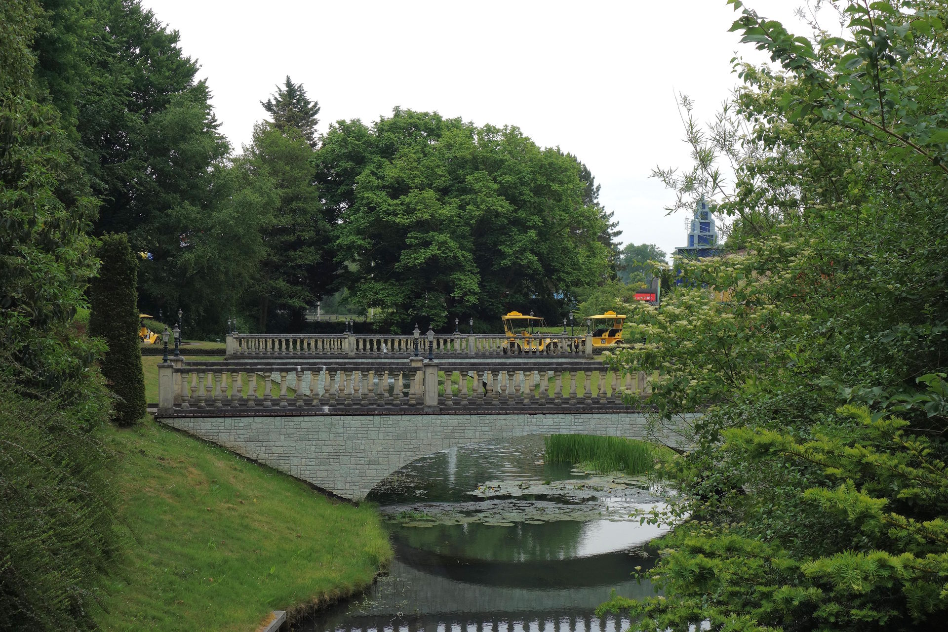 Der Family Run durfte hier übrigens wieder abkürzen und geradewegs zum Parkeingang laufen, um schließlich über die Main Street ins Ziel zu laufen. Uns fehlten aber trotz der bisherigen Umwege noch über anderthalb Kilometer, um am Ende auf die Versprochenen 5 Kilometer zu kommen. Daher führte unsere Route nach dem Parkplatz-Zick-Zack quer über den Vorplatz des Parks und mit Querung des Wassergrabens (natürlich über eine Brücke) in den zum Park gehörenden Ferienpark Walibi Village, den wir quasi einmal umrundeten.