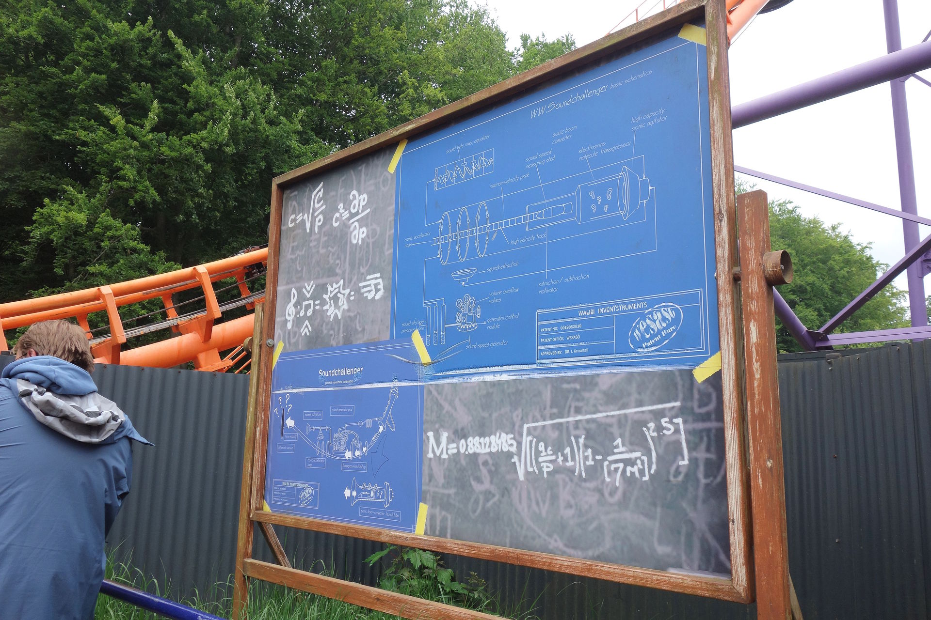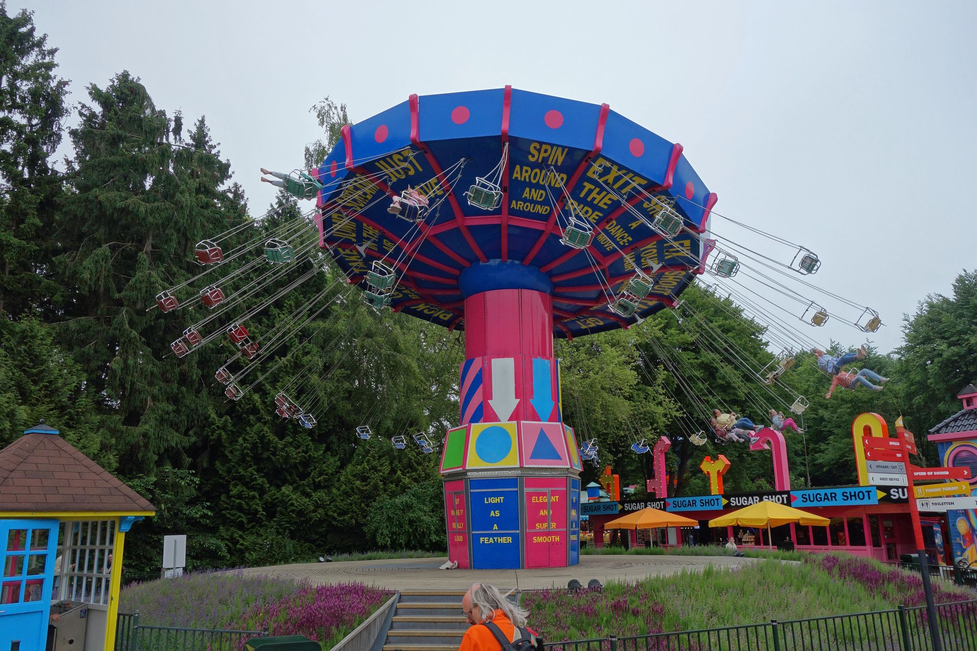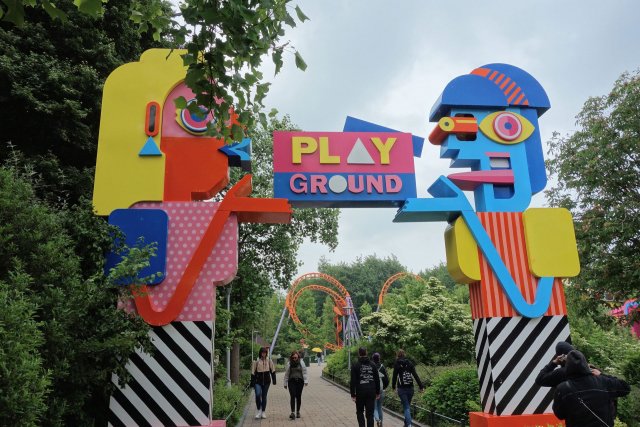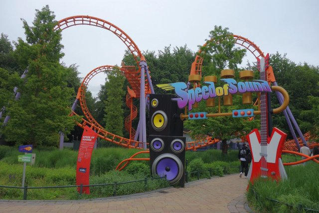 Aber der Nachfolger dreht munter seine Runden und hatte im Laufe des Tages erwartungsgemäß noch eine Schippe draufgelegt. Gegen 14 Uhr begaben wir uns am Riesenrad vorbei nach vorne zum Themenbereich Play Ground rund um Speed of Sound. Das ursprünglich italienische Flair des Themenbereichs war mit der Neugestaltung des Boomerangs 2011 einem musikalischen Thema gewichen. Das damalige Konzept bestand aus den konkurrierenden Bands W.A.B (Walibi Adventure Band) rund um Walibi und SkunX mit Walibis bösem Zwillingsbruder Squad, die in den Walibi-Parks um die Gunst der Besucher buhlten. So richtig zünden konnte das Music Battle aber wohl nicht, sodass die Bezüge zu den beiden Bands nach nur wenigen Jahren langsam aber sicher aus den Parks verschwanden und Walibi inzwischen wieder solo unterwegs ist. Seit 2018 wurde der Park nun abermals Themenbereich für Themenbereich überarbeitet. Das neue Konzept nennt sich wie schon erwähnt Festivalization. Für mich persönlich hatte das Musik-Thema ehrlicherweise deutlich mehr Potential, das aktuelle Thema ist in weiten Teilen doch eher nichtssagend. Aus dem W.A.B. Plaza wurde so nun eben der knallbunte Play Ground. Bei Speed of Sound blieb es glücklicherweise bei einem neuen Song für die Fahrtuntermalung.
